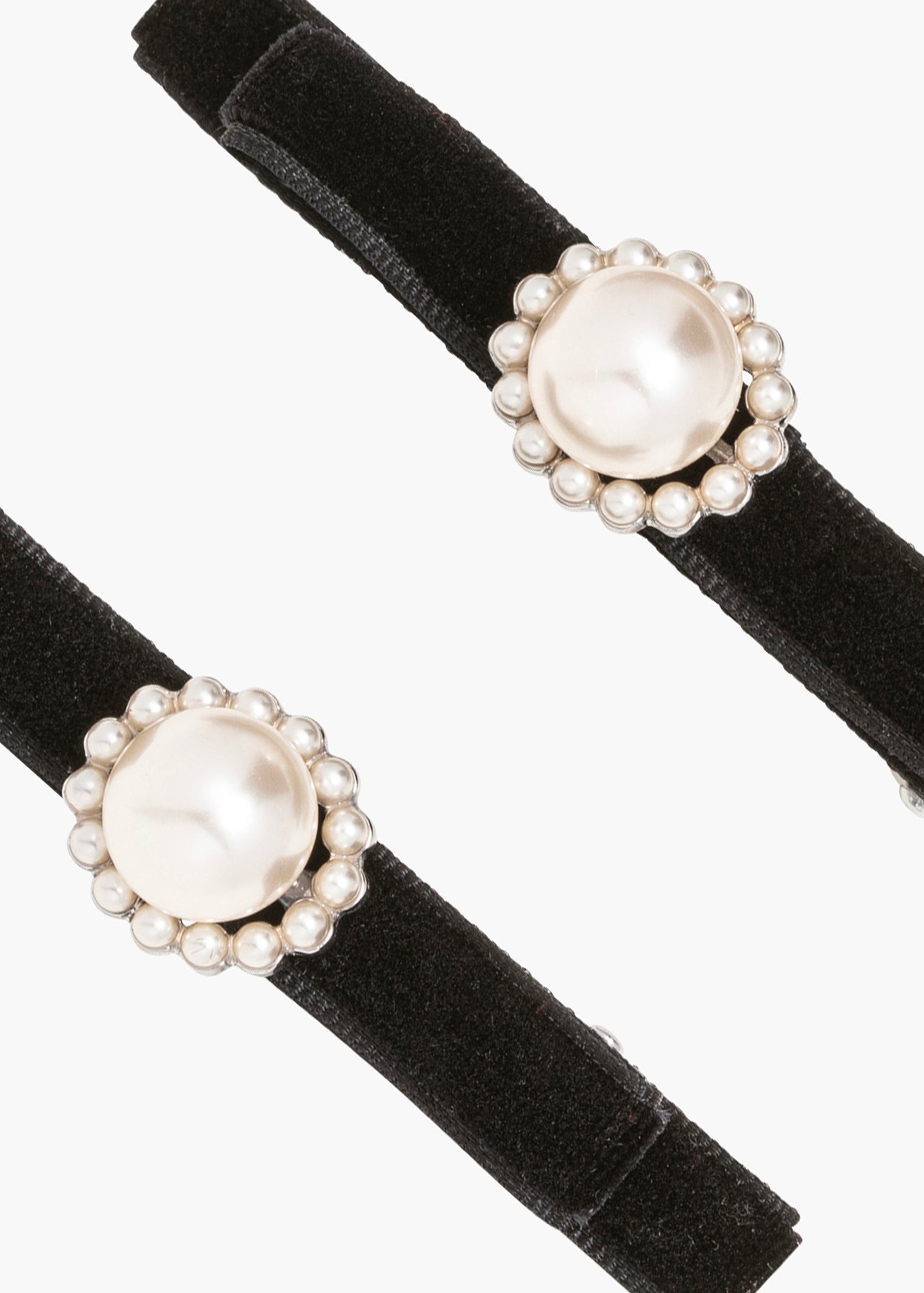 Deceptively simple, yet utterly transformative, the Minetta Bow Clips instantly elevate an entire look. Made by hand in New York, the velvet ribbon is neatly draped into elongated bows, and accented with pearl details. An alligator clip base makes this set of two especially easy to place in the hair, in a multitude of styles.