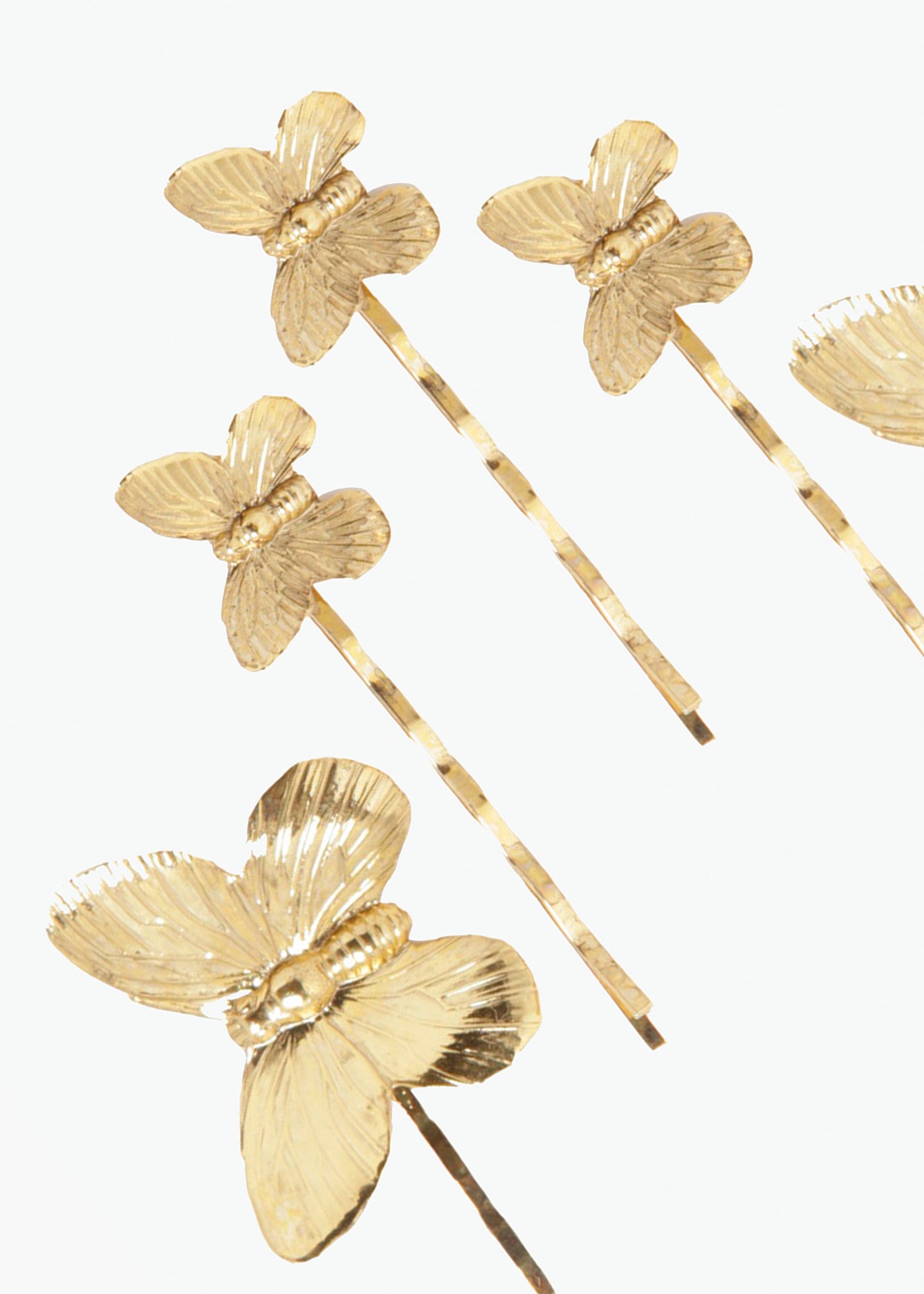 If you've loved our bestselling Mazarine Bobby Pin, the Pippa Bobby Pin Set is the ideal accoutrement. This set of five is comprised of sprightly golden butterflies of different sizes, complete with intricately etched details. We love the versatile Pippa Bobby Pins mixed with the beloved Mazarine Bobby Pin, as well as the classic Perla Bobby Pins.