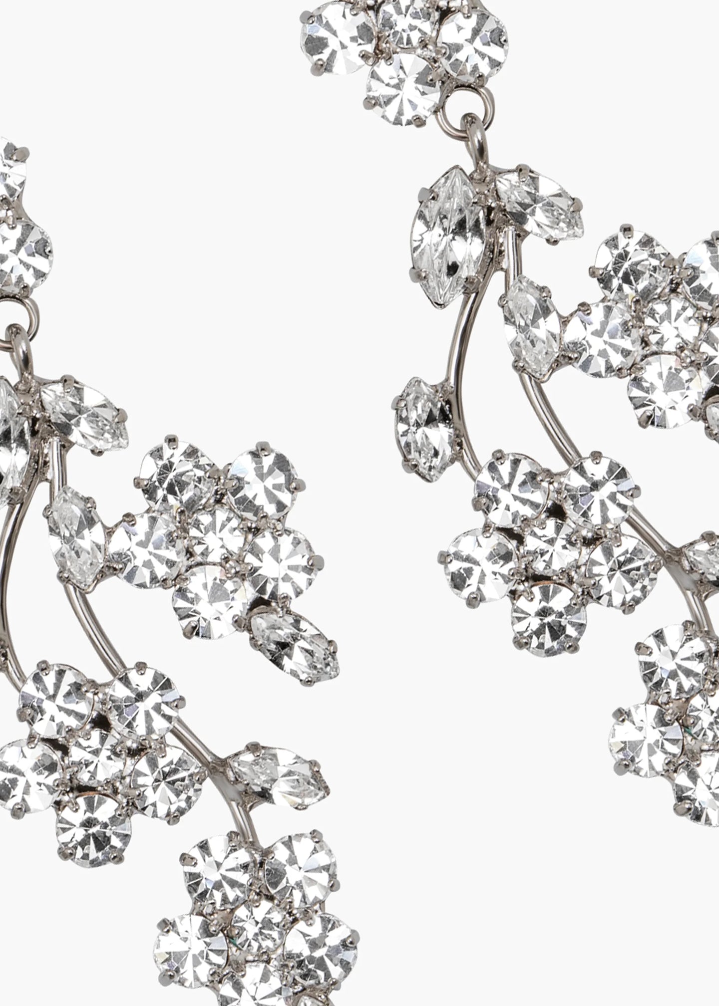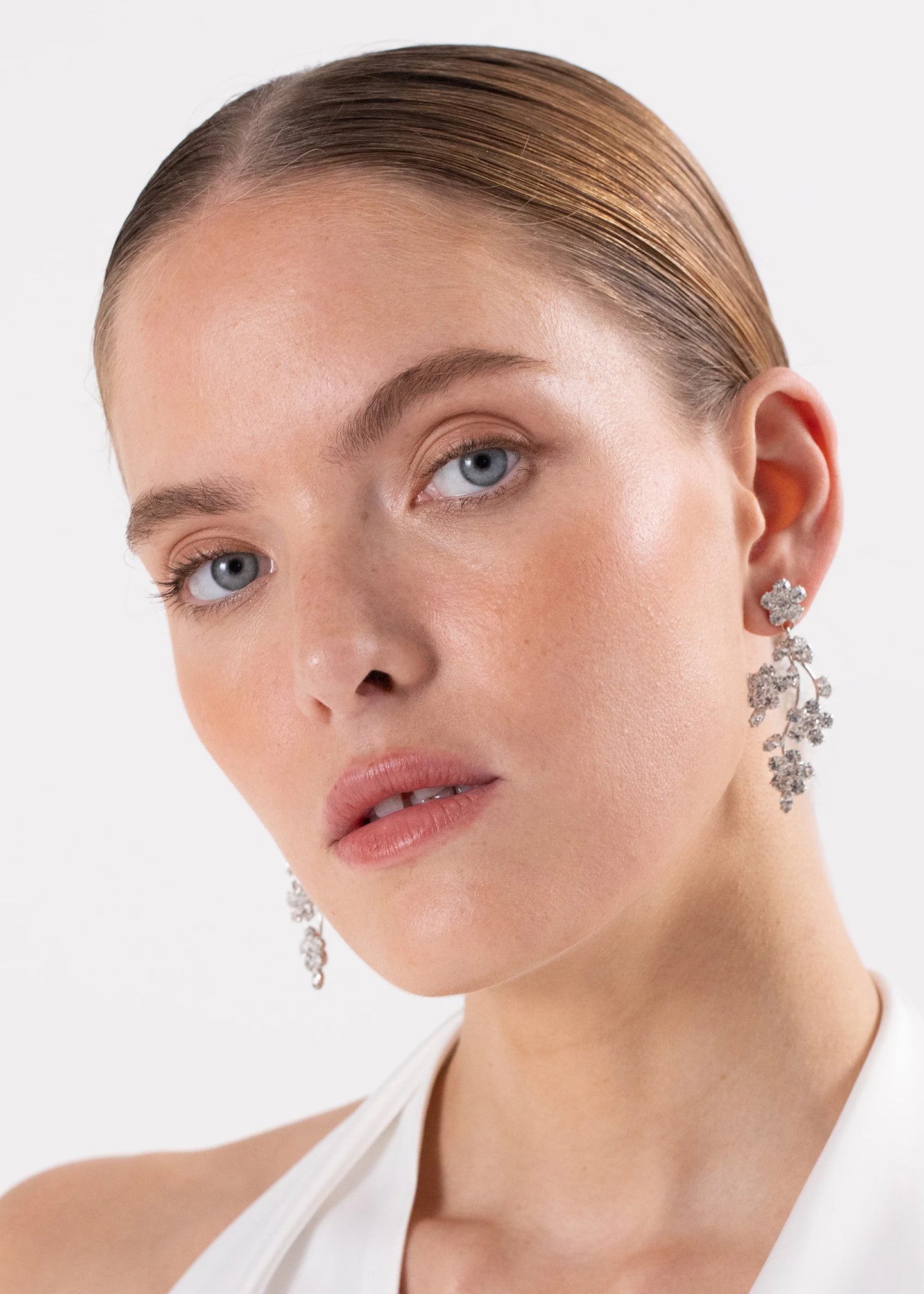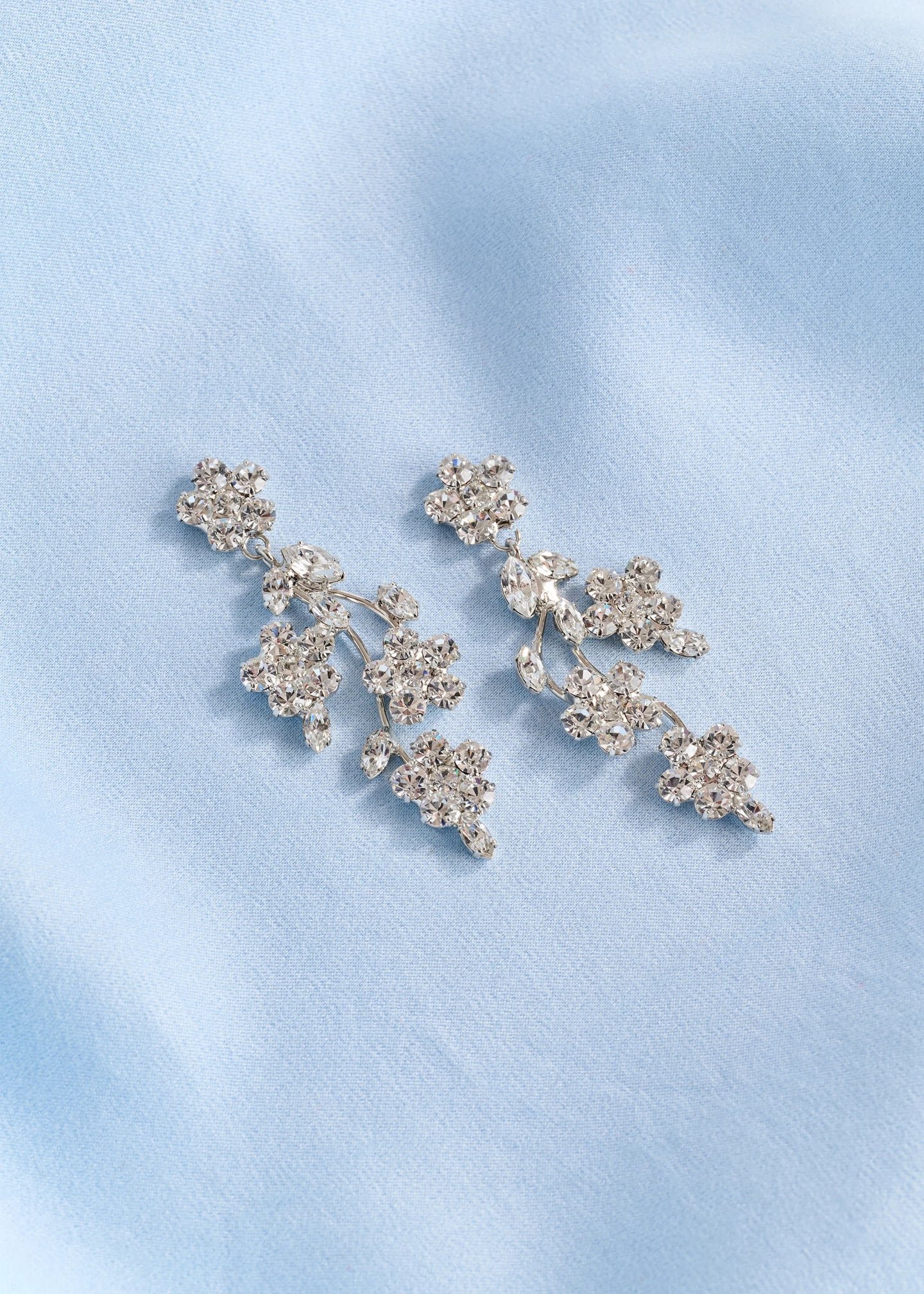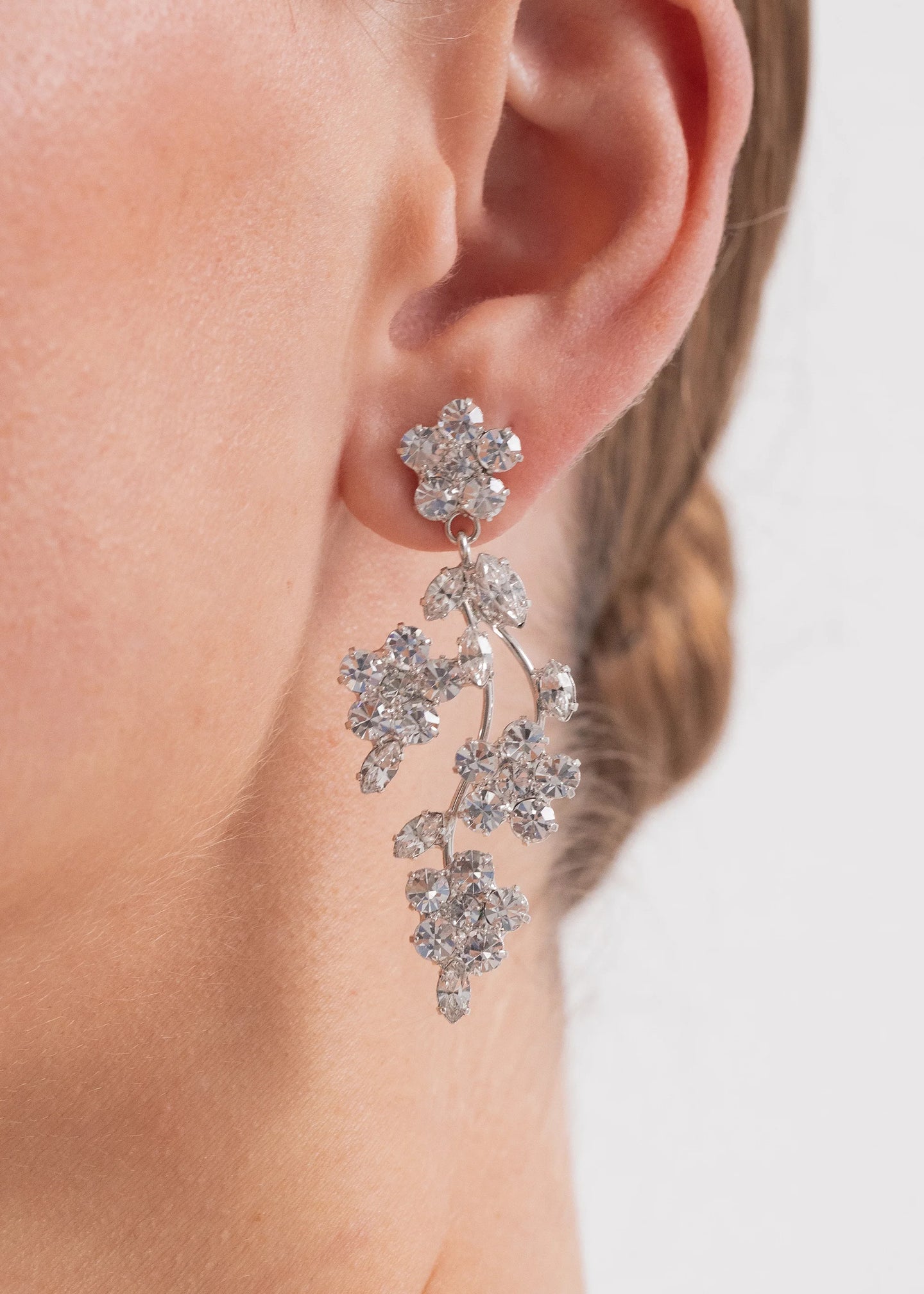 An update on a signature Jennifer Behr style, the Adeline Earrings are designed to delicately frame the face. Made by hand in New York, Austrian crystals in round and marquise cuts come together to form a floral bouquet, in an 18-karat gold or rhodium-plated setting. The branch swings from the ear as one, offering dramatic movement that emphasizes the sparkling quality of the crystals.