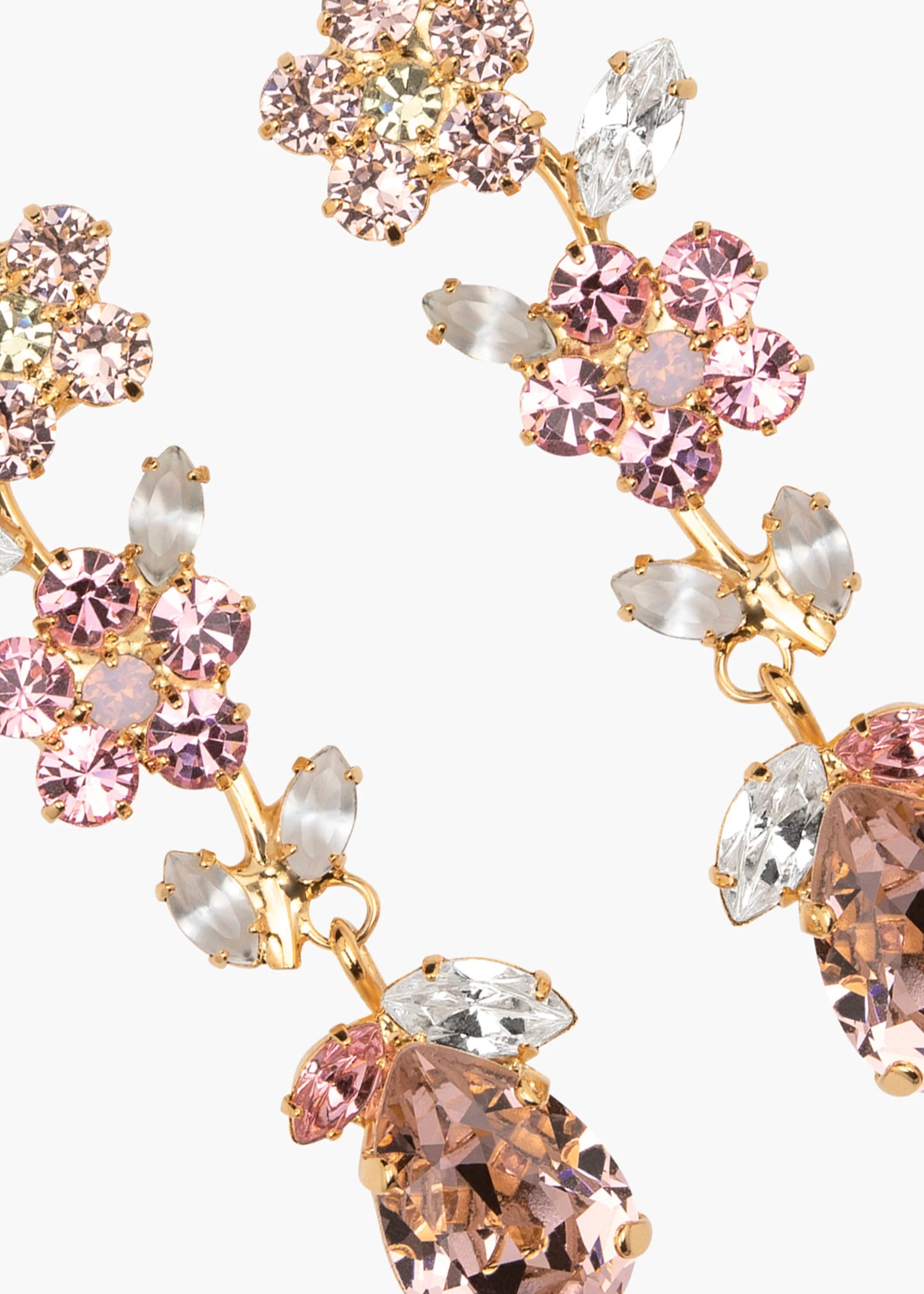 Often considered a reminder of the necessity to appreciate the present moment—due to its fleeting beauty—the beloved cherry blossom is made eternal with the Freesia Earrings. Made by hand in New York, Austrian crystals in a variety of cuts, and different shades of blush, form a monochromatic branch with unrivaled depth and detail. With an 18-karat gold-plated setting, the leaves have an opalescent quality that brings the floral motif to life.