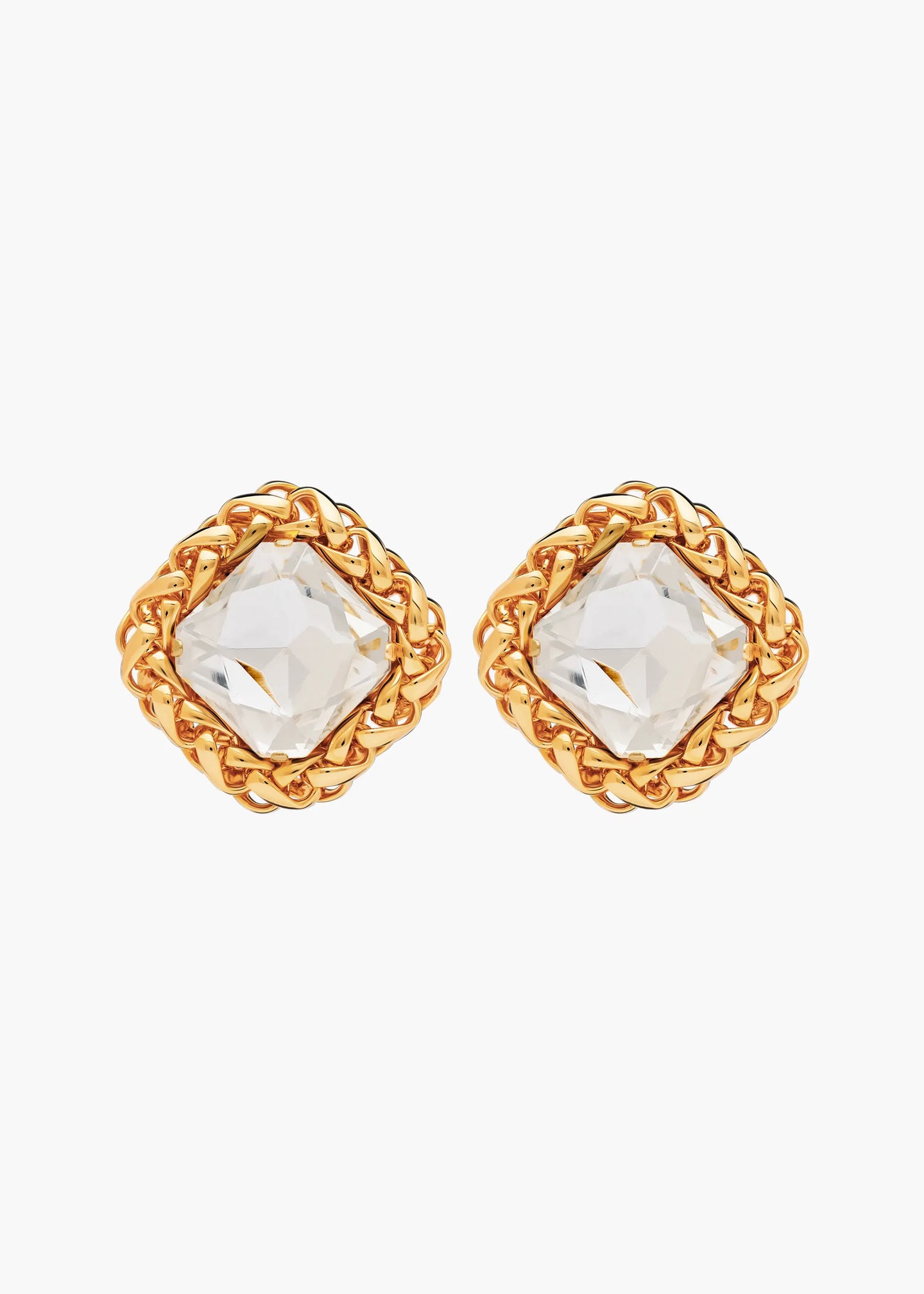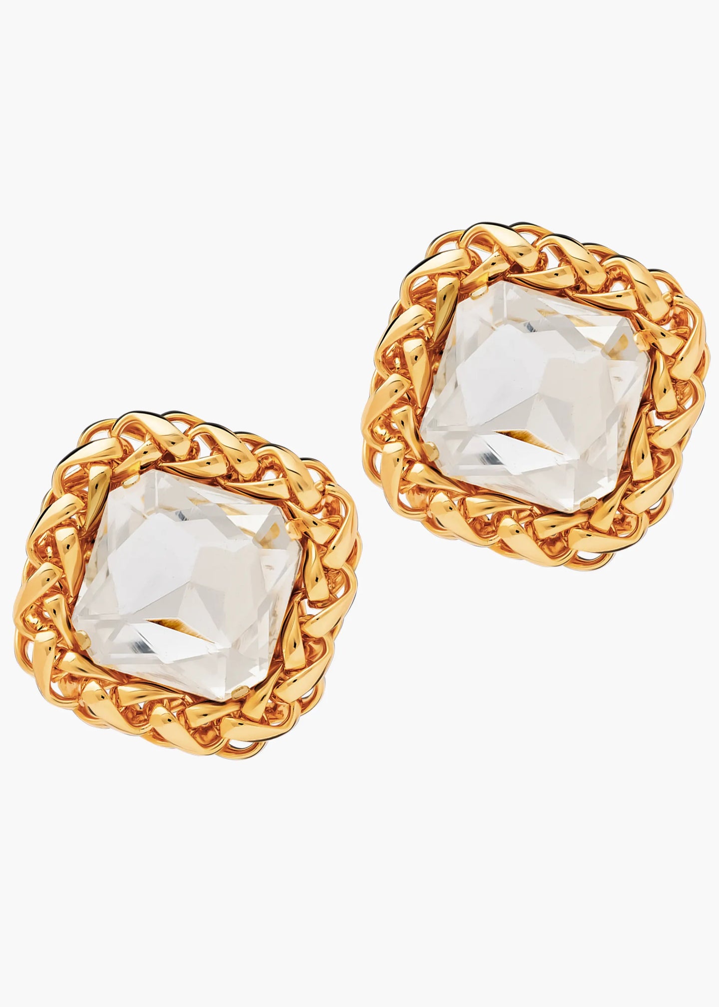 For this collaboration with Leonie Hanne, Leonie and Jennifer were inspired by their joint desire to "create a collection that feels timeless and versatile; pieces you can wear from day to night that feel elevated and chic, yet still playful," says Hanne. The Belle Studs are the pinnacle of this notion, rooted in the duo's reverence for exceptional craftsmanship, with gorgeously faceted Austrian crystals bound by 18-karat gold-plated chains. Made by hand in New York, each chain is wrapped by hand, a process that allows for considerably richer detail than casting. Dimensions: 1.5 inch length