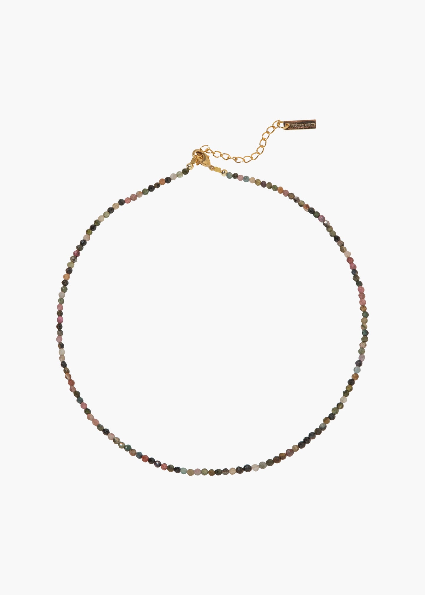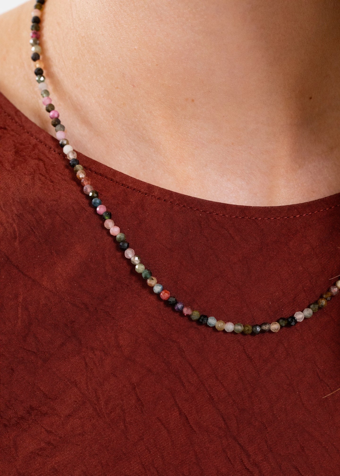 The Dani Necklace celebrates the beauty of natural semi-precious tourmaline, a protective stone known for its range of hues— each necklace is a one-of-a-kind kaleidoscope of colors. Made by hand in New York, the faceted stones are finished with an 18-karat gold-plated lobster clasp, with an extender chain for an adjustable fit. The delicate beads make this necklace perfect for layering with other necklaces in our collection. Dimensions: 21" length
