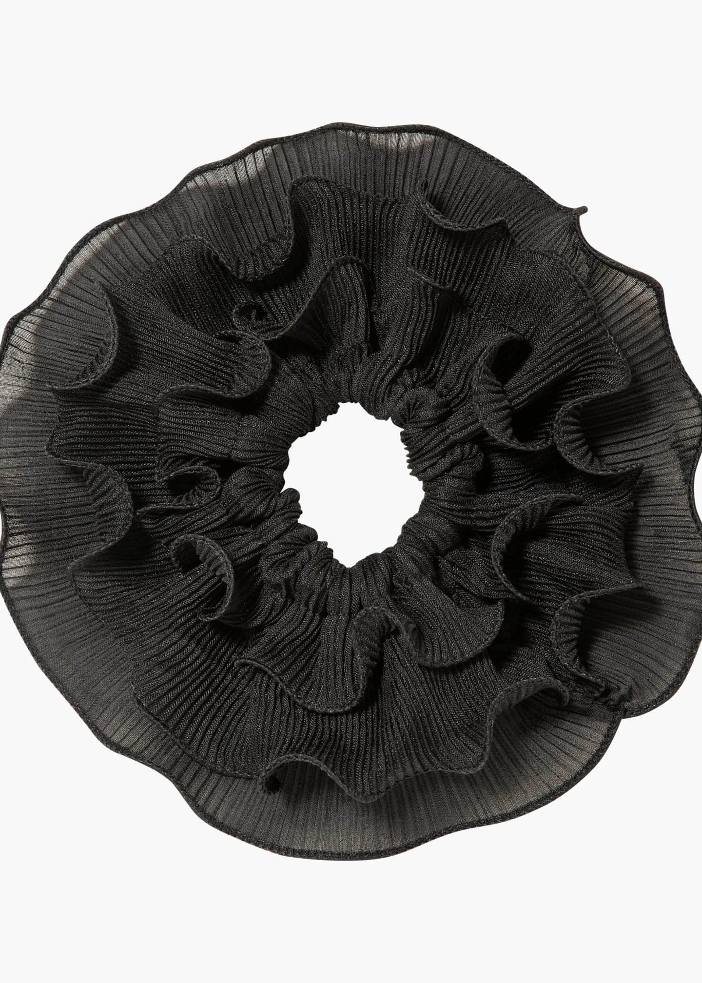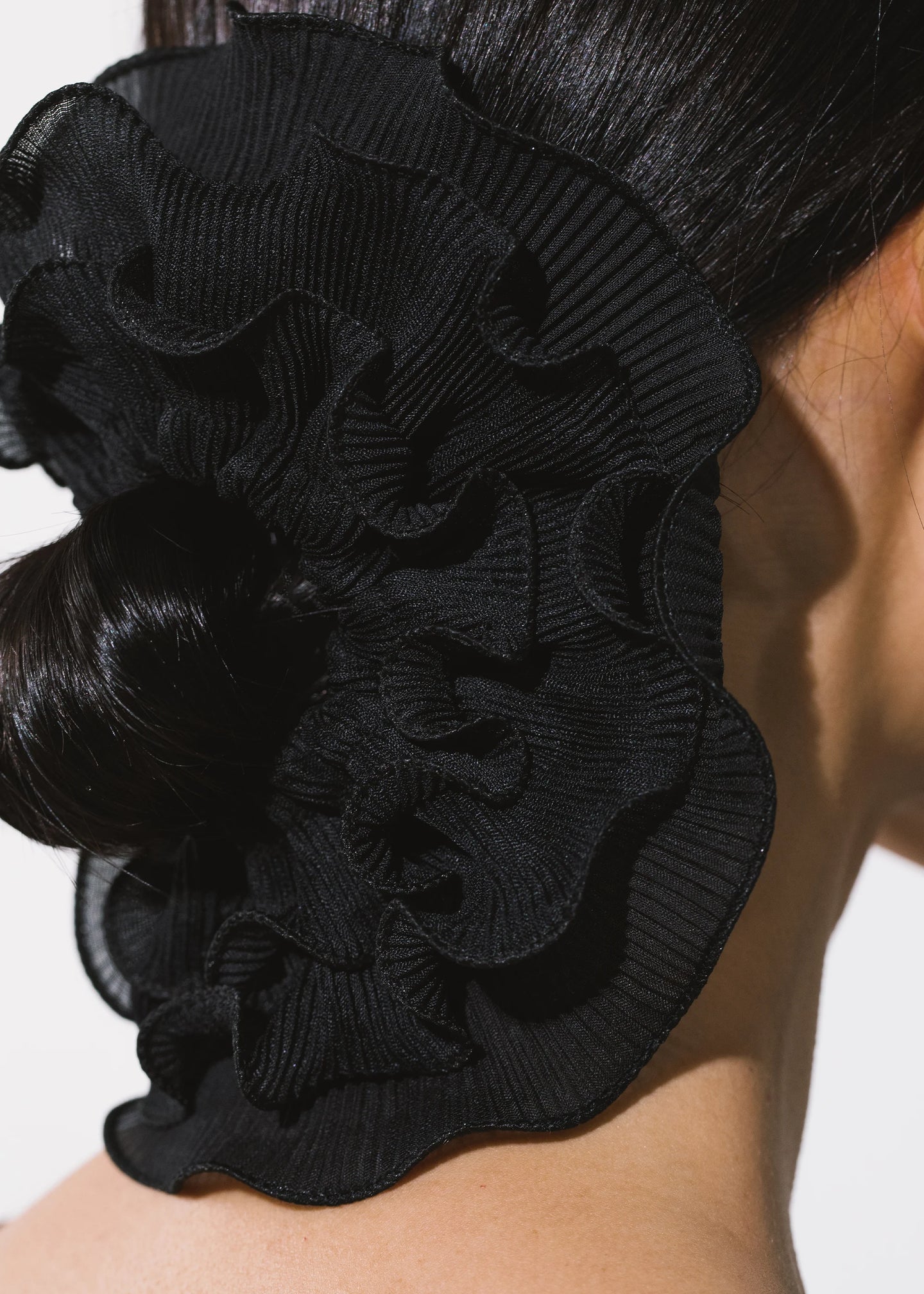 The Jacinda Ponywrap is made in New York from hand-gathered organza ruffles and finished with a high quality elastic chord. We recommend treating this piece as you would a piece of jewelry, and storing in the dust bag when not in use. Avoid contact with water, perfume, and other chemicals, including hairspray, which should be used before placement in the hair.