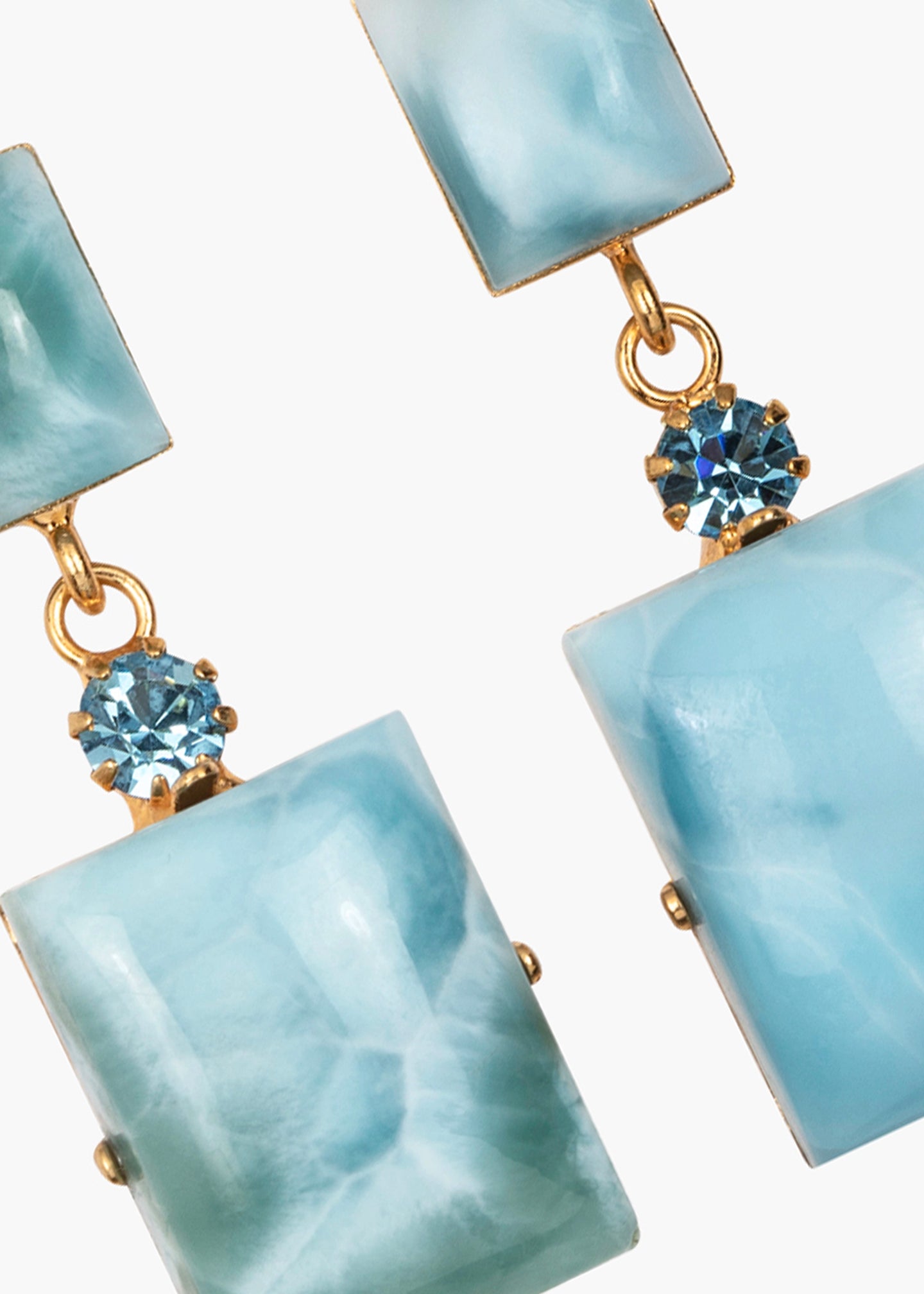 The Joliel Earrings are a dressed-up take on our best-selling Justine Earrings, recreated with stunning semi-precious gemstones, like malachite and larimar, which make each pair unique. Inspired by the elegant, clean lines of Art Deco marble interiors, the nearly invisible 18-karat gold-plated setting is designed to emphasize the gemstone's inherent marbling. Made by hand in New York, these drops are punctuated with a delicate Austrian crystal for added sparkle. Dimensions: 1.5" length
