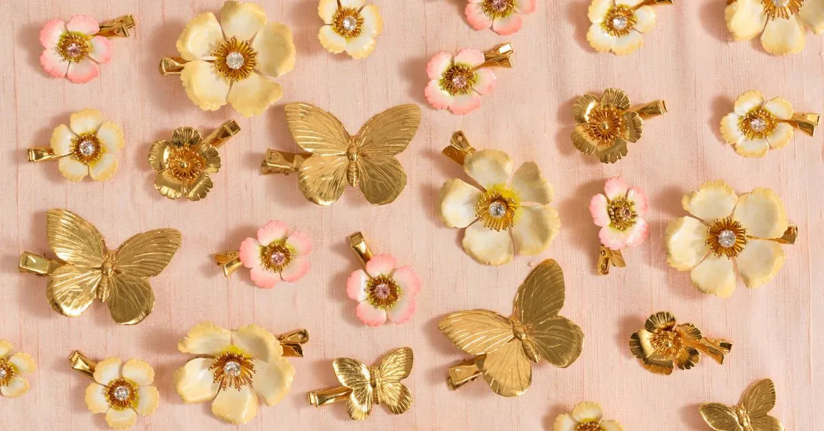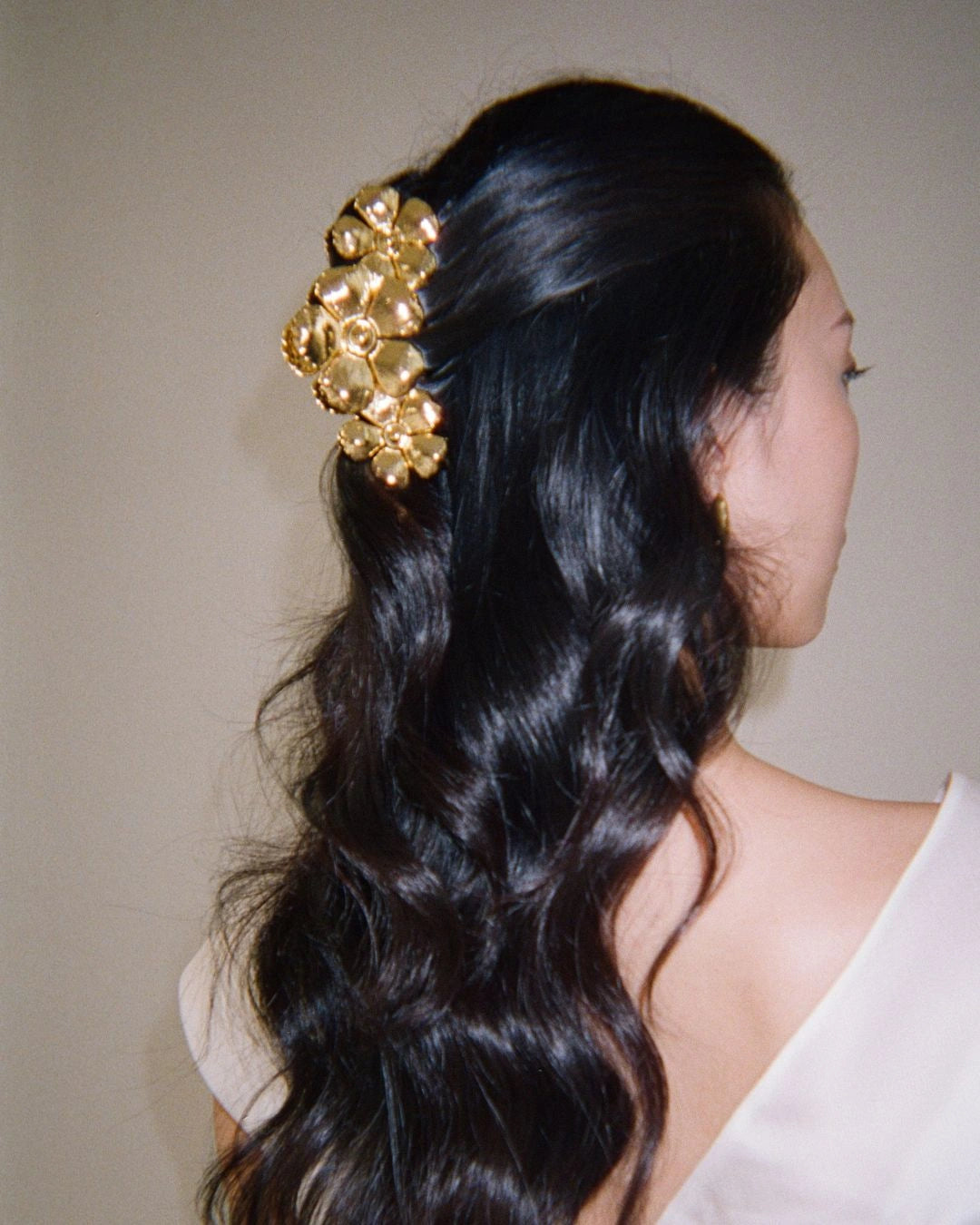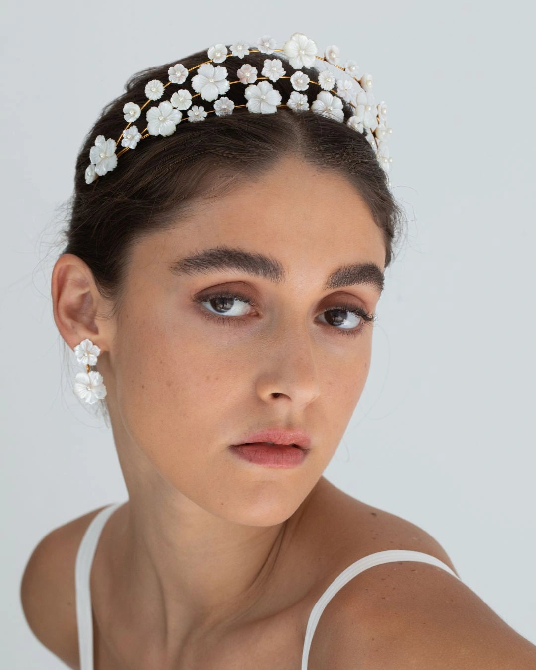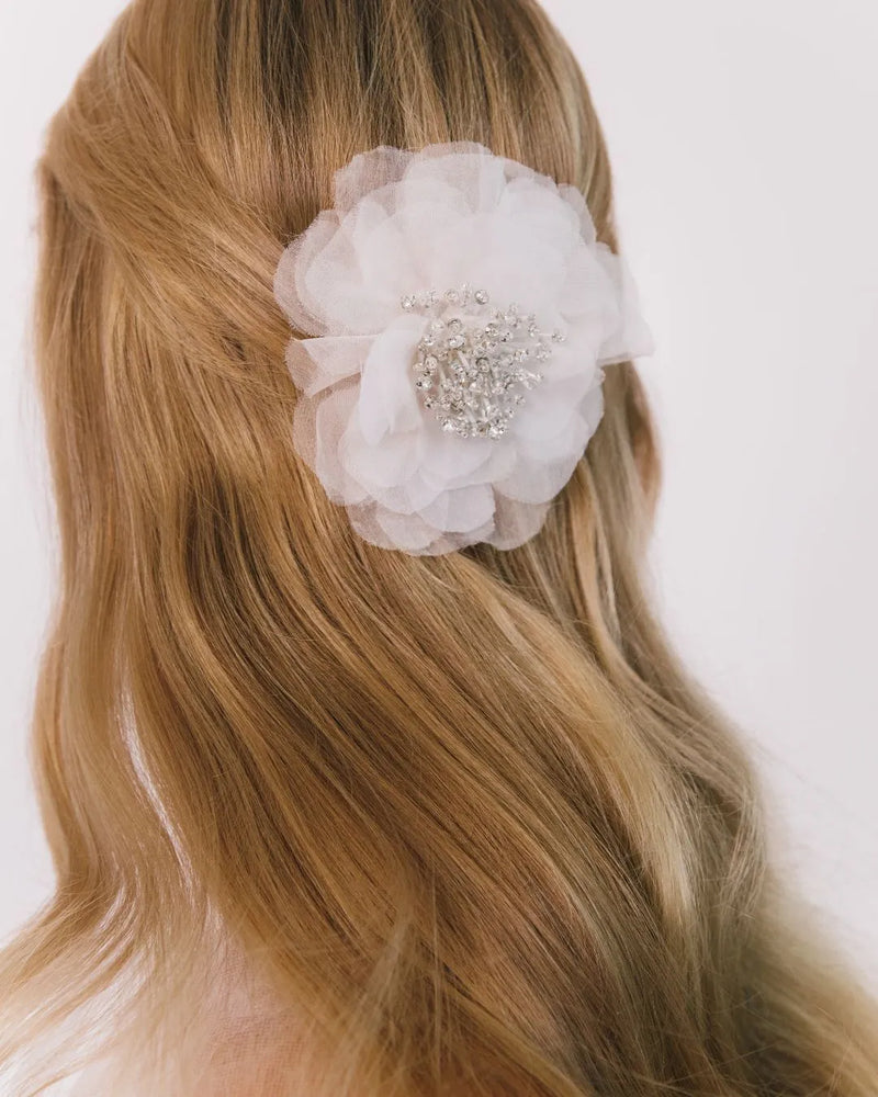 Delicate mother of pearl flowers floating in your hair, silk faille rosettes folded by hand in New York City. Blossom in our collection of accessories inspired by beauty of nature.