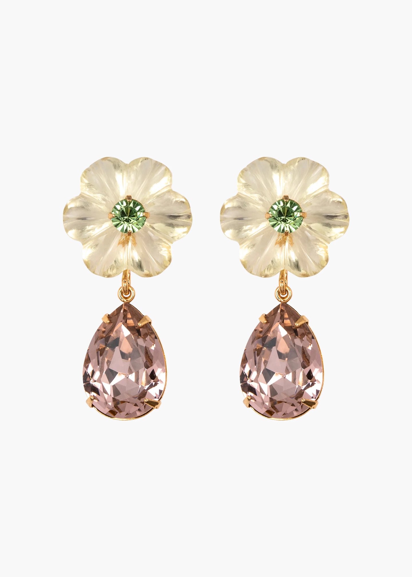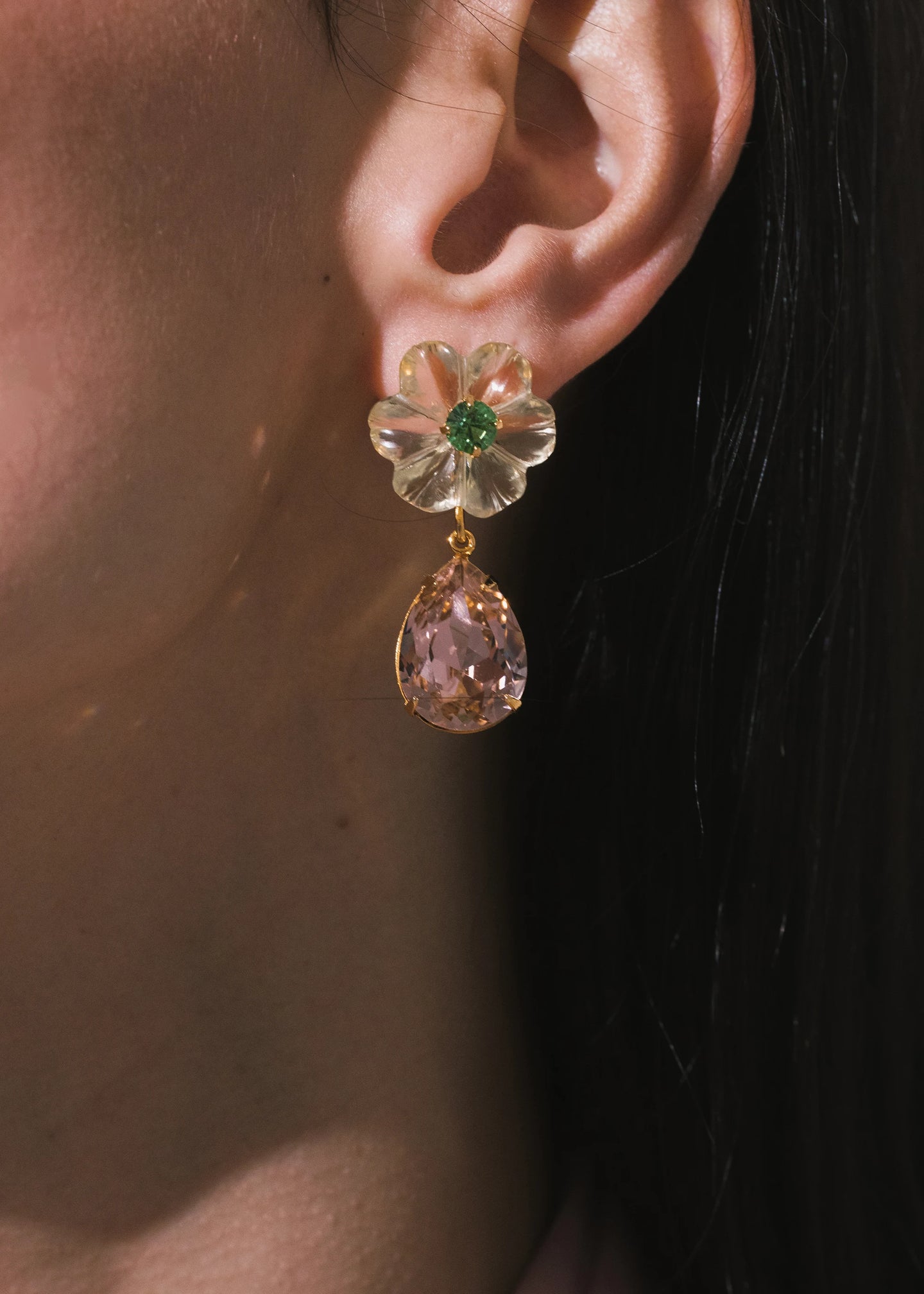 The Juna Earrings are made by hand in New York from 18K gold plated brass and a hand-carved semi-precious stone flower with Austrian crystal drops and accents. All stones have natural variances in color and markings that make each one unique. They have a surgical-steel post, are nickel-free, and safe for sensitive skin. We recommend storing earrings in their dust bag while not in use, and avoiding contact with water, perfume, hairspray, and other chemicals.