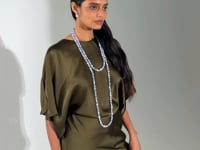 The Veda Necklace is made by hand in New York from semi-precious stone beads. All stones have natural variances in color and markings that make each one unique. We recommend storing necklaces in their dust bag while not in use, and avoiding contact with water, perfume, hairspray, and other chemicals.