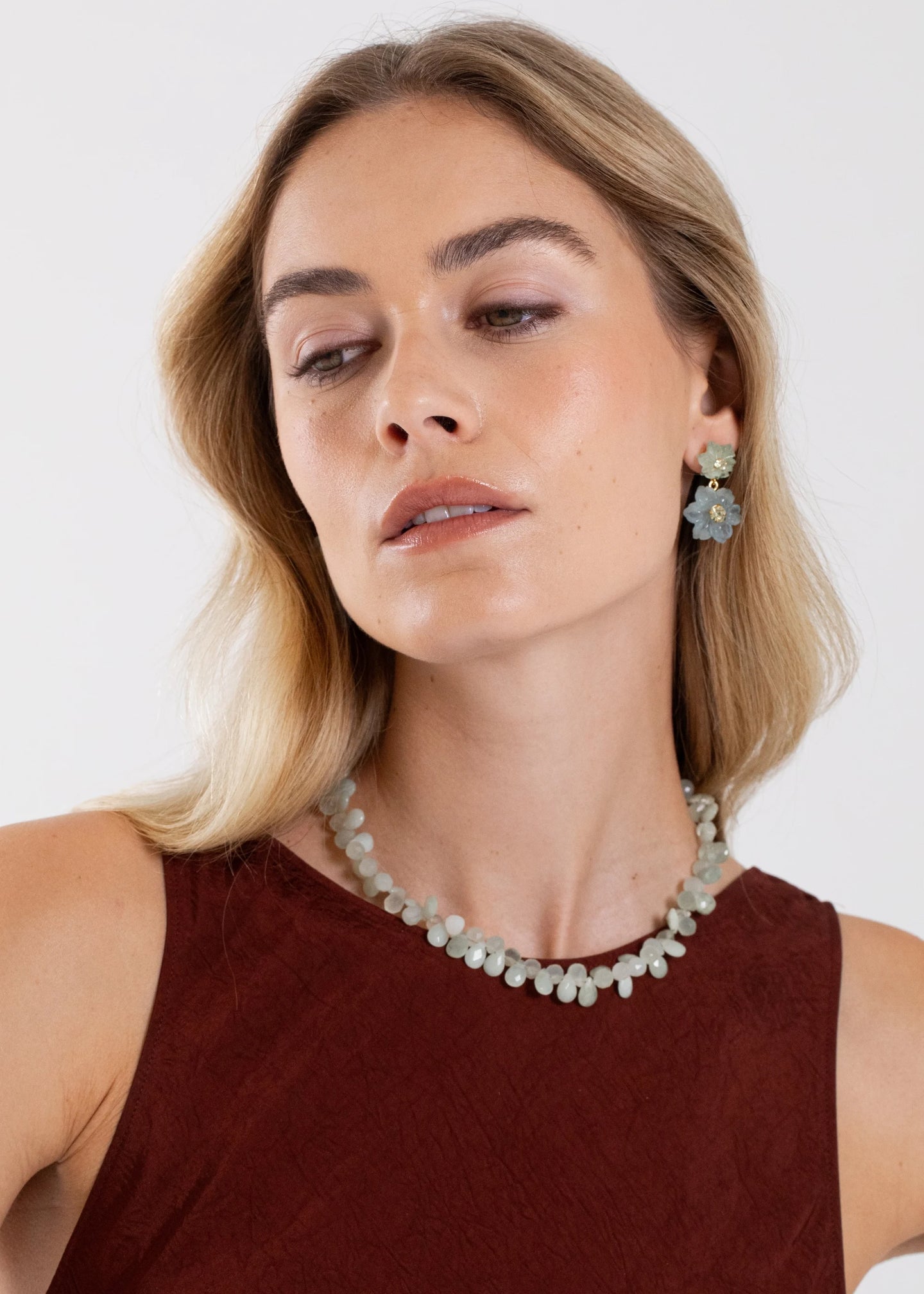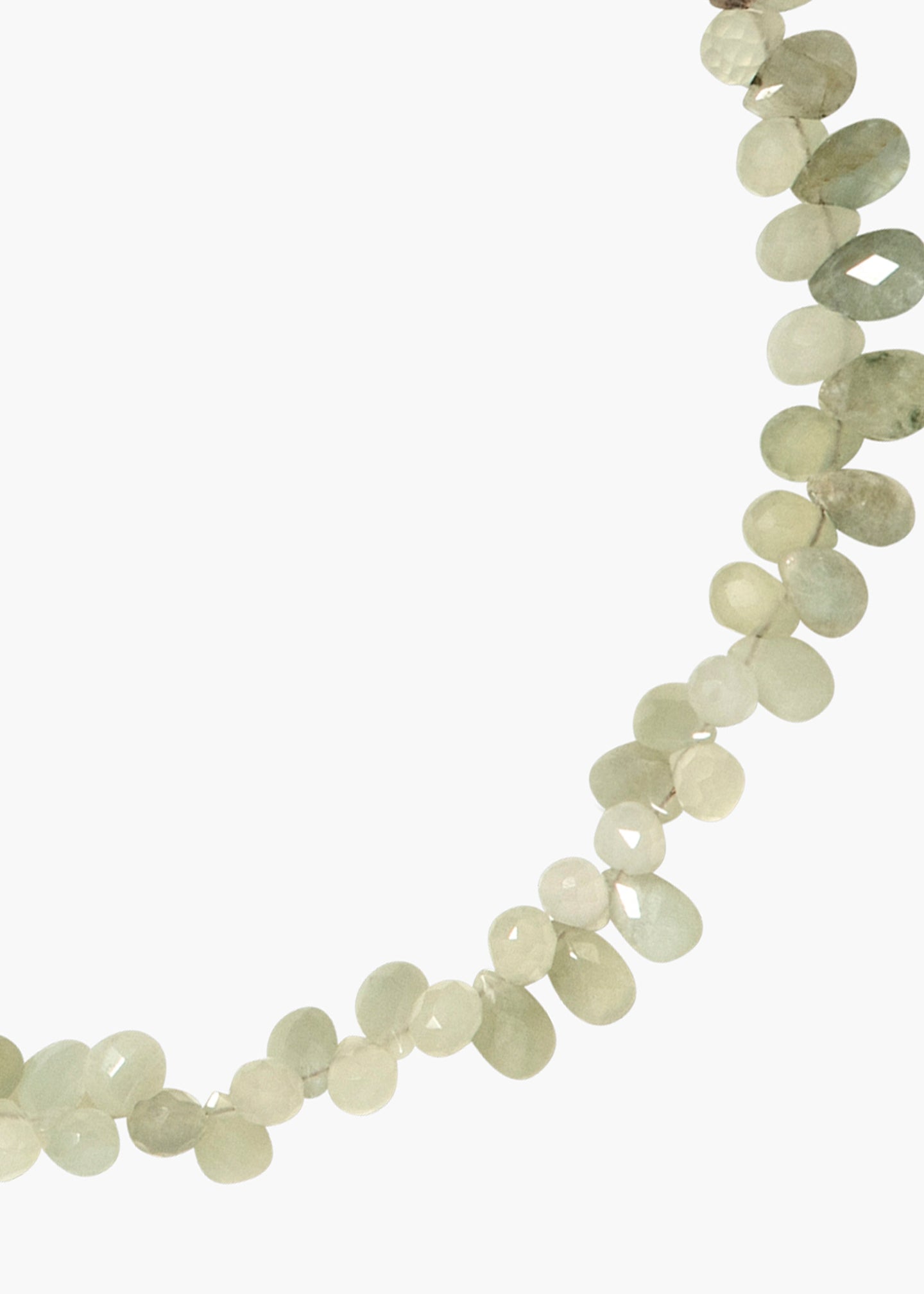 The Bernadette Necklace is handmade in New York of faceted semiprecious gemstones with a 18K gold plated magnetic closure. All stones have natural variances in color and markings that make each one unique. We recommend storing necklaces in their dust bag while not in use, and avoiding contact with water, perfume, hairspray, and other chemicals.