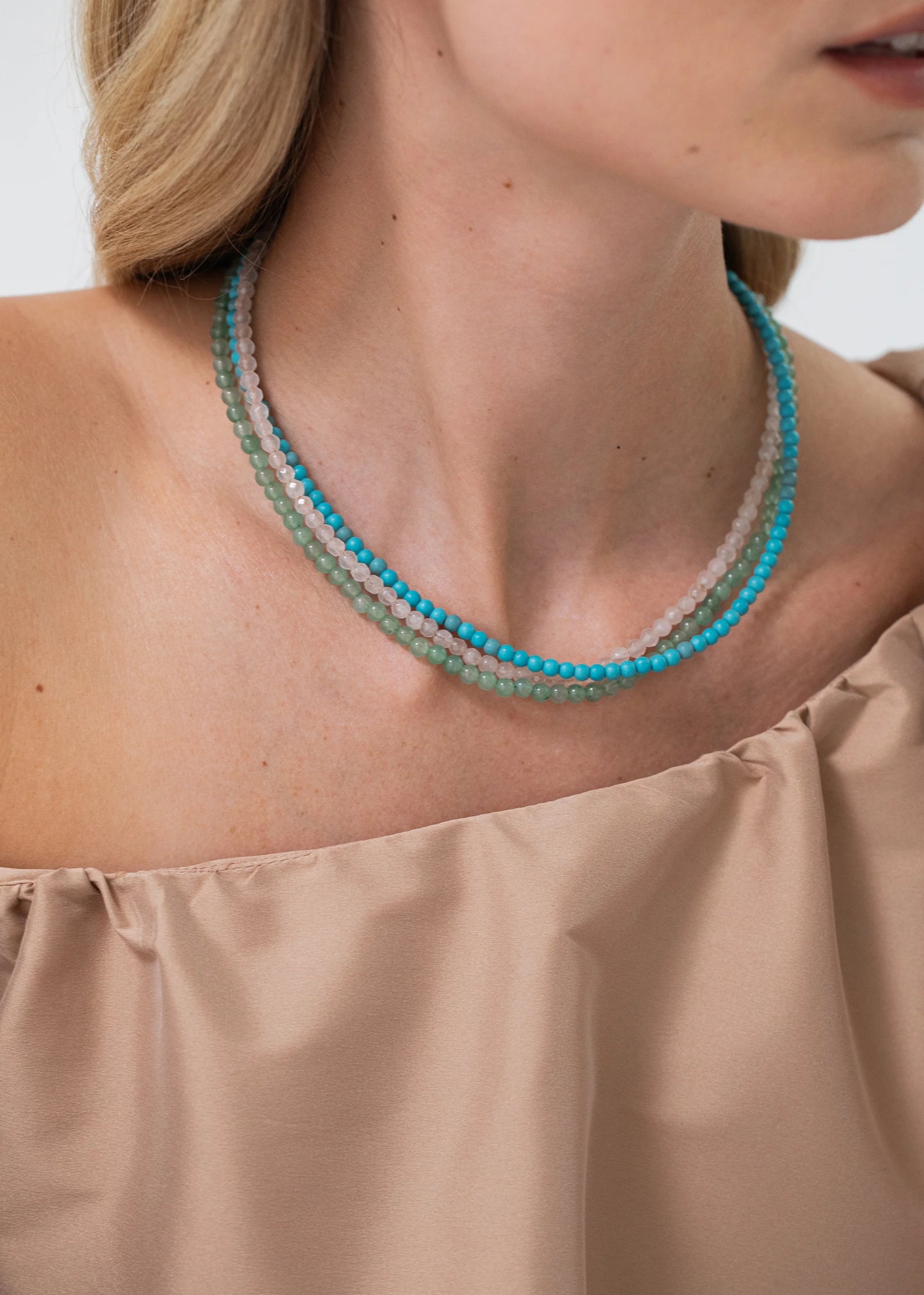 The Ersa Necklace is handmade in New York of semi-precious stones. All stones have natural variances in color and markings that make each one unique. Our jewelry is nickel-free and safe for sensitive skin. We recommend storing jewelry in its dust bag while not in use, and avoiding contact with water, perfume, hairspray, and other chemicals.