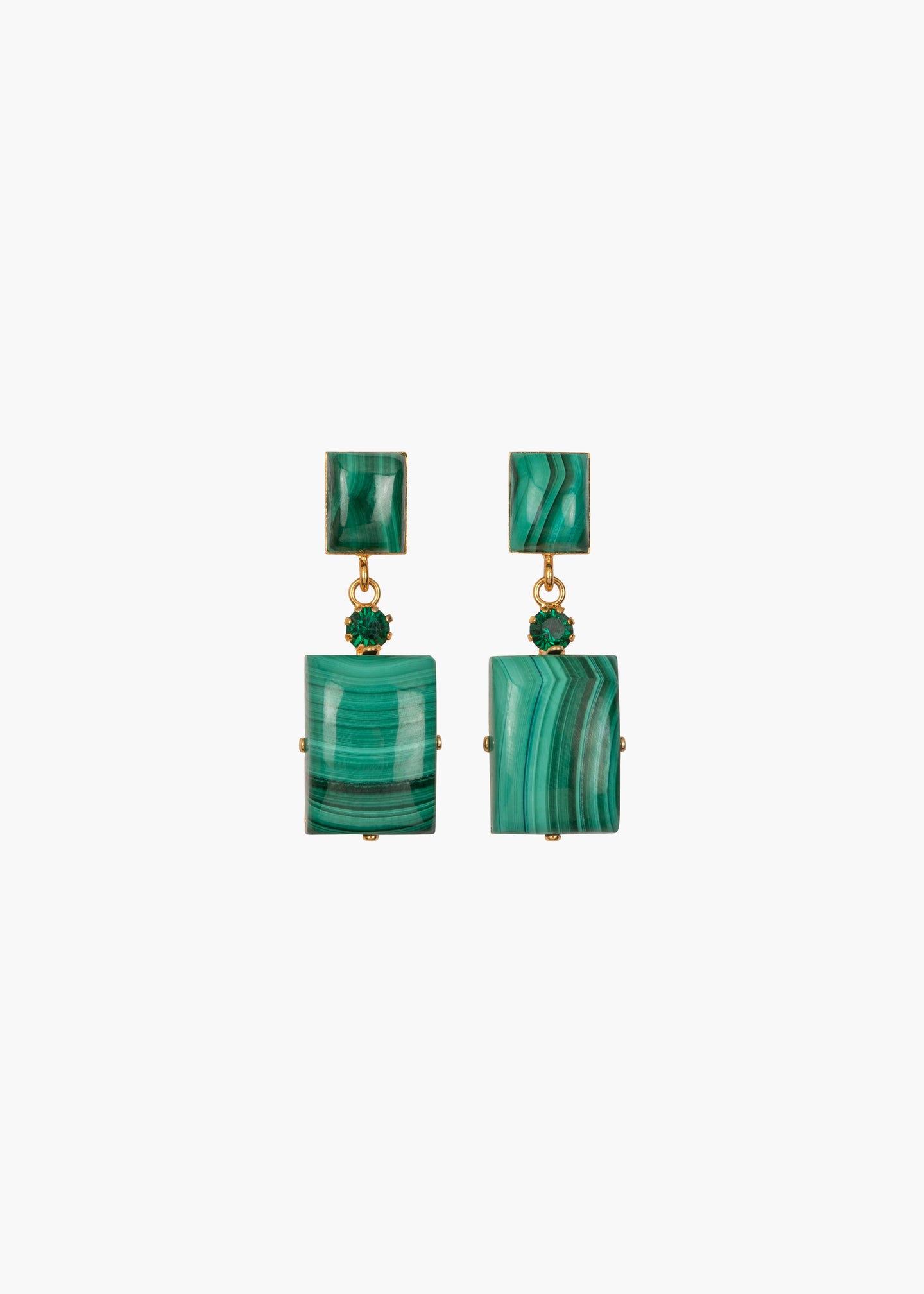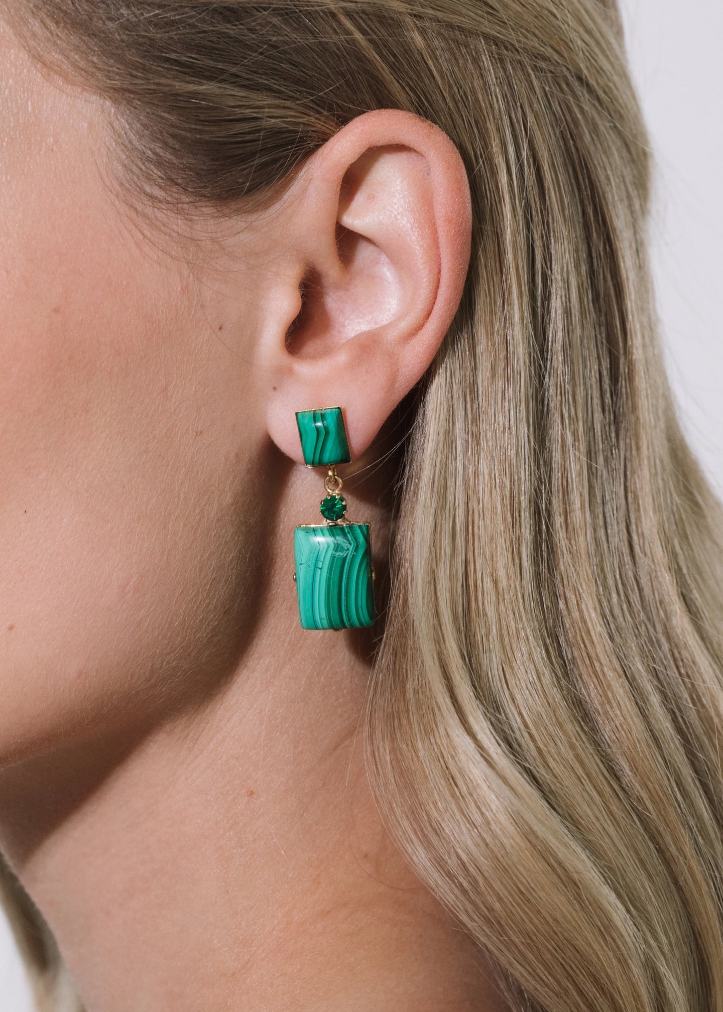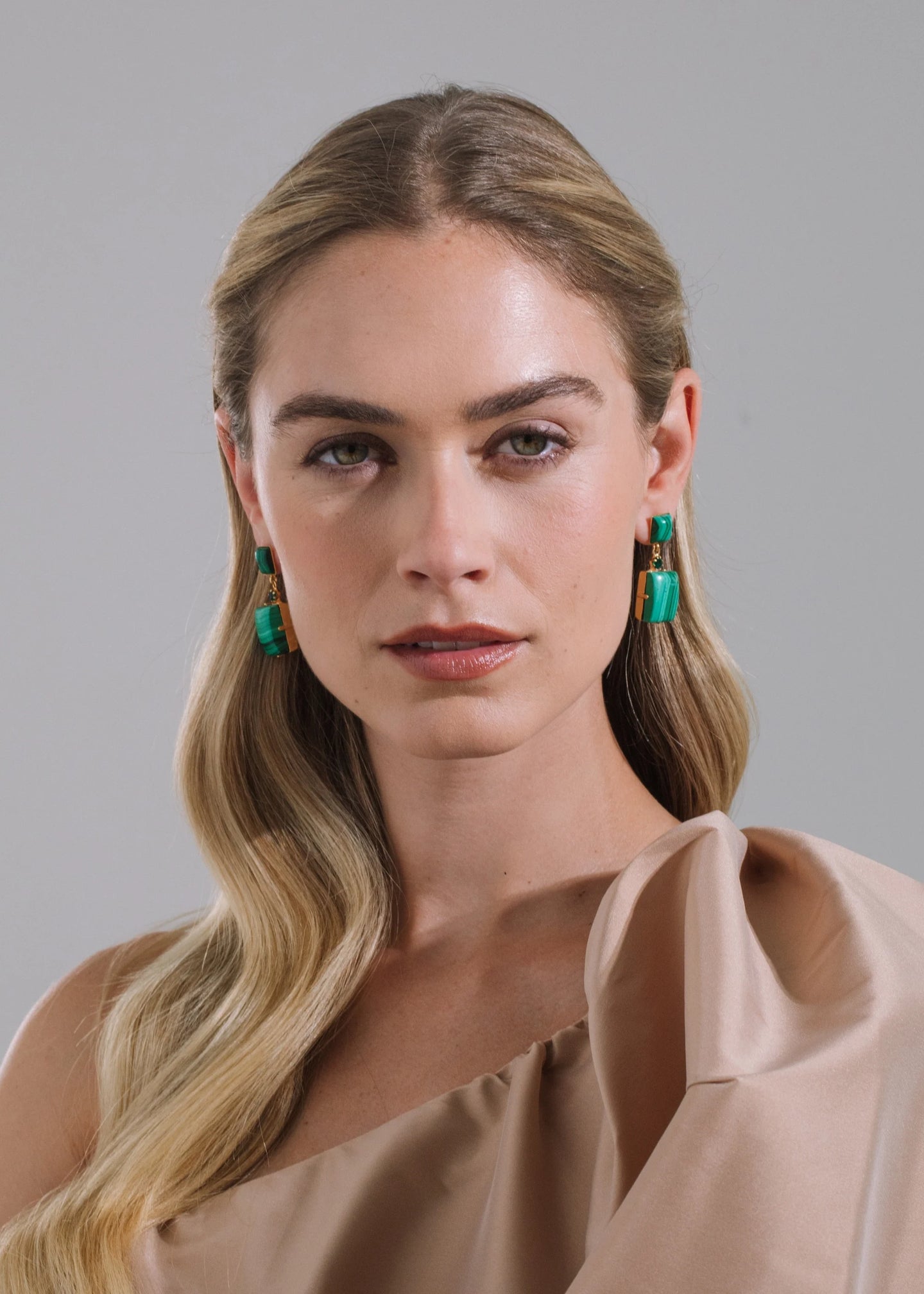 The Joliel Earrings are a dressed-up take on our best-selling Justine Earrings, recreated with stunning semi-precious gemstones, like malachite and larimar, which make each pair unique. Inspired by the elegant, clean lines of Art Deco marble interiors, the nearly invisible 18-karat gold-plated setting is designed to emphasize the gemstone's inherent marbling. Made by hand in New York, these drops are punctuated with a delicate Austrian crystal for added sparkle. Dimensions: 1.5" length