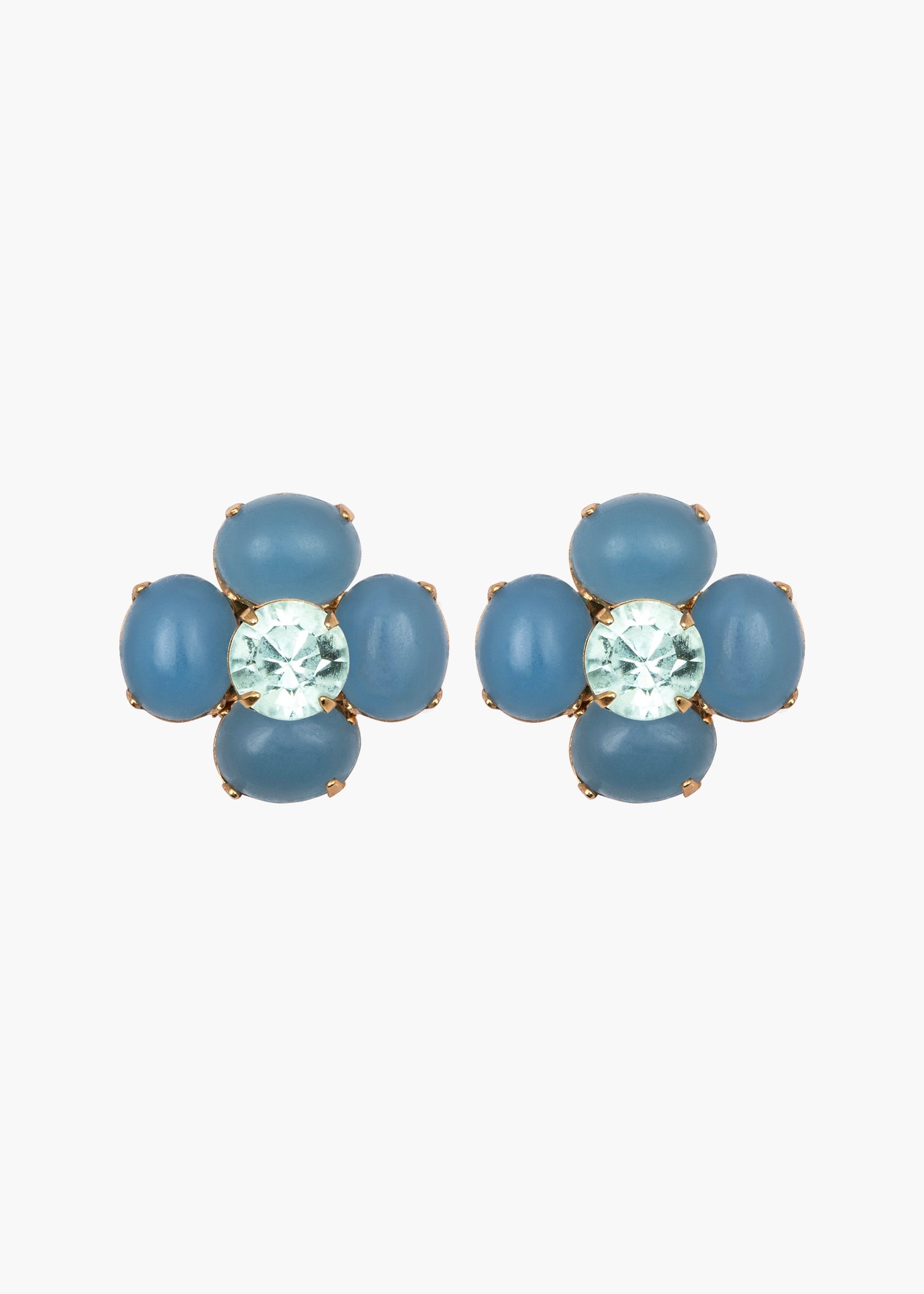 Inspired by 1960s mod florals, the Quinn Earrings are a delicious pop of color, flaunting the vivid hues of semi-precious stones like pink opal, blue agate, and red garnet. Made by hand in New York, the bubble-flower shape is achieved using cabochon gemstones for petals, with a fine Austrian crystal in the center. The stud is complete with an 18-karat gold-plated setting. Dimensions: 1"