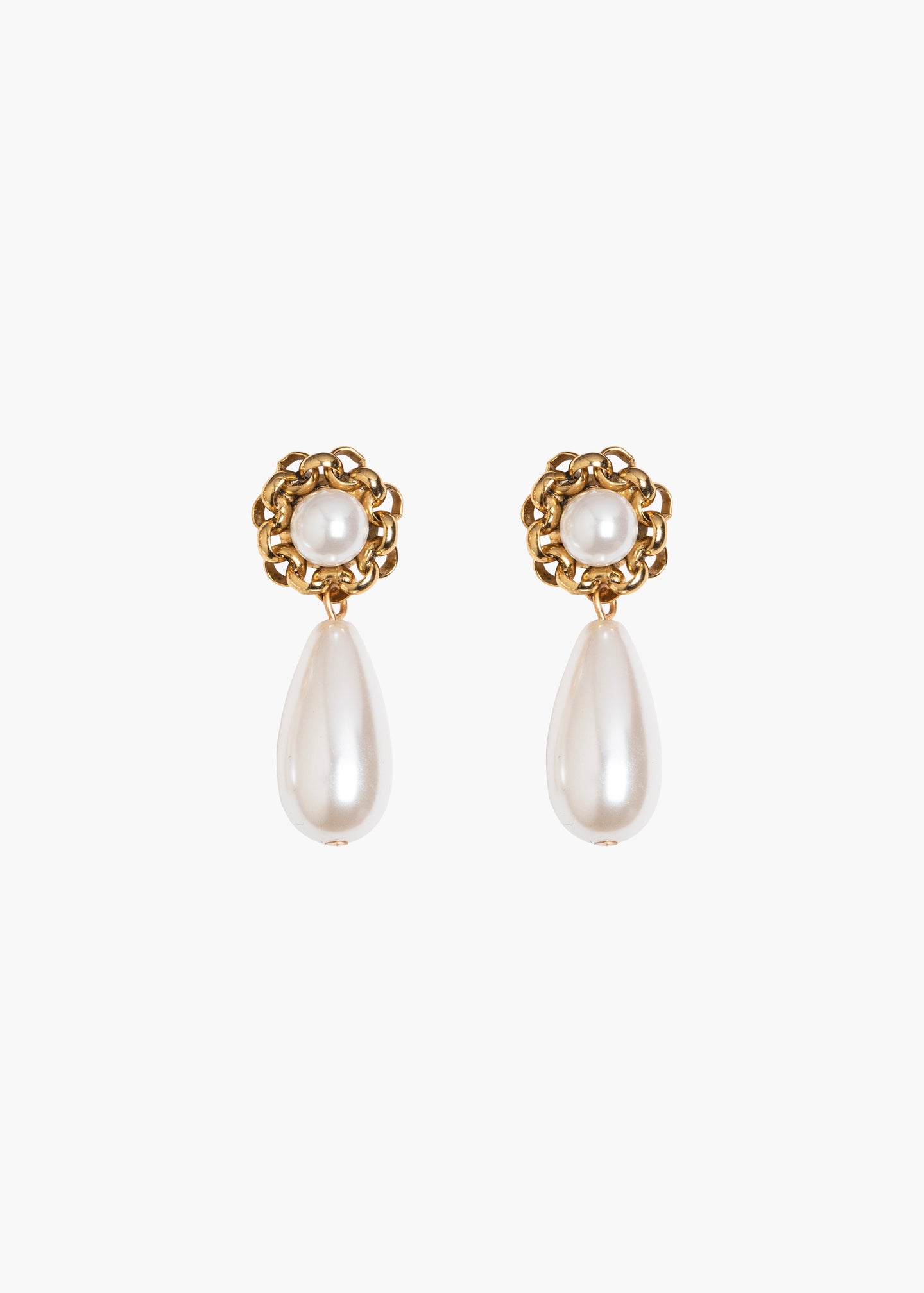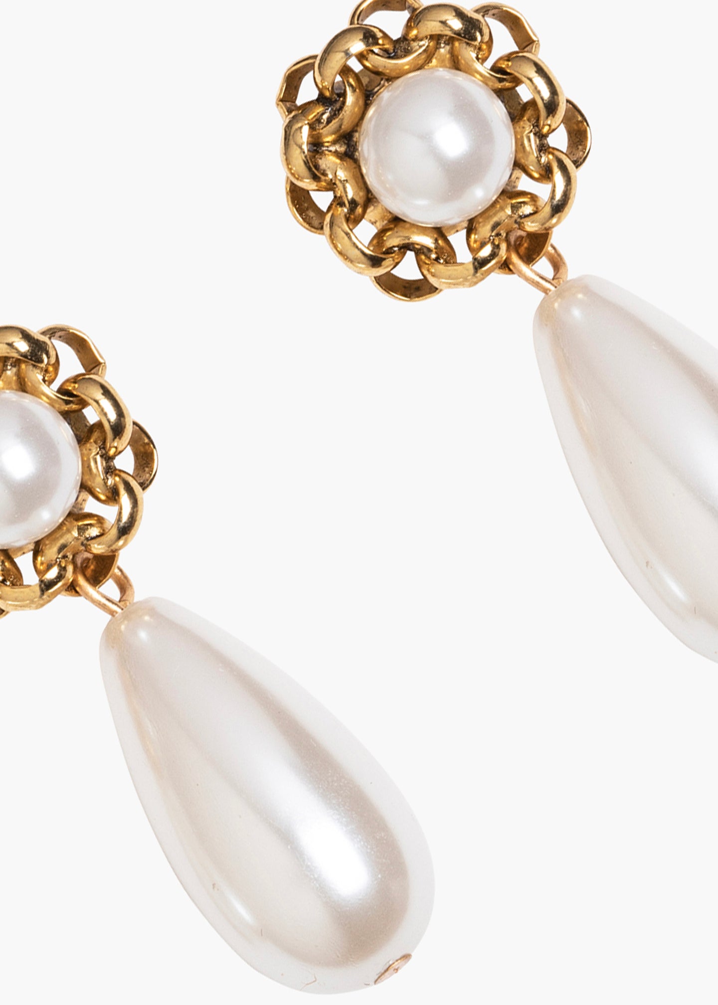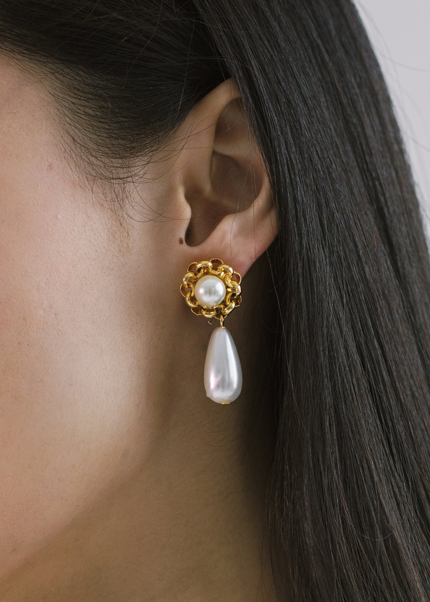 Sweet meets edgy in the ultra-wearable Luella Earrings. The softness of the pearls is balanced by the graphic gold chain-link encompassing them. Inspired by vintage earrings, the classic palette makes these drop earrings wardrobe chameleons. Dimensions: 1.5 inch length