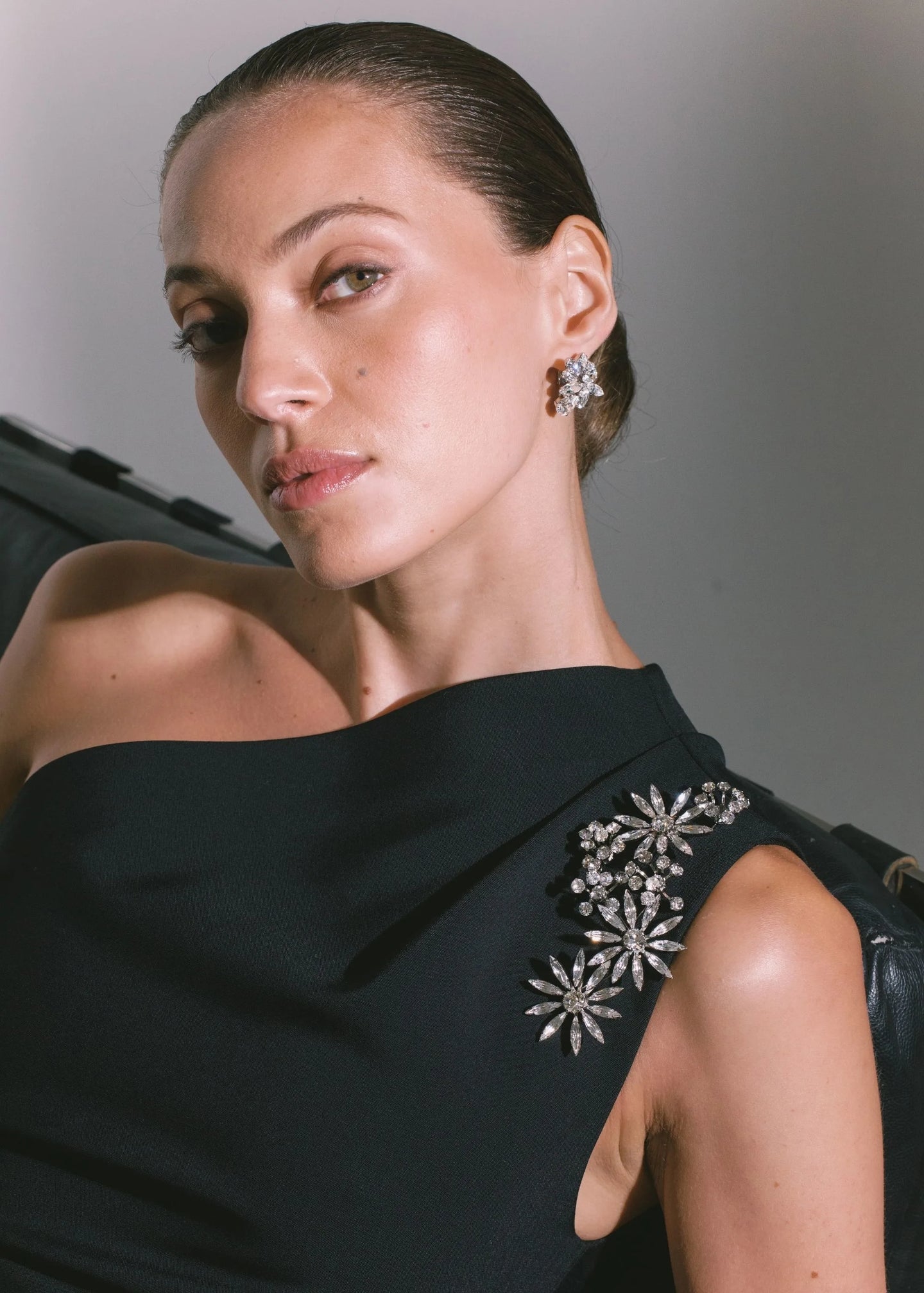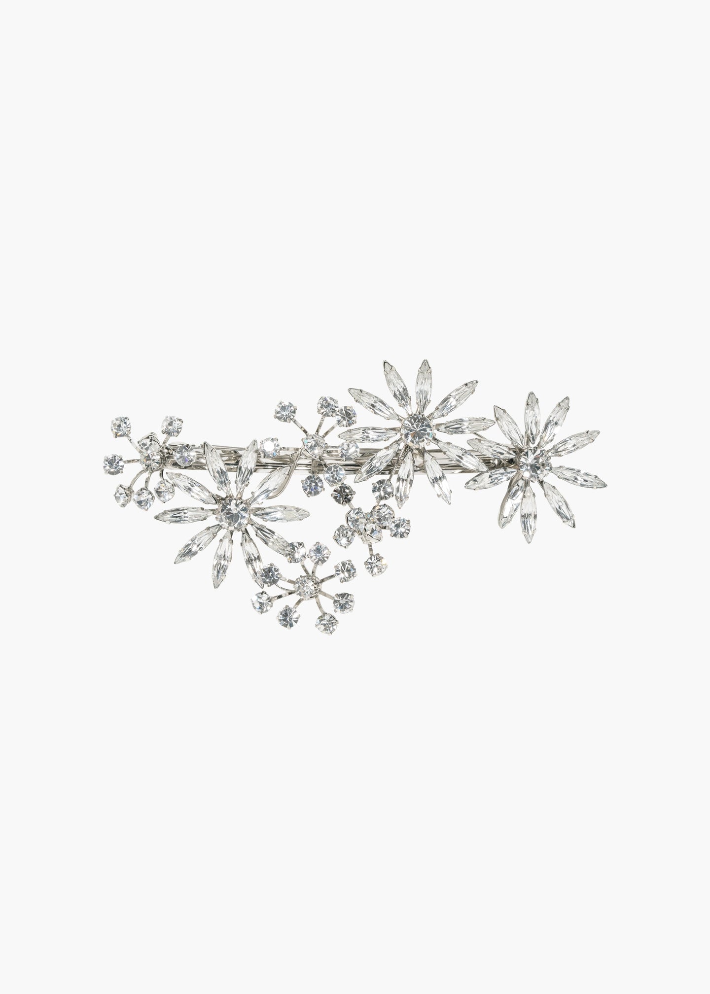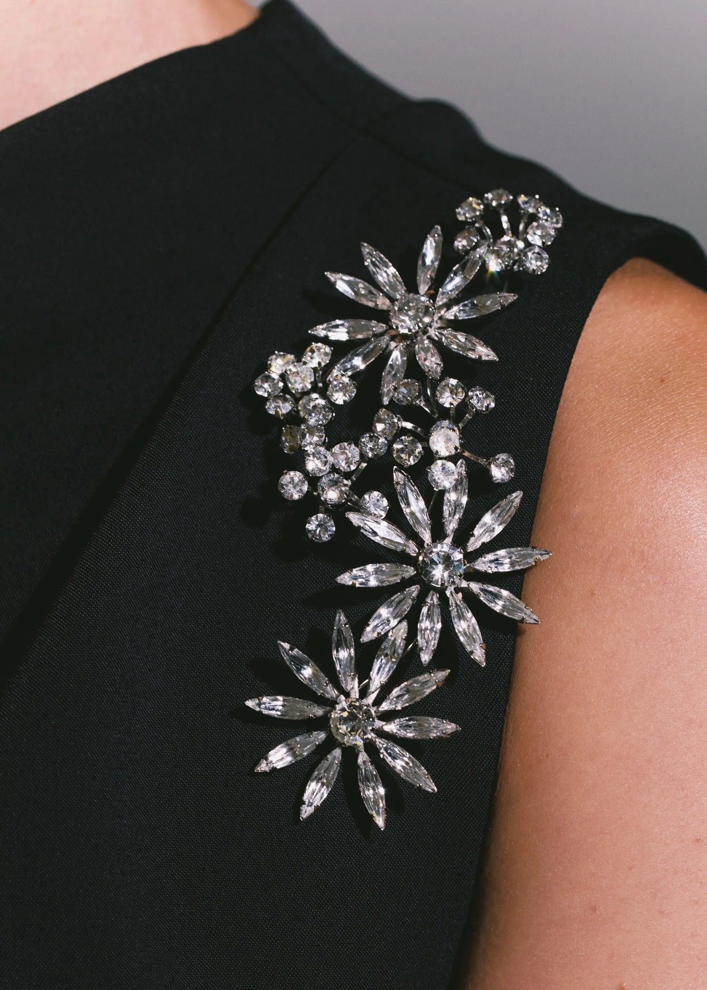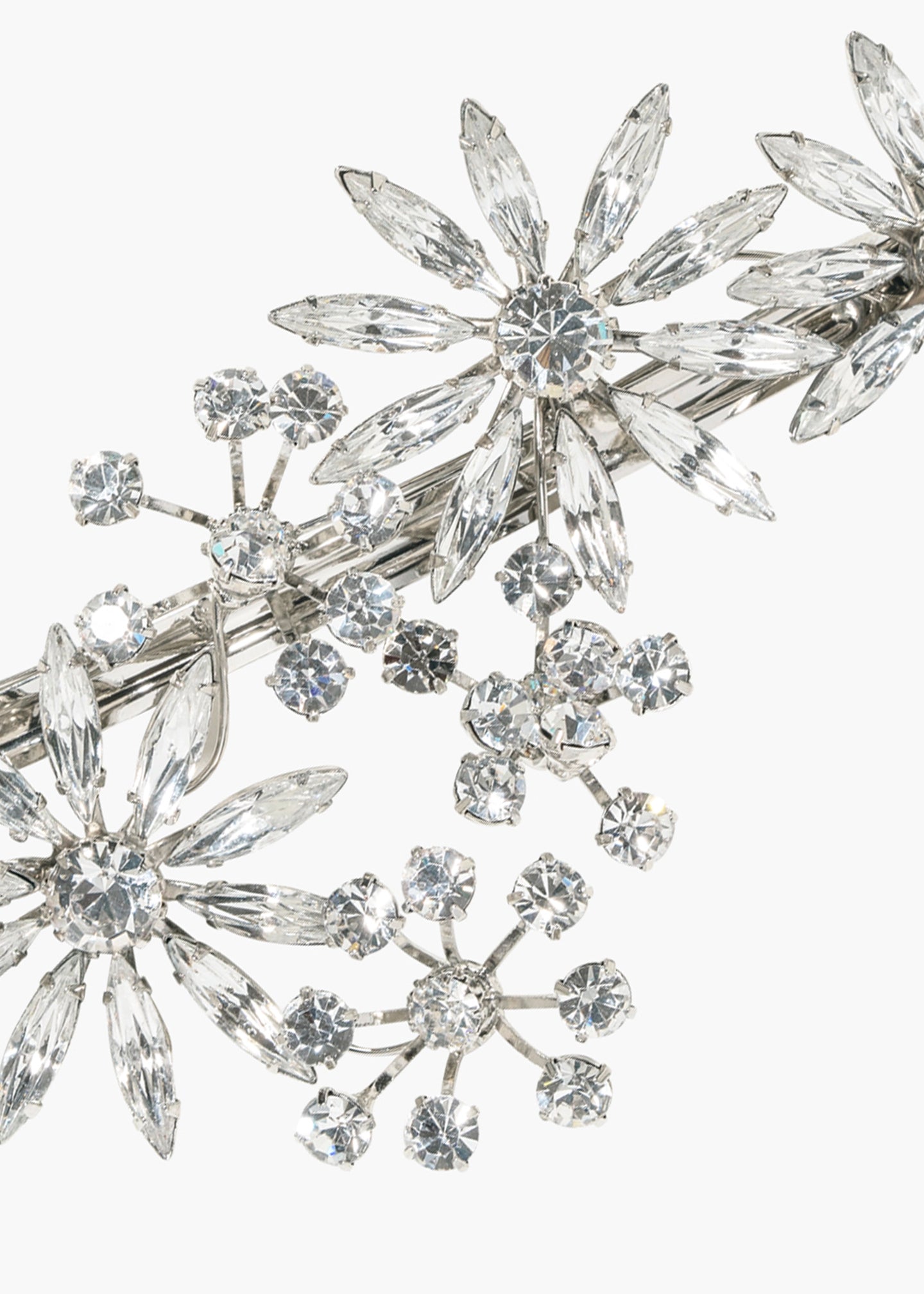 Inspired by a beloved vintage couture brooch from the 1980s, the Celestial Brooch elevates even the simplest pieces to something extraordinary. Made by hand in New York, Austrian crystals in a rhodium-plated setting form a symphony of abstract flowers and starbursts. Although it's a single piece, the scale and composition give the impact of multiple pieces clustered together— we love layering this brooch with the Vita Brooch to create a bespoke arrangement. Dimensions: 5" x 2"