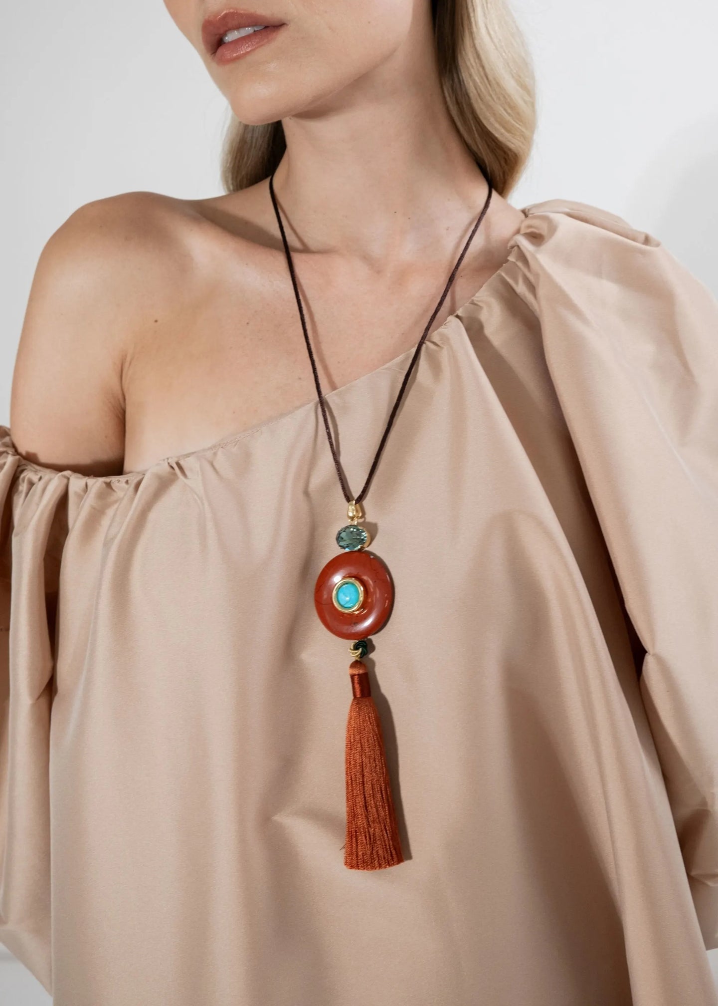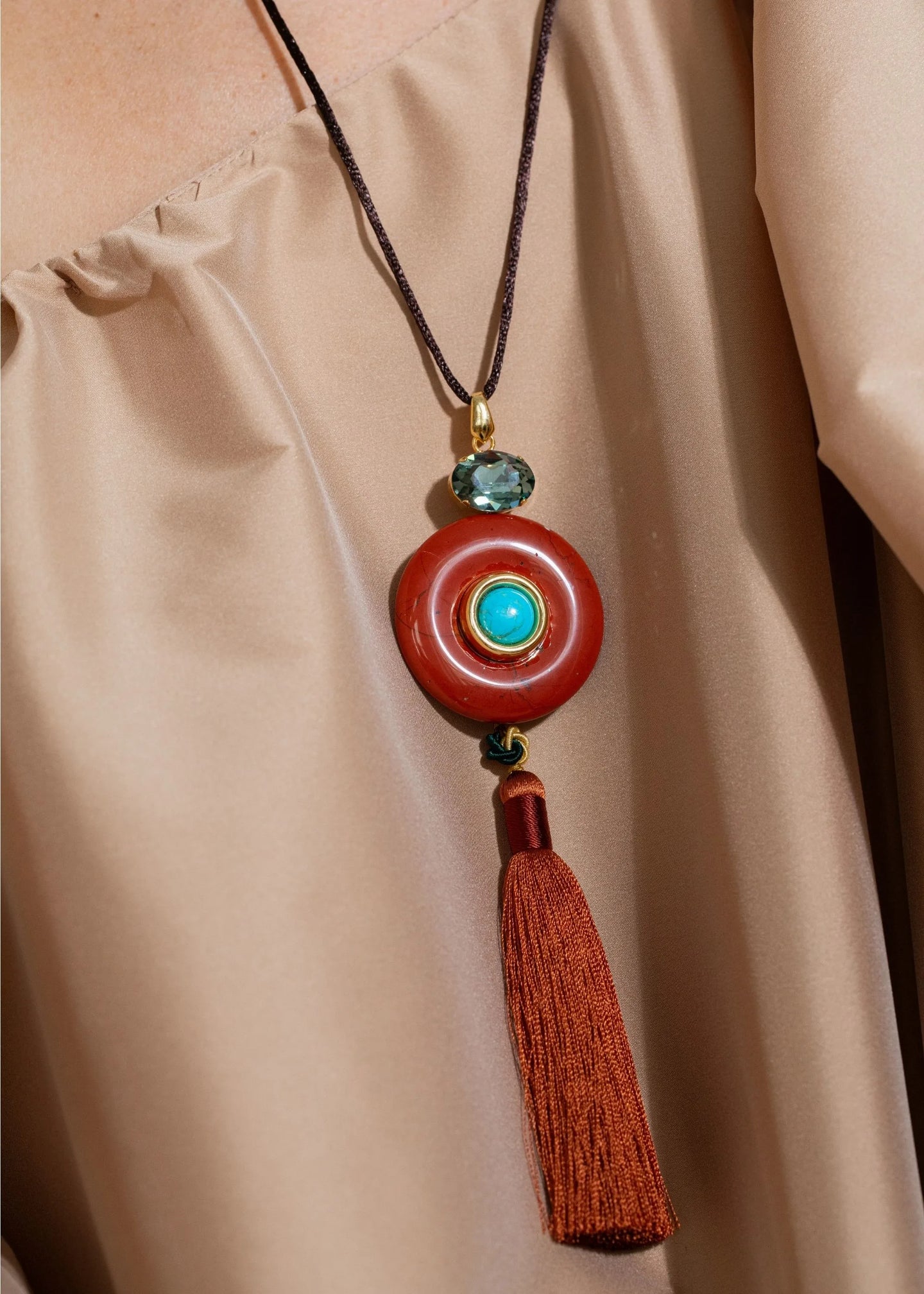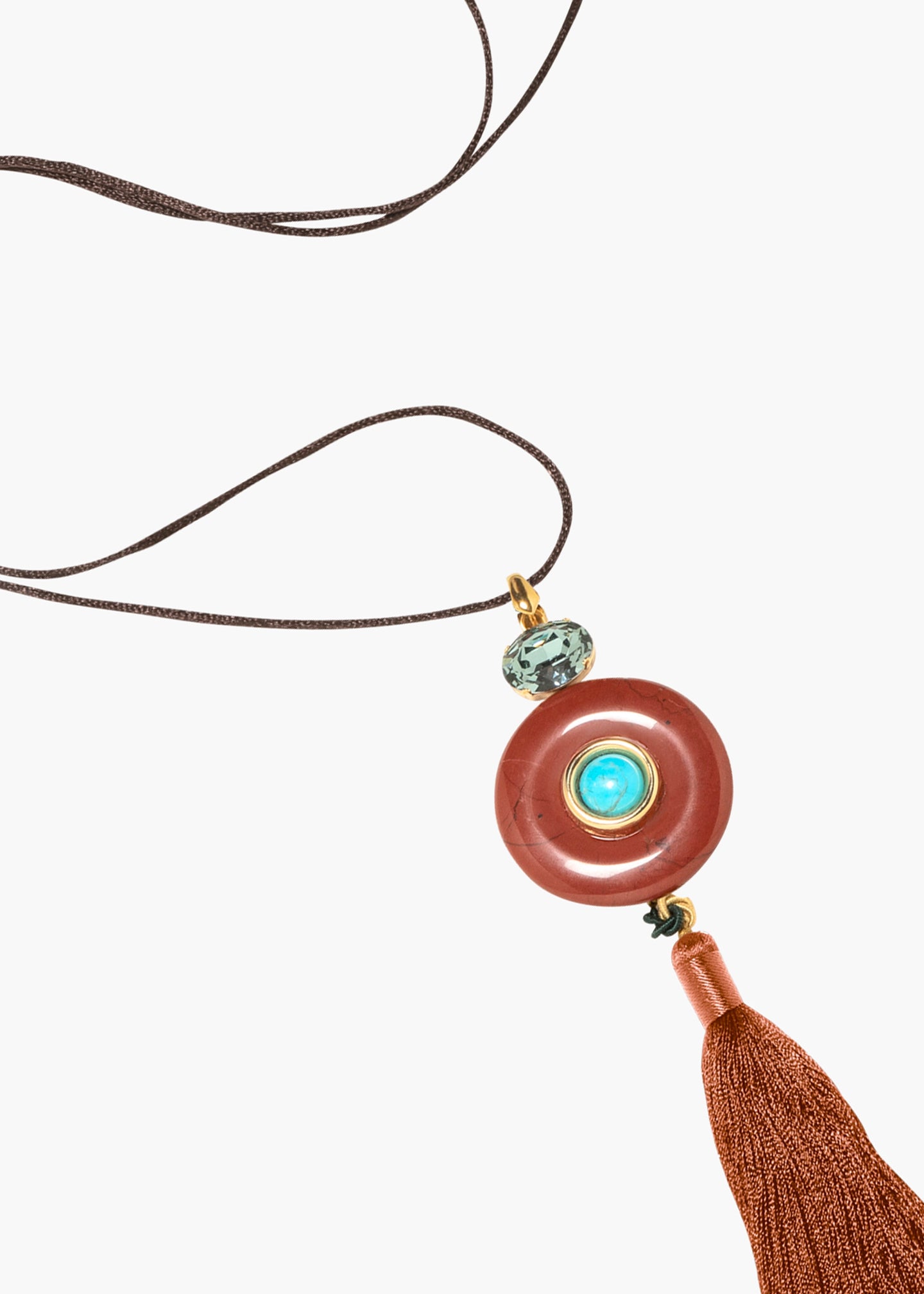 The Arizona Necklace is handmade in New York of adjustable silk chord with a natural semi-precious sunstone and turquoise pendant, Austrian crystal accents, hand-made silk tassel dangle, and 18K gold plated brass finishings. All stones have natural variances in color and markings that make each one unique. We recommend storing necklaces in their dust bag while not in use, and avoiding contact with water, perfume, hairspray, and other chemicals.