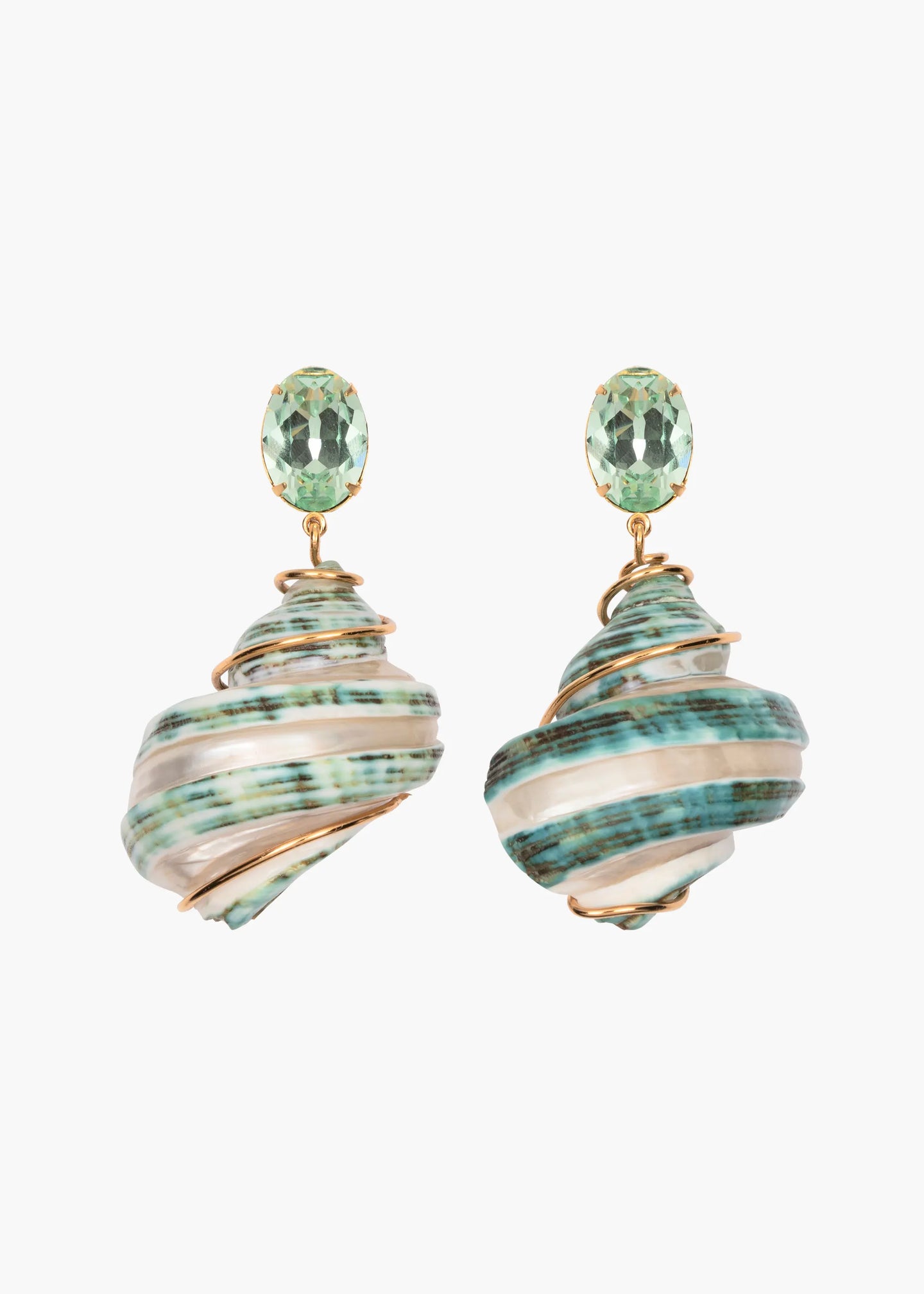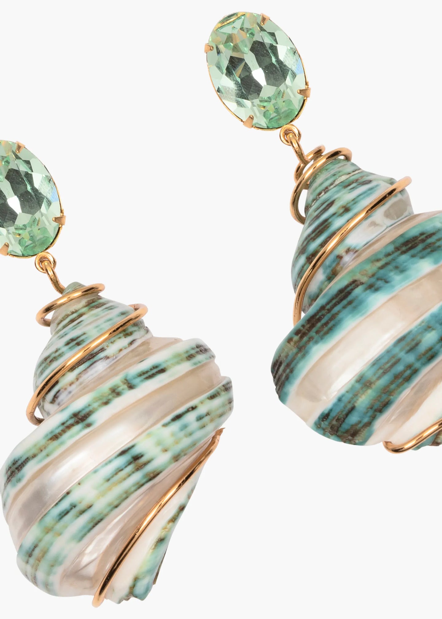 The Wave Earrings make a head-turning conversation piece of a turbo seashell forged by nature. Designed to enhance the beauty of the organic shells, the hand-formed wire setting is crafted by hand with fine jewelry techniques to highlight the natural curvature of the green turbo seashells. The crystal accent stones further highlight their highly unique natural coloring. Dimensions: 2.75 inch length