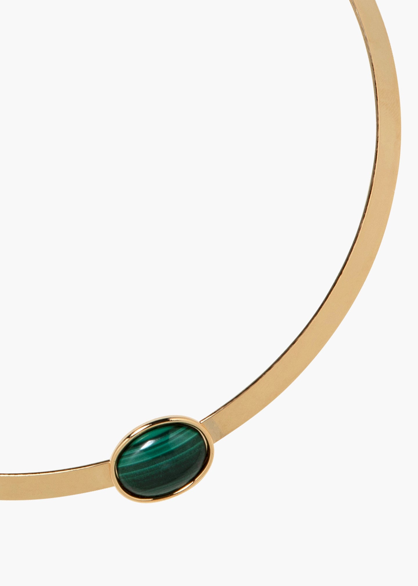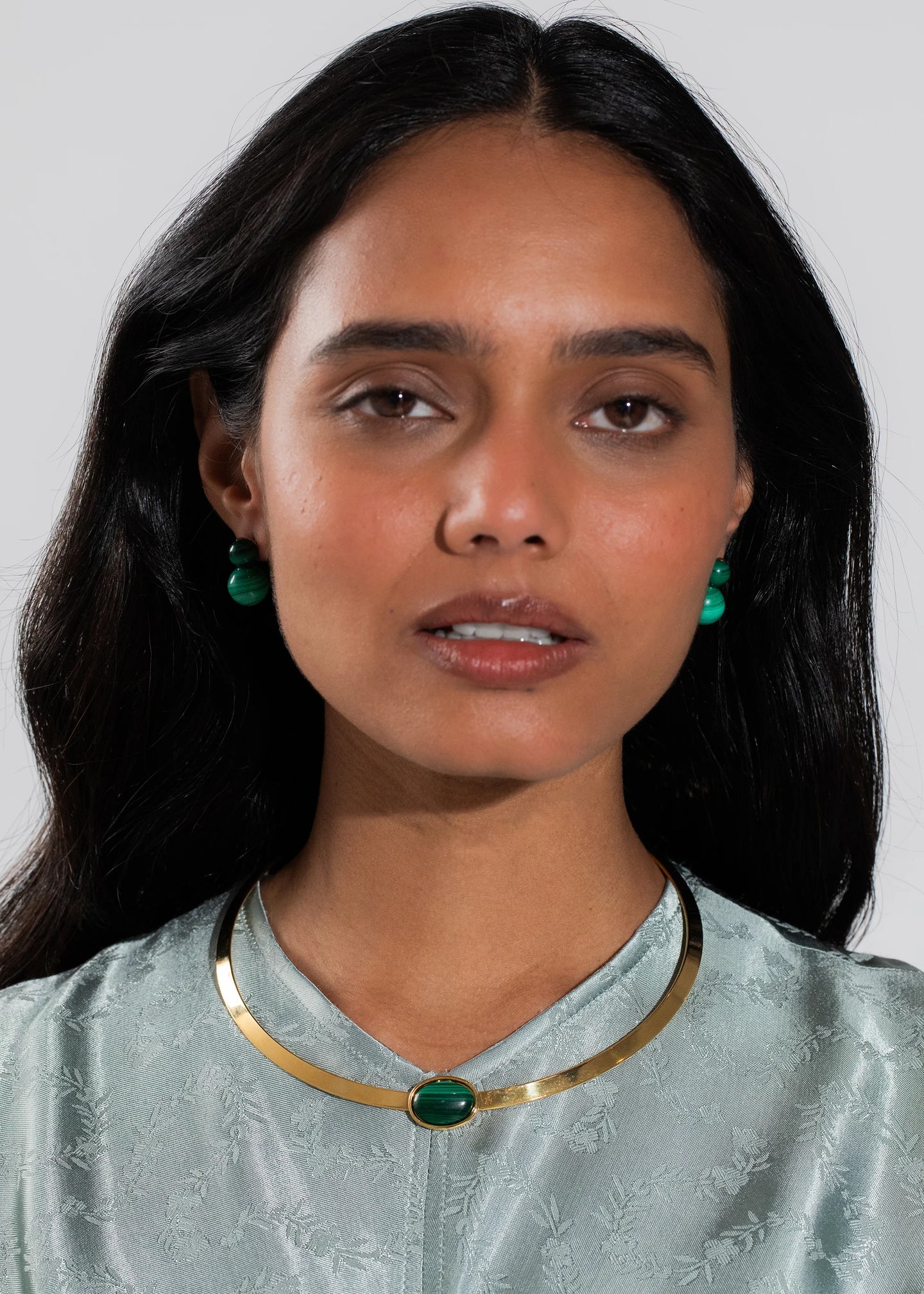 The Elaine Collar is a celebration of two of our favorite semi-precious gemstones, tiger's eye and malachite. Sourced from France, the 18-karat gold-plated collar is Jennifer's all-time favorite, as it sits flawlessly on the neck, grazing the collarbone. The sleek simplicity of the collar and bezel setting perfectly highlight the beauty and idiosyncrasies of each gem.