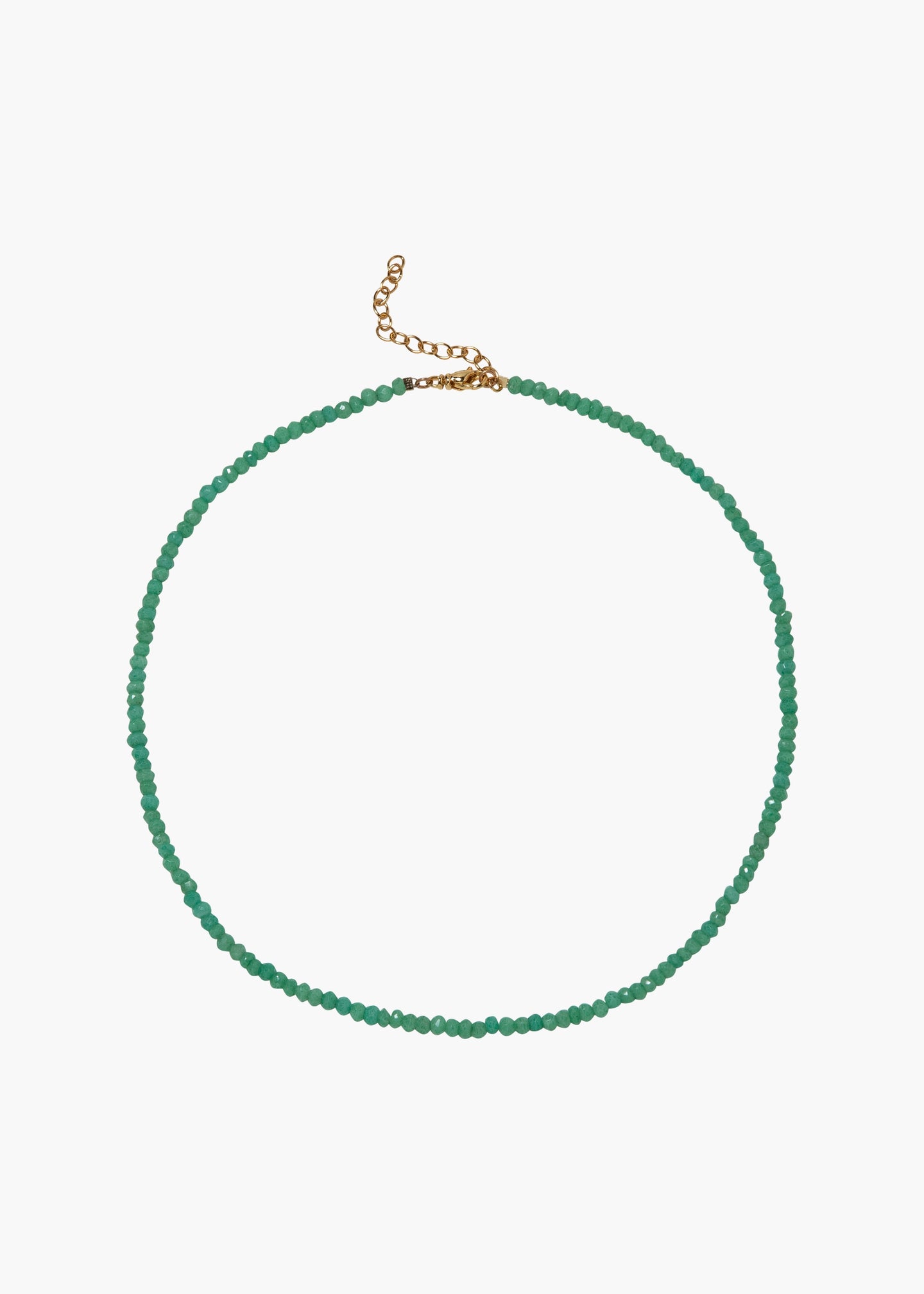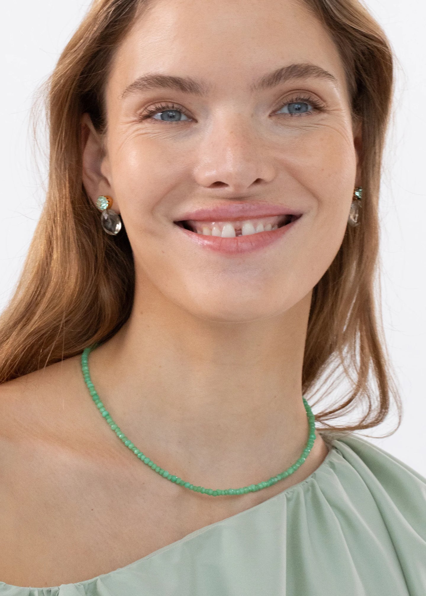 The Ersa Necklace is hand-beaded with semi-precious stones, forming the ultimate layering piece. This necklace is designed to be mixed and stacked with other pieces in our Semi-Precious Collection; the extender at the clasp makes it easy to adjust and achieve the desired length, especially when layering with other necklaces. Dimensions: 16" length with 2" extender