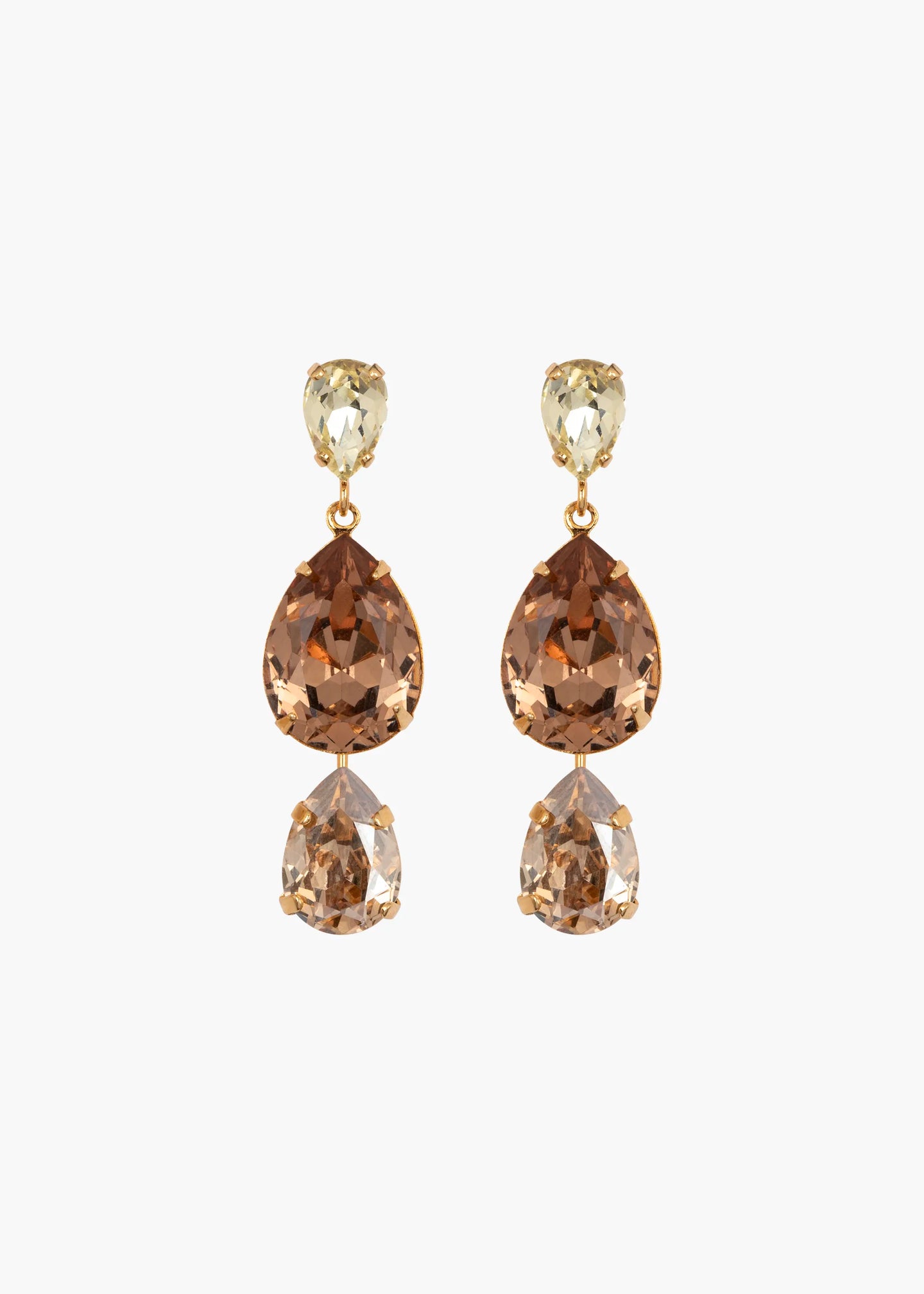 An instant classic, the Natalina Earrings showcase the richness, depth, and sparkle of the fine Austrian crystals that comprise them. Made by hand in New York, the pear-cut stones are set in alternating directions, with an 18-karat gold-plated setting. The linear drop is designed to create flattering, elongated lines. Dimensions: 1 7/8in x 1/2in