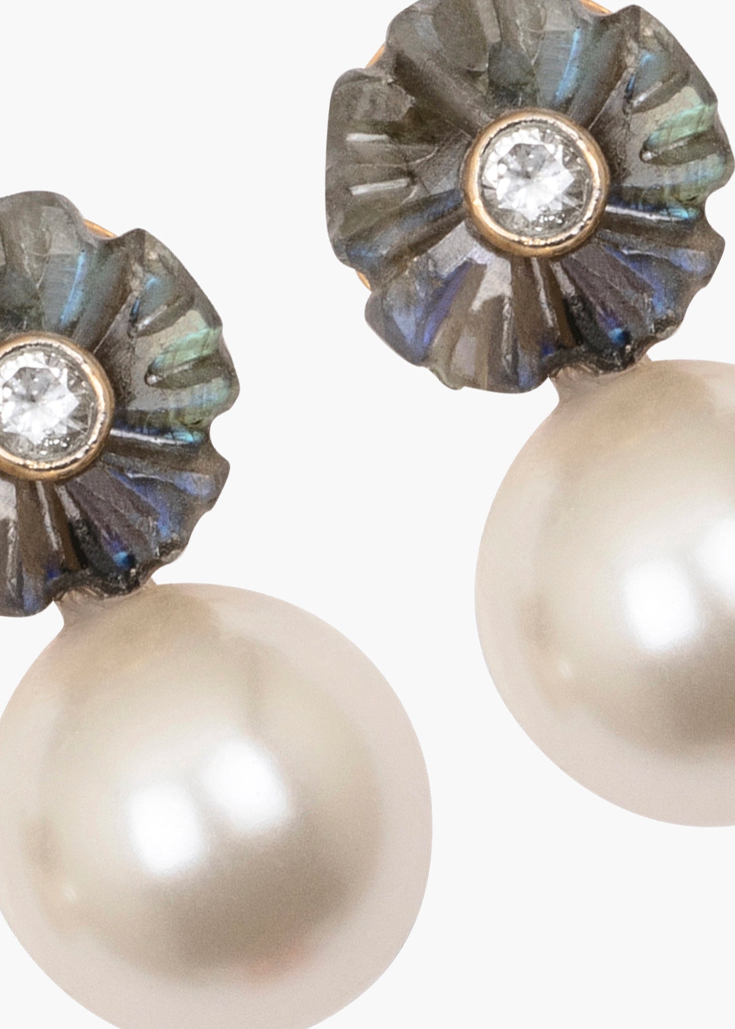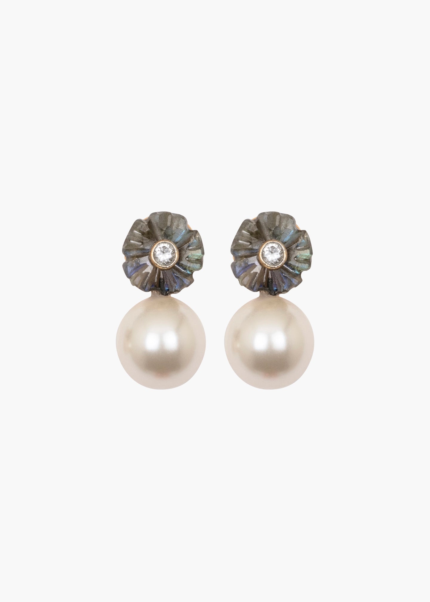 Blurring the lines between fine and costume jewelry, the Libby Earrings combine natural semi-precious stones with Austrian crystal-pearl details. The gemstones are carved by hand into a richly detailed flower shape, with contrasting crystal centers creating an expressive, painterly palette. Made by hand in New York, the unexpected color combinations, along with the scale, keep the look fresh. Dimensions: 1"
