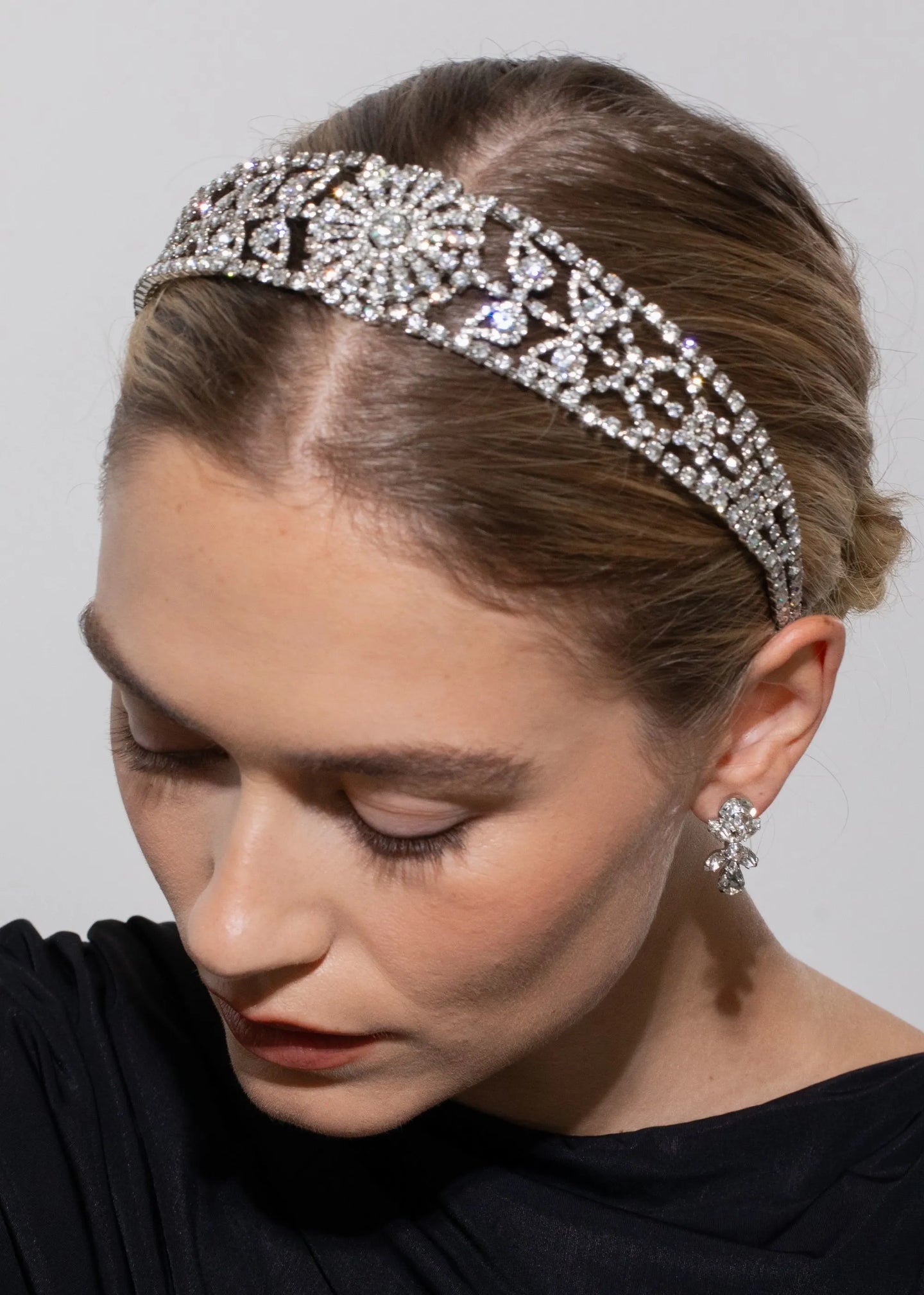 Inspired by antique bandeau tiaras, the ClaraBow Headband has all the makings of a future heirloom. The incredibly intricate details, including a radial center and paisley leaves, create a clever sense of depth on a two-dimensional plane. Made by hand in New York, it's entirely constructed of crystal chain, with a rhodium-plated headband base lays flush against the head.