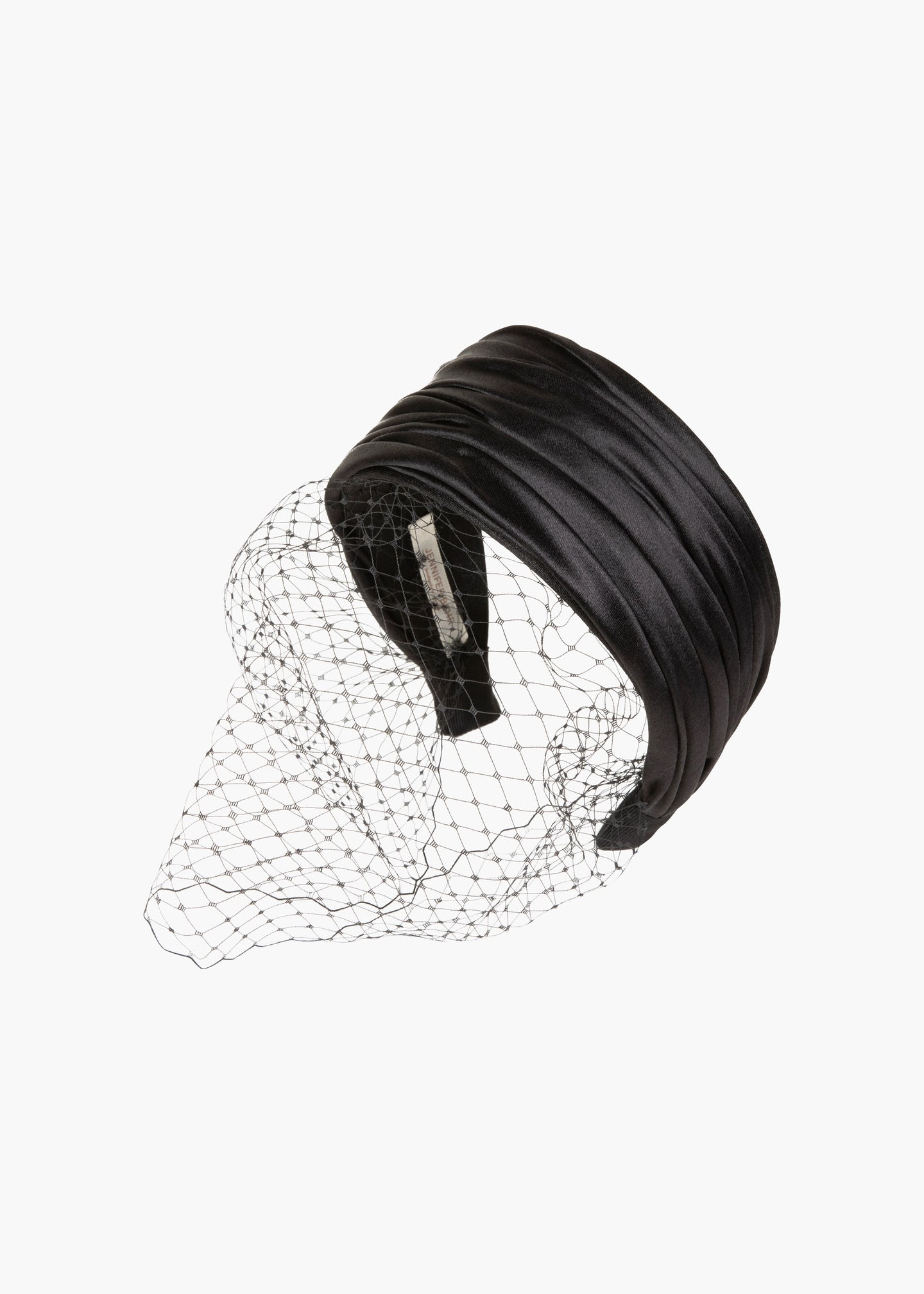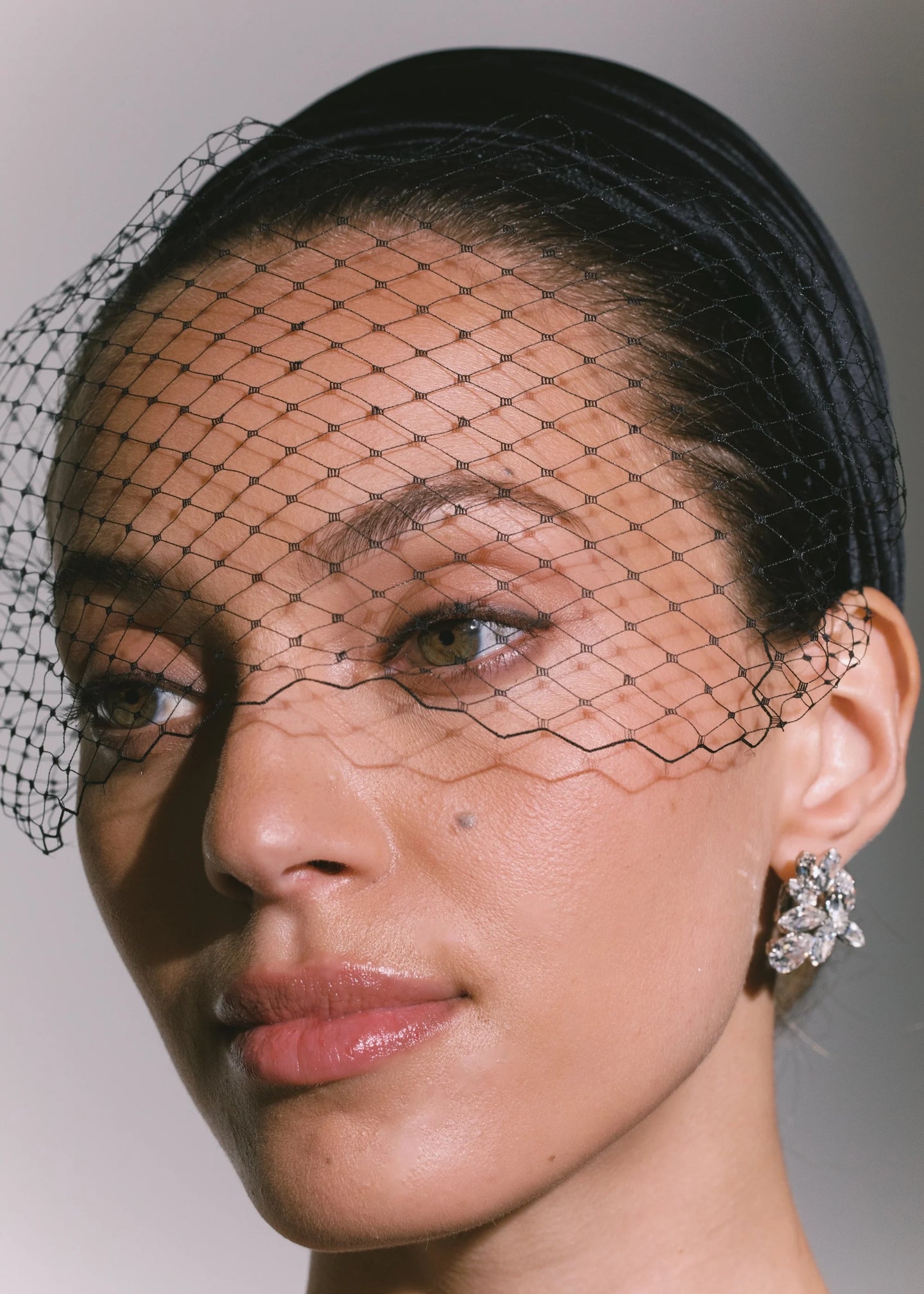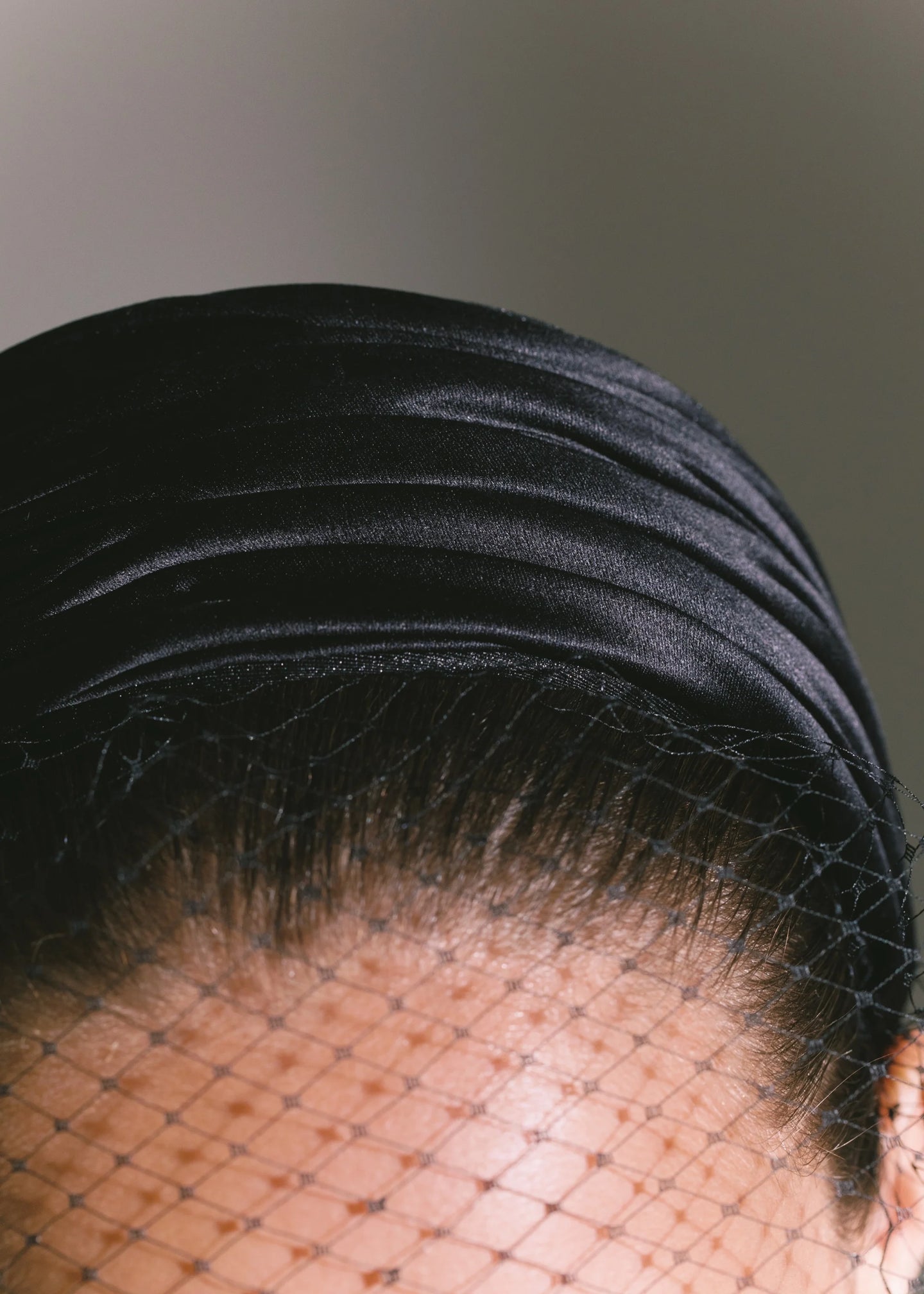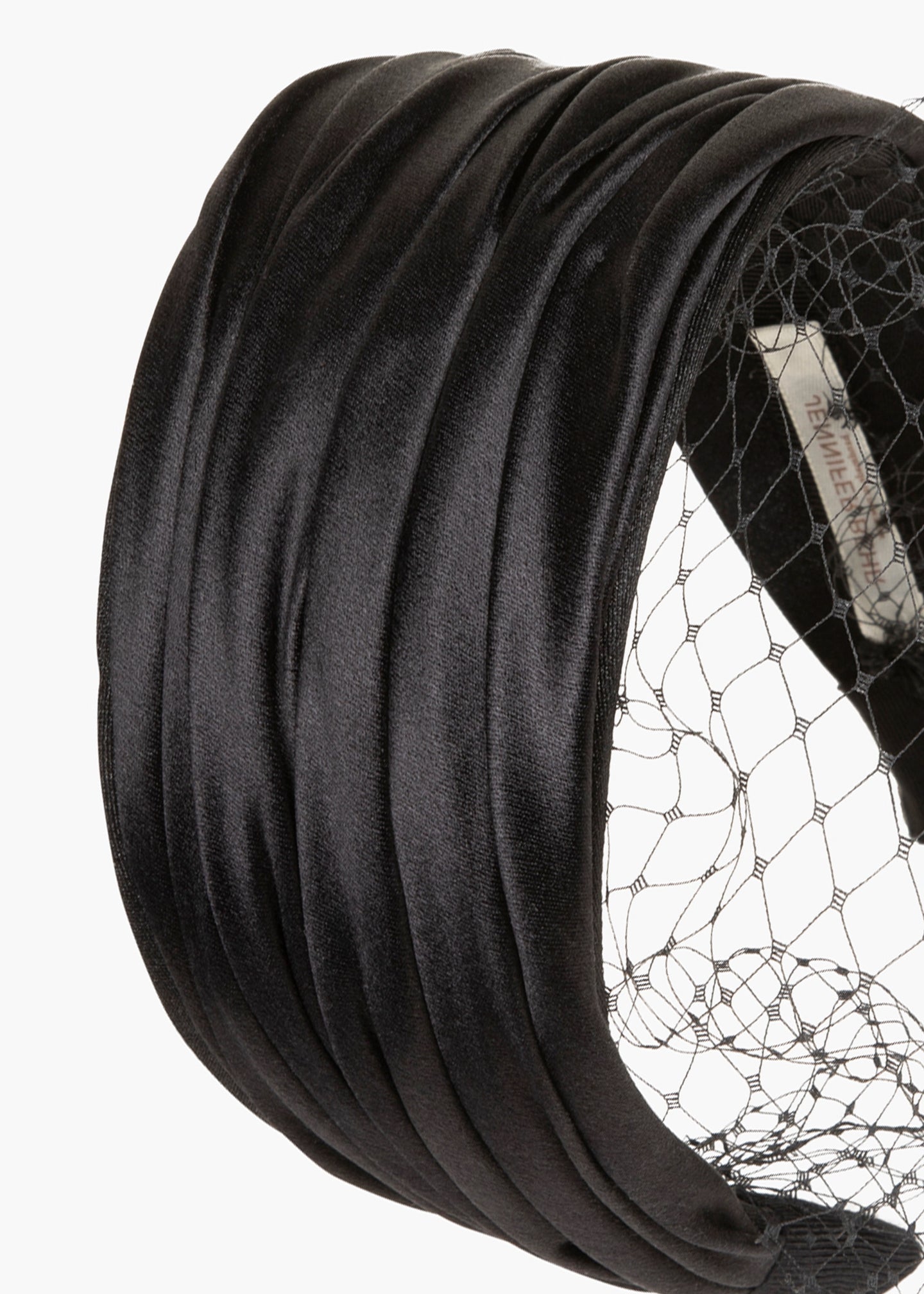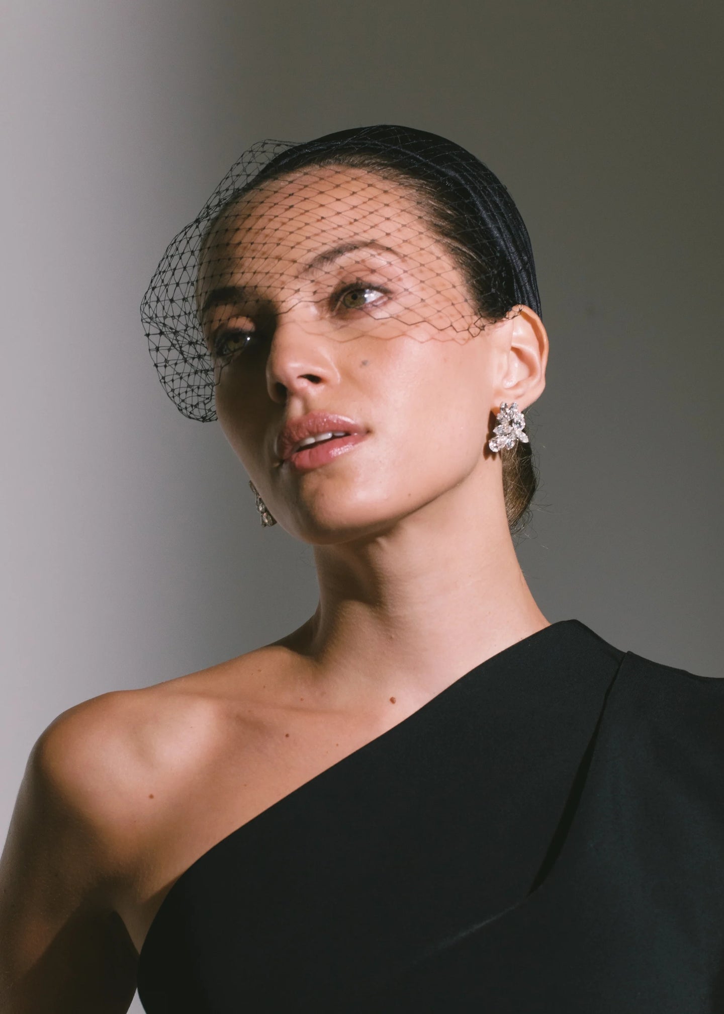 The Jacqueline Voilette Headband is an unforgettable look, with a design informed by classic vintage millinery and 1960s pillbox hats. Its base is handcrafted in Italy, then hand-draped with silk satin in our New York studio, and finished with our iconic veiling. The top of the headband is tilted forward, so that the back stands above the head rather than lying flush, creating dramatic height.