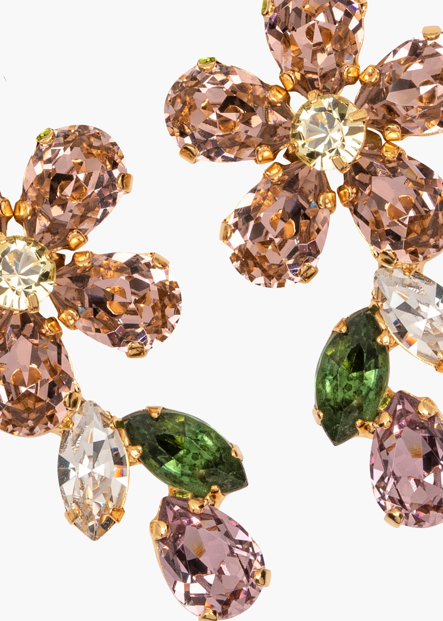 An addition to our iconic collection of crystal flower earrings, the Odelia Earrings have the richly vivid palette of an Impressionist painting. Austrian crystals in an imaginative range of colors and cuts are lodged in an 18-karat gold-plated setting. Made by hand in New York, the placement of each individual stone is carefully considered in the design process, for a finished look that frames the face.