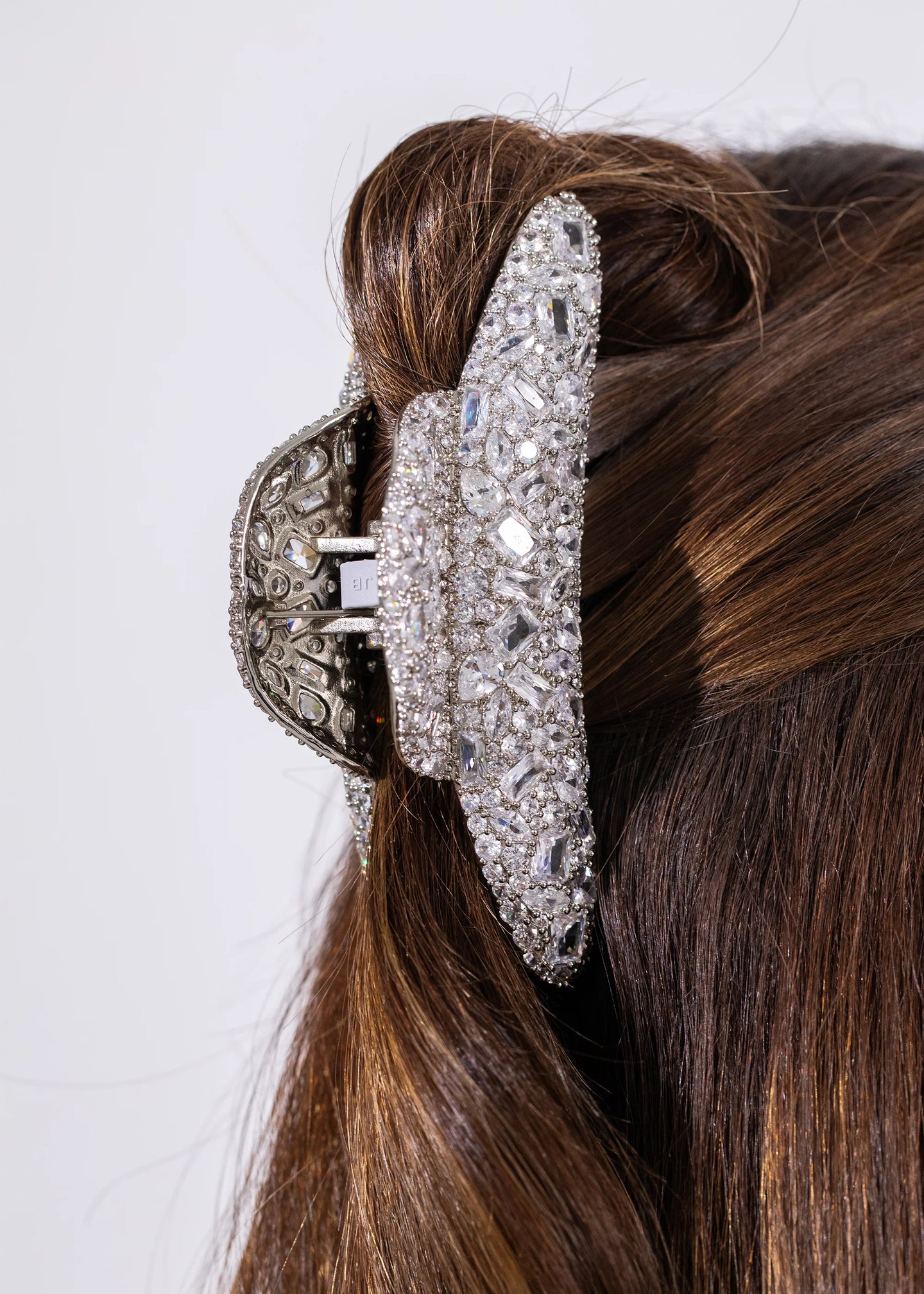 The Czarina Jaw Clip is a rhodium plated brass with Cubic Zirconia pavé crystal inset jaw clip with a silicone spring cover. We recommend treating this clip as you would a piece of jewelry, and storing in the dust bag when not in use. Avoid contact with water, perfume, and other chemicals, including hairspray, which should be used before placement in the hair. Imported.