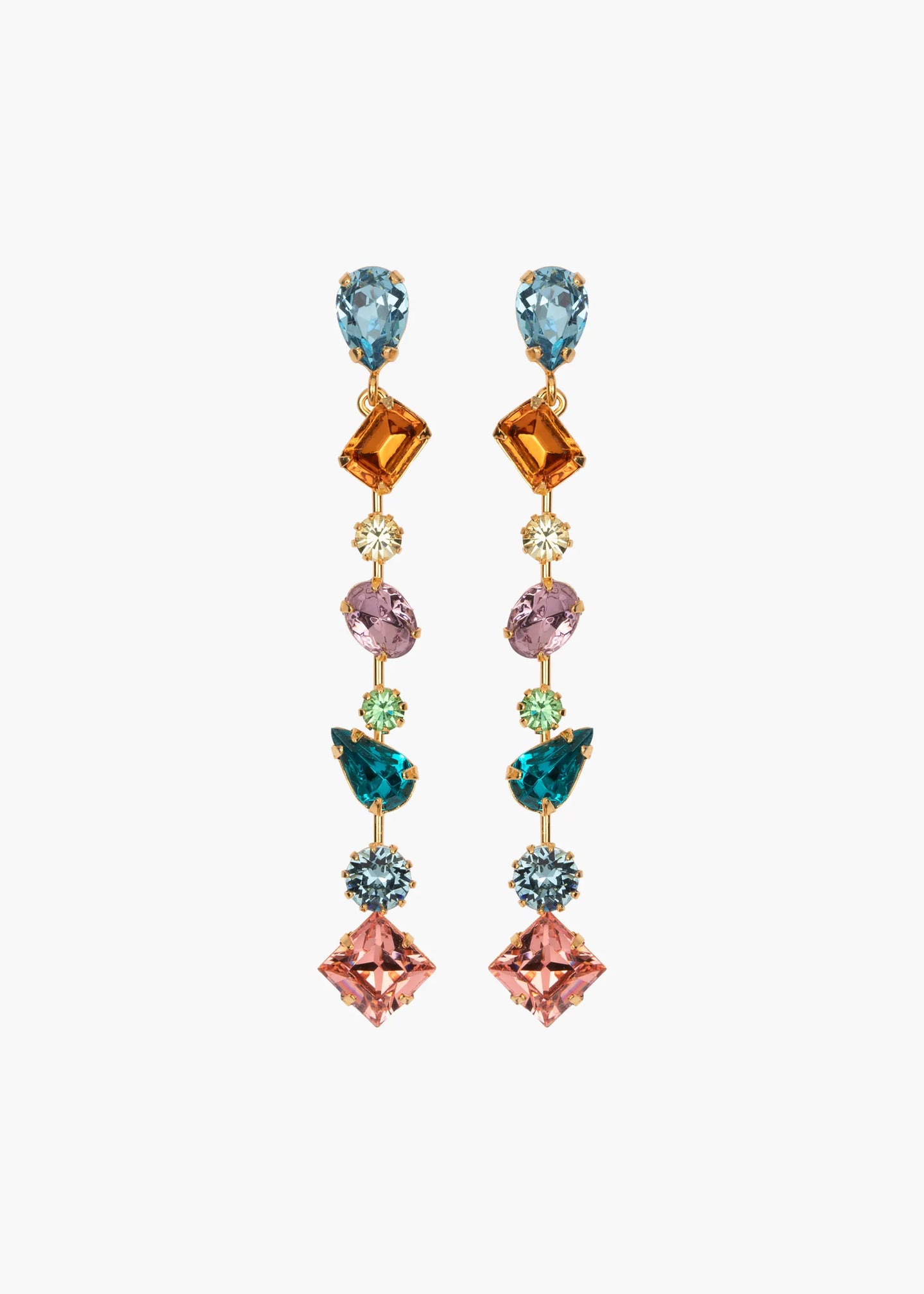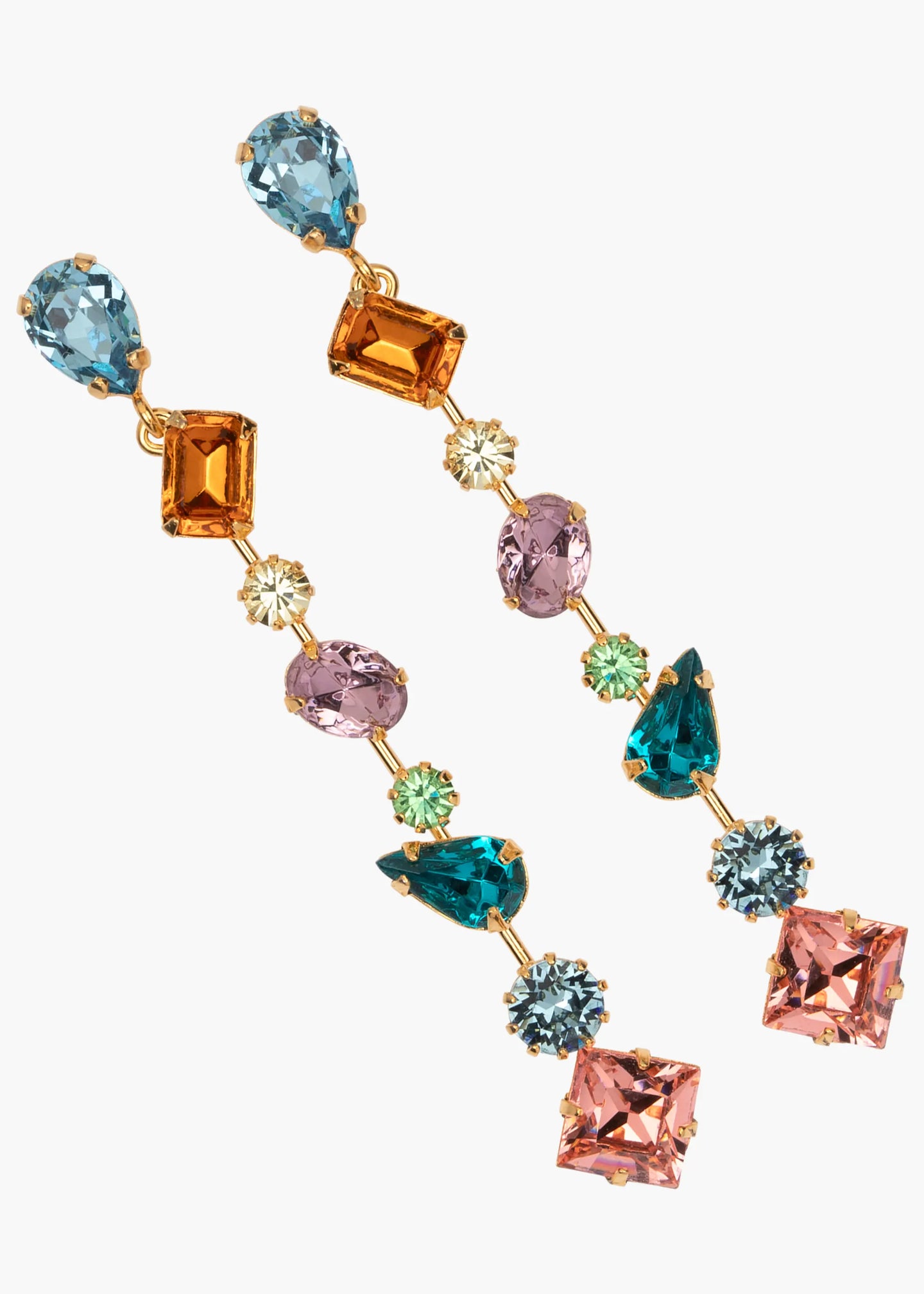 The Lourdes Earrings deliver a striking, modern sparkle. Crafted with a sleek rhodium finish, this linear silhouette features alternating Czech crystals in mixed cuts—each one catching the light in its own unique way. The varied shapes create a refined sense of movement, while the surgical steel post offers comfortable, effortless wear. Elegant, dimensional, and endlessly versatile, they’re a luminous finishing touch for day or night. Dimensions: 2 7/8in x 3/8in