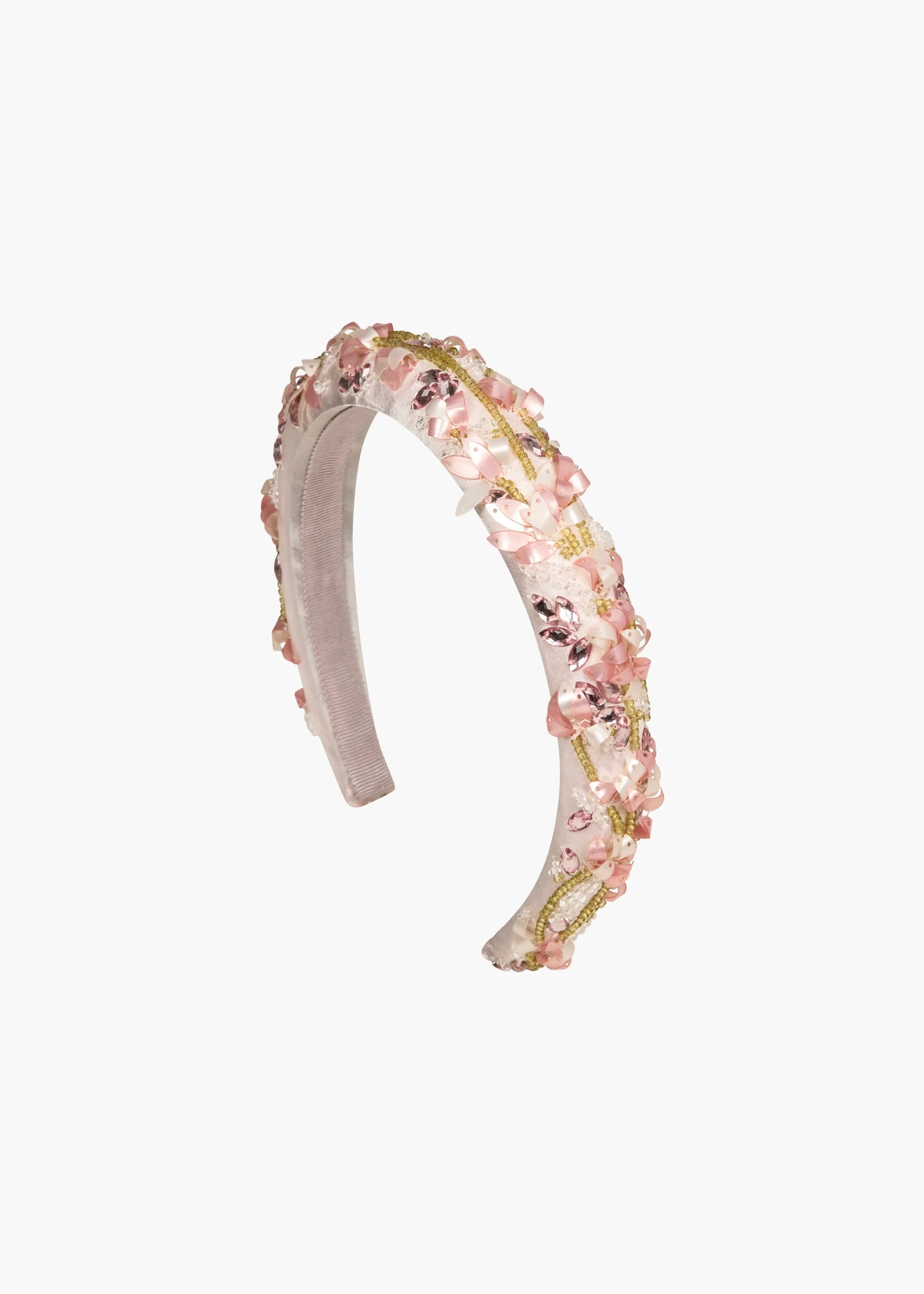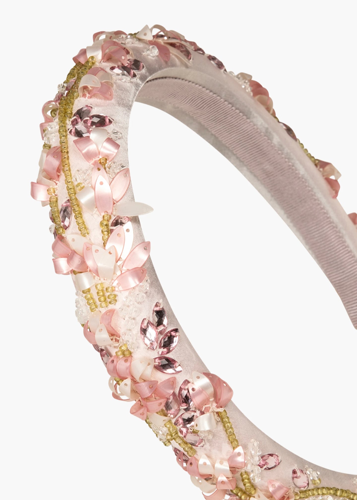 The Oleander Headband is a study in luminous, hand-finished detail. Petal-shaped sequins and crystals are intricately embroidered to form delicate floral motifs across the silhouette, trailing over Czech crystal beaded stems. Crafted on our signature silk satin–covered padded headband base, it offers a soft, comfortable fit while showcasing exquisite detail. Romantic, radiant, and artfully crafted—it’s an heirloom-worthy piece for any occasion.
