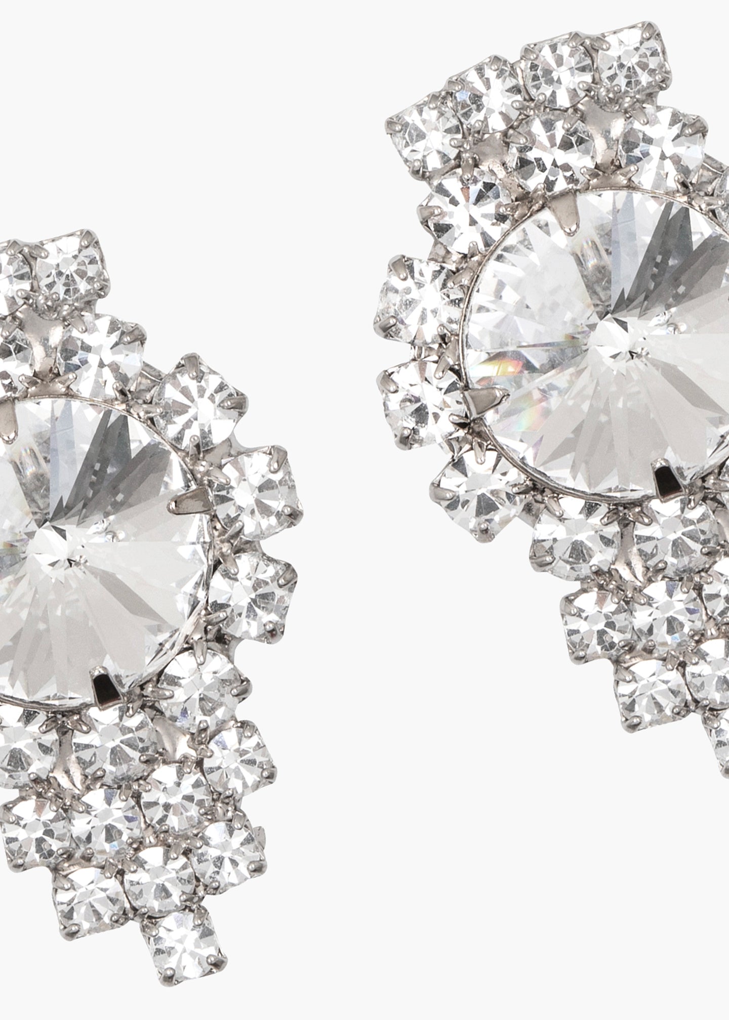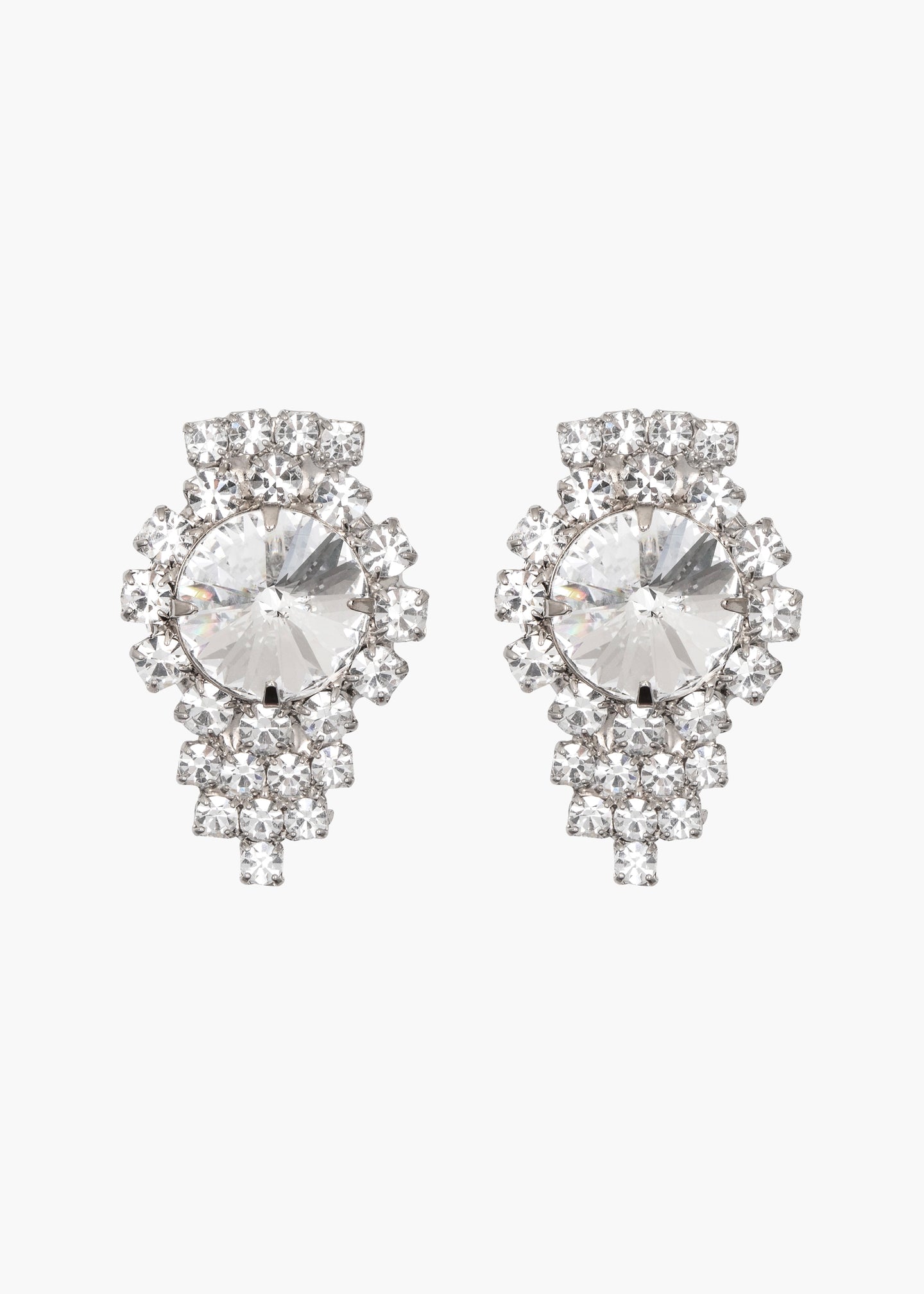 Inspired by Art Deco wonders like the Chrysler Building, the Oriana Earrings have that same geometric appeal. Made by hand in New York, striking round-cut Austrian crystals are enveloped in a graphic arrangement of smaller stones. These earrings pair well with hair accessories and headbands in our collection. Dimensions: 1.7" x 1"