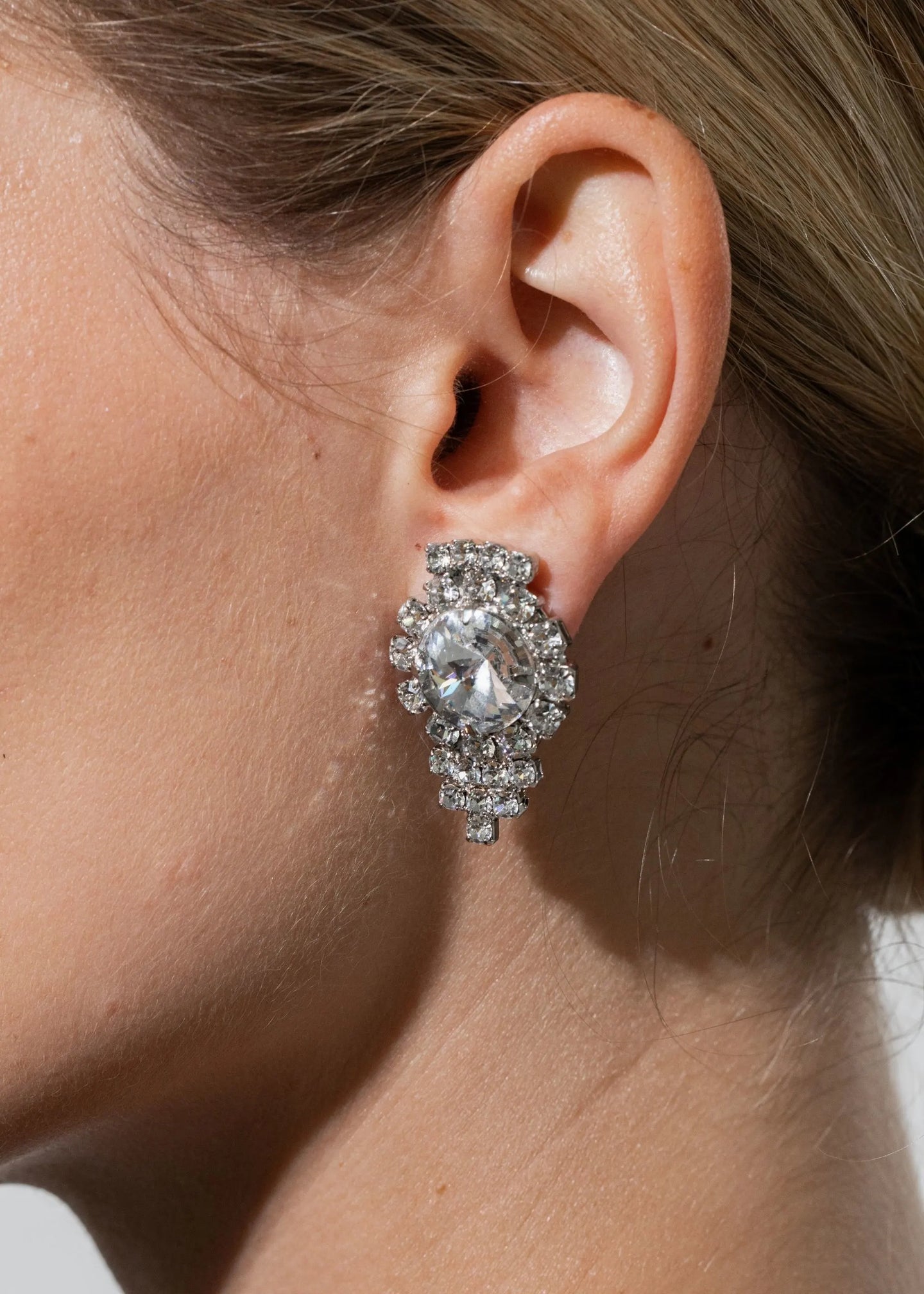 The Oriana Earrings are made by hand in New York from Austrian crystals and rhodium plated brass. They have a surgical-steel post, are nickel-free and safe for sensitive skin. We recommend storing earrings in their dust bag while not in use, and avoiding contact with water, perfume, hairspray, and other chemicals.