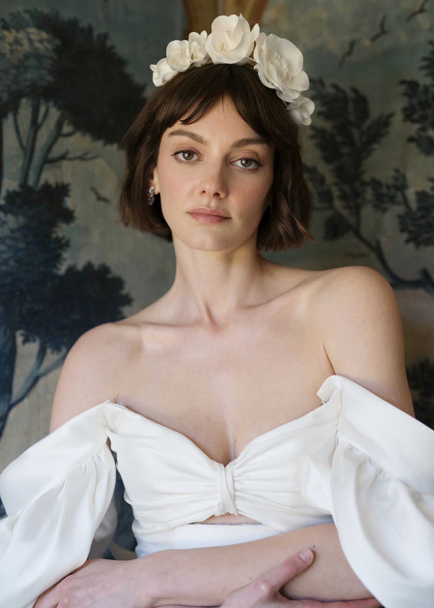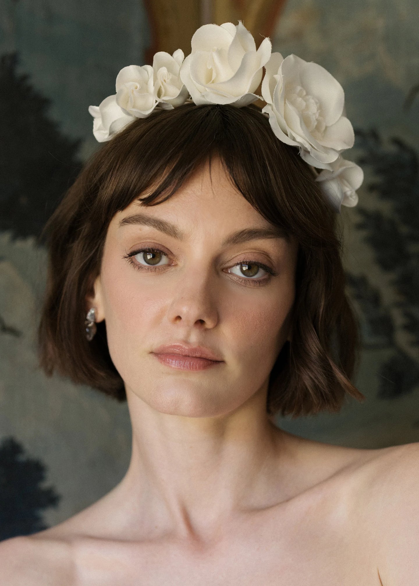 The Rosalia Vine headband is crafted in New York from hand-made silk duchesse satin rose vine floral motifs on a silk ribbon wrapped flexible steel base for weightless comfort. We recommend storing headbands in their dust bag while not in use. Avoid contact with water, perfume, and other chemicals, including hairspray, which should be used only before placement in the hair.