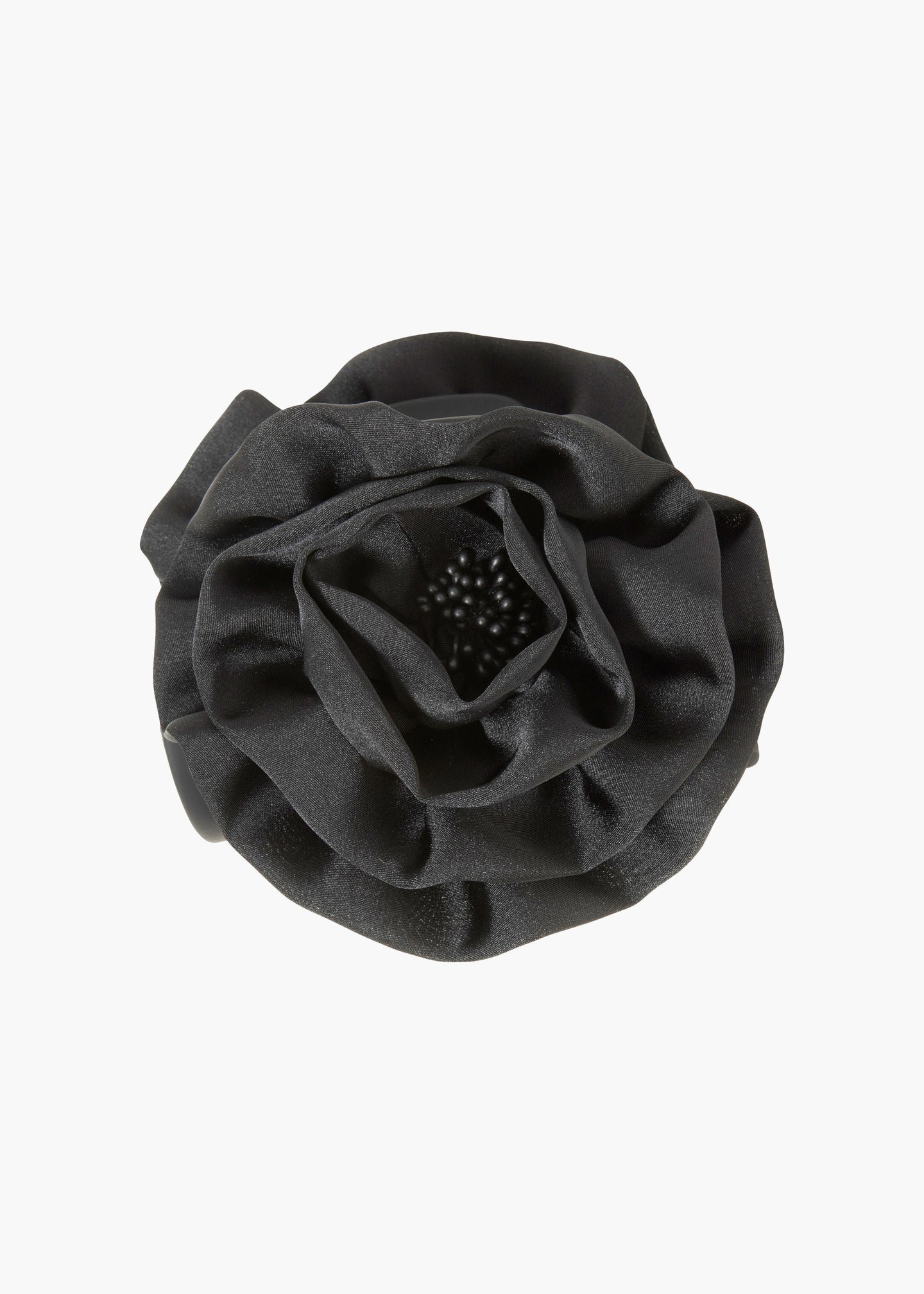 The Rose Jaw Clip is crafted from pure silk, uniquely draped by hand to form a rosette. This easy-to-wear accessory is complete with elevated details, including a textured center, which forms the flower's pistil. It's mounted on a sturdy acetate resin claw clip, for secure placement no matter how you style it. Dimensions: 3.5 inch width, 3 inch length