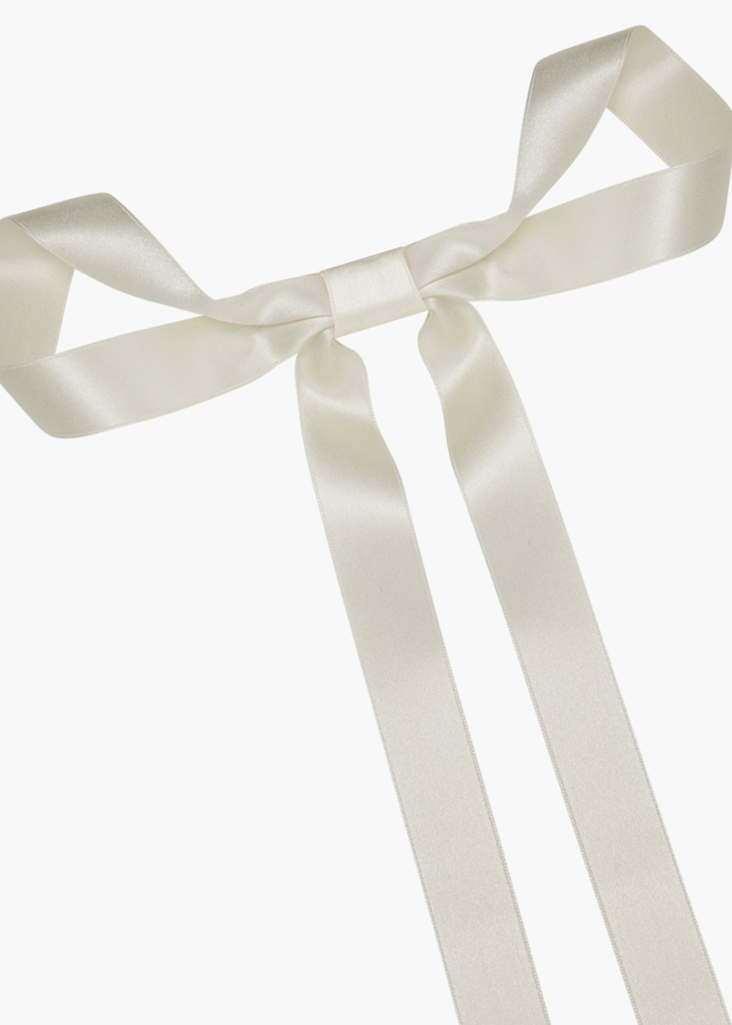 The Gretta Bow Barrette is made by hand in New York of silk ribbon and finished with a steel French barrette closure. We recommend treating this bow as you would a piece of jewelry, and storing in the dust bag when not in use. Avoid contact with water, perfume, and other chemicals, including hairspray, which should be used before placement in the hair.