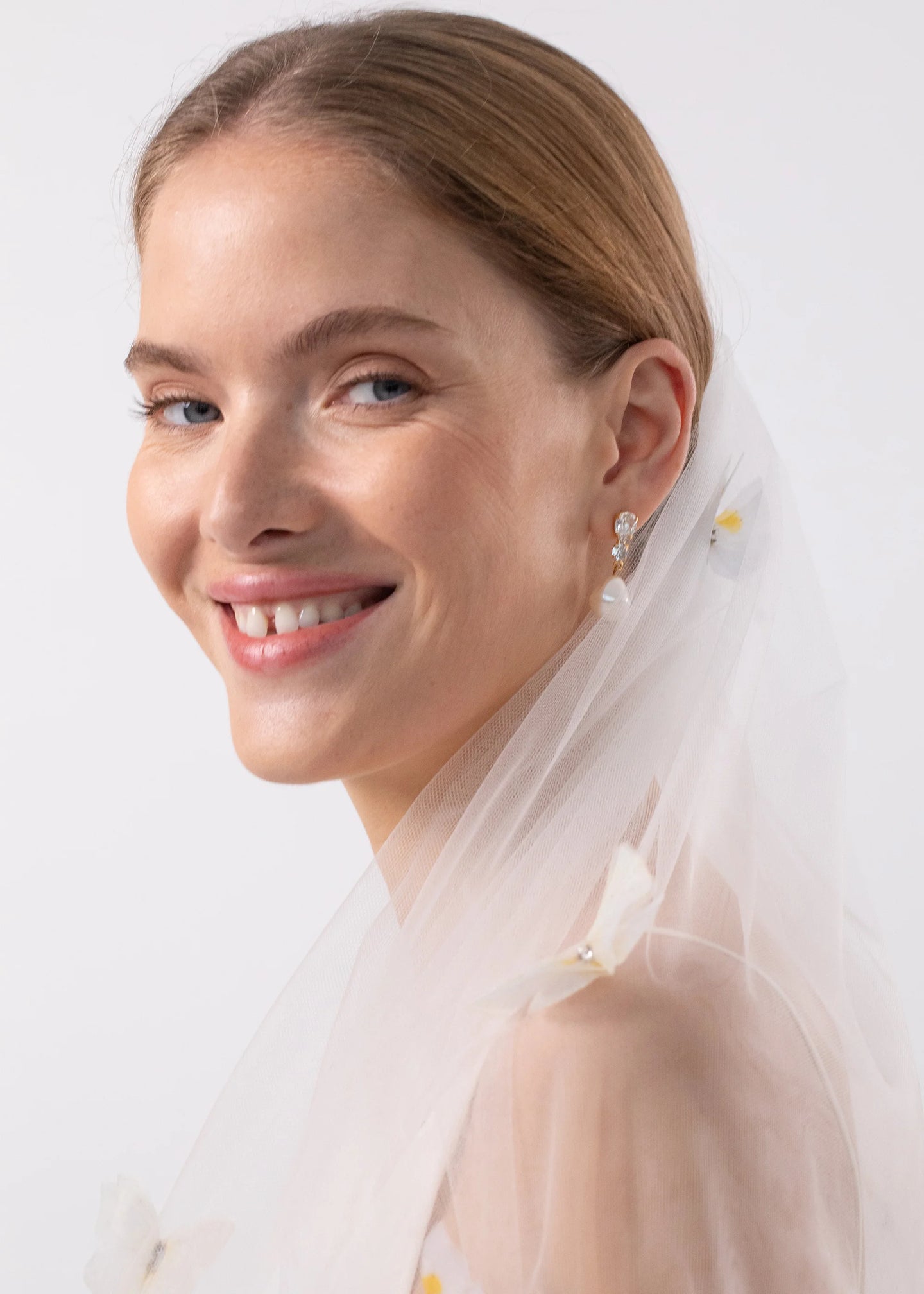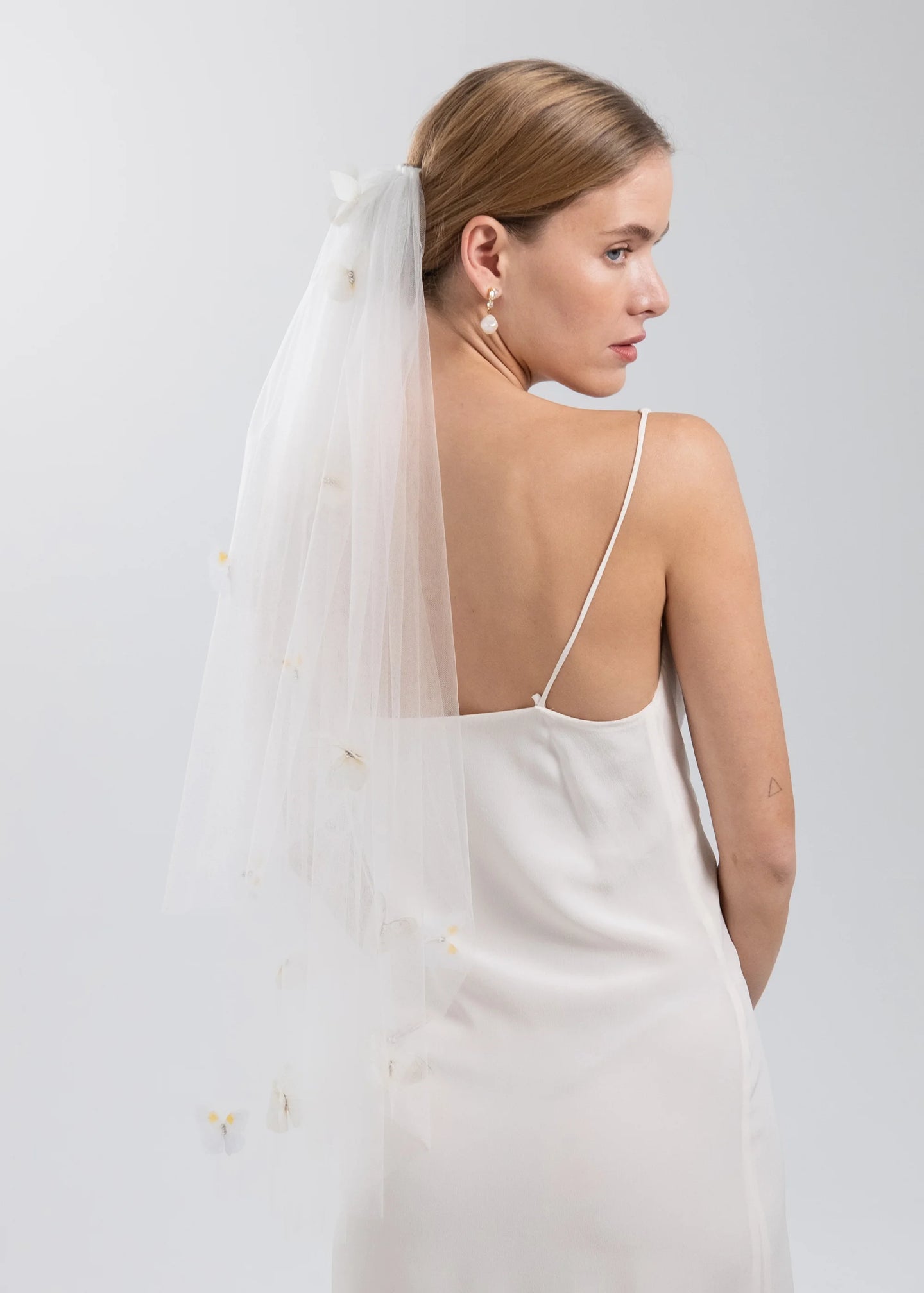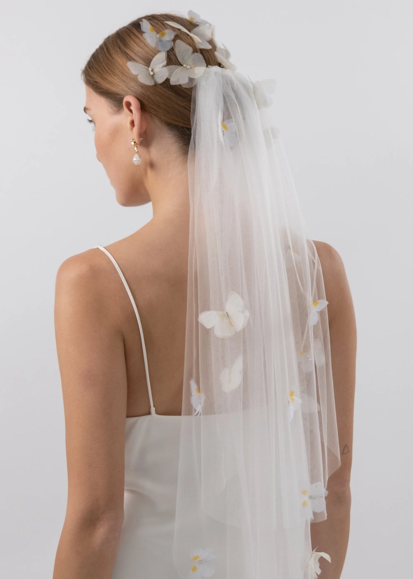 Drawing inspiration from vintage millinery, with layers of elbow-length tulle, the Allira Veil is a breathtaking touch that makes a look your own. Made by hand in New York, the silk chiffon butterflies feature a custom engineered print, ensuring the precise point of the pattern aligns with a specific area of the butterfly shape, creating an incredibly lifelike effect— the chiffon lends a certain airiness, so the butterflies delicately tremble as you move. Layer in our our Allira Bobby Pin Set to complete the look.