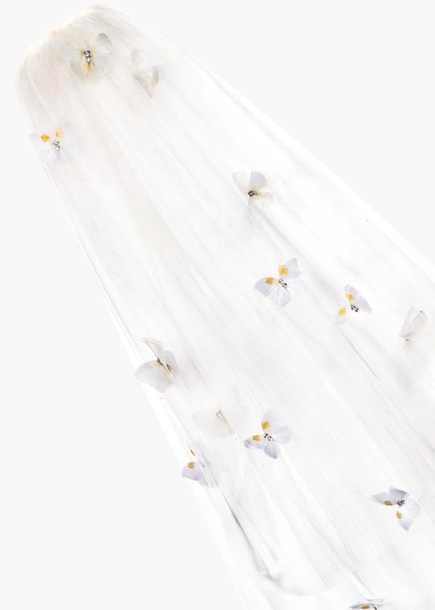The Allira Veil is made by hand in New York from illusion tulle veil featuring scattered silk chiffon butterflies on a rhodium plated comb for ease of placement in the hair. We recommend storing veils hung vertically in a secure place. Avoid contact with water, perfume, and other chemicals, including hairspray, which should be used only before placement in the hair.