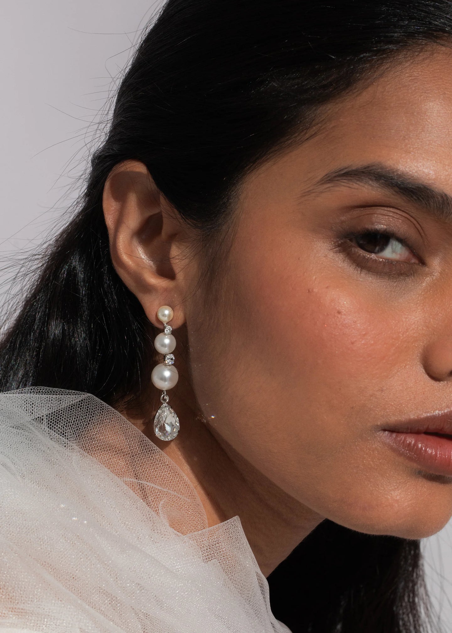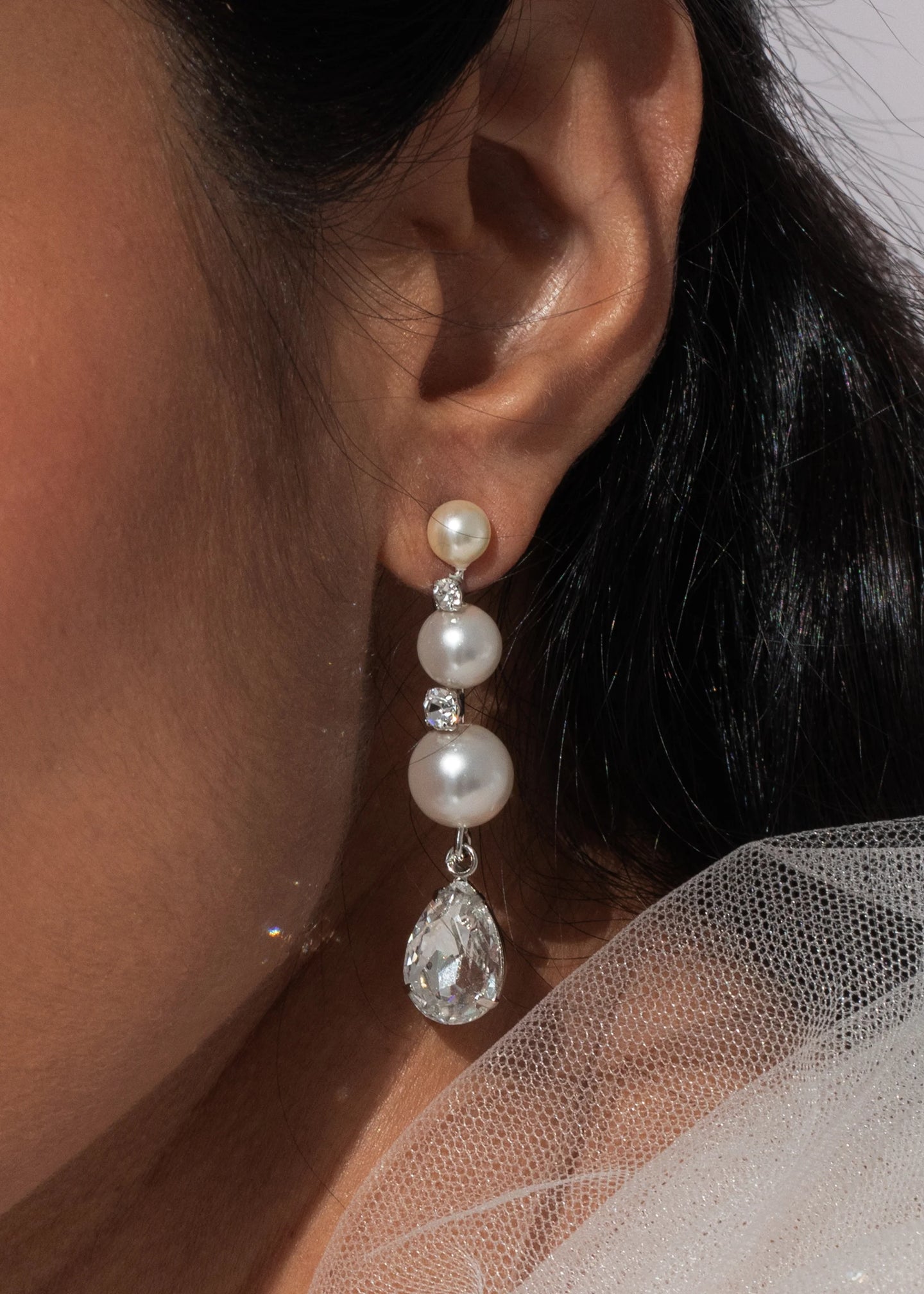 The utter definition of timeless style, the Corisande Earrings combine crystal and pearl in a linear drop earring. Each one is made by hand in New York, plated with 18-karat gold or rhodium, and set with Austrian crystals and crystal pearls. The pear-cut crystal trails in a hinged drop, adding movement to the dynamic look. Dimensions: 2in x 3/8in