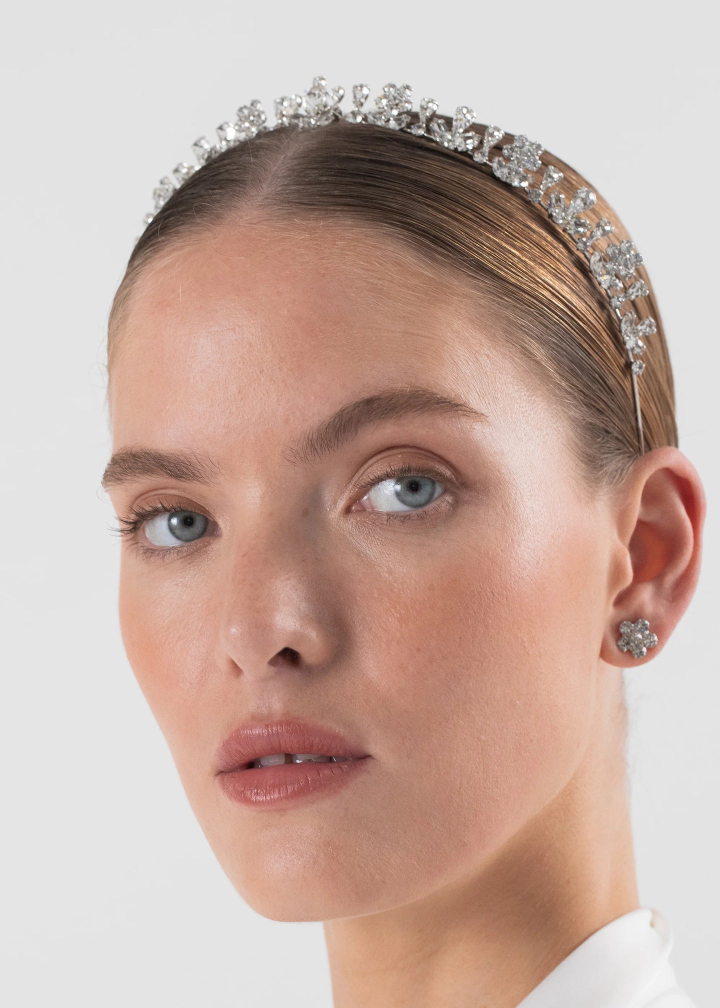 The Anne Tiara is made by hand in New York of rhodium plated brass and crystals. We recommend treating this tiara as you would a piece of jewelry, and storing in the dust bag when not in use. Avoid contact with water, perfume, and other chemicals, including hairspray, which should be used before placement in the hair.