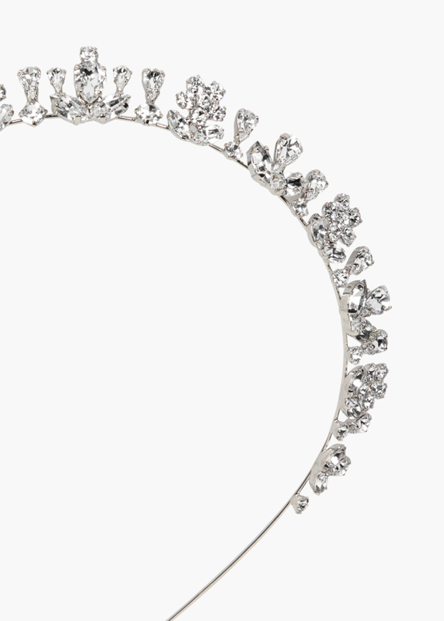 The Anne Tiara is a modern interpretation of "fringe-style" royal tiaras from the late 1800s and early 1900s. Channeling that Edwardian romance, fine Austrian crystals in a variety of cuts form a striking motif that complements a wide range of dress styles. Made by hand in New York, the fine rhodium-plated base disappears in the hair, giving the illusion of a halo of gems.