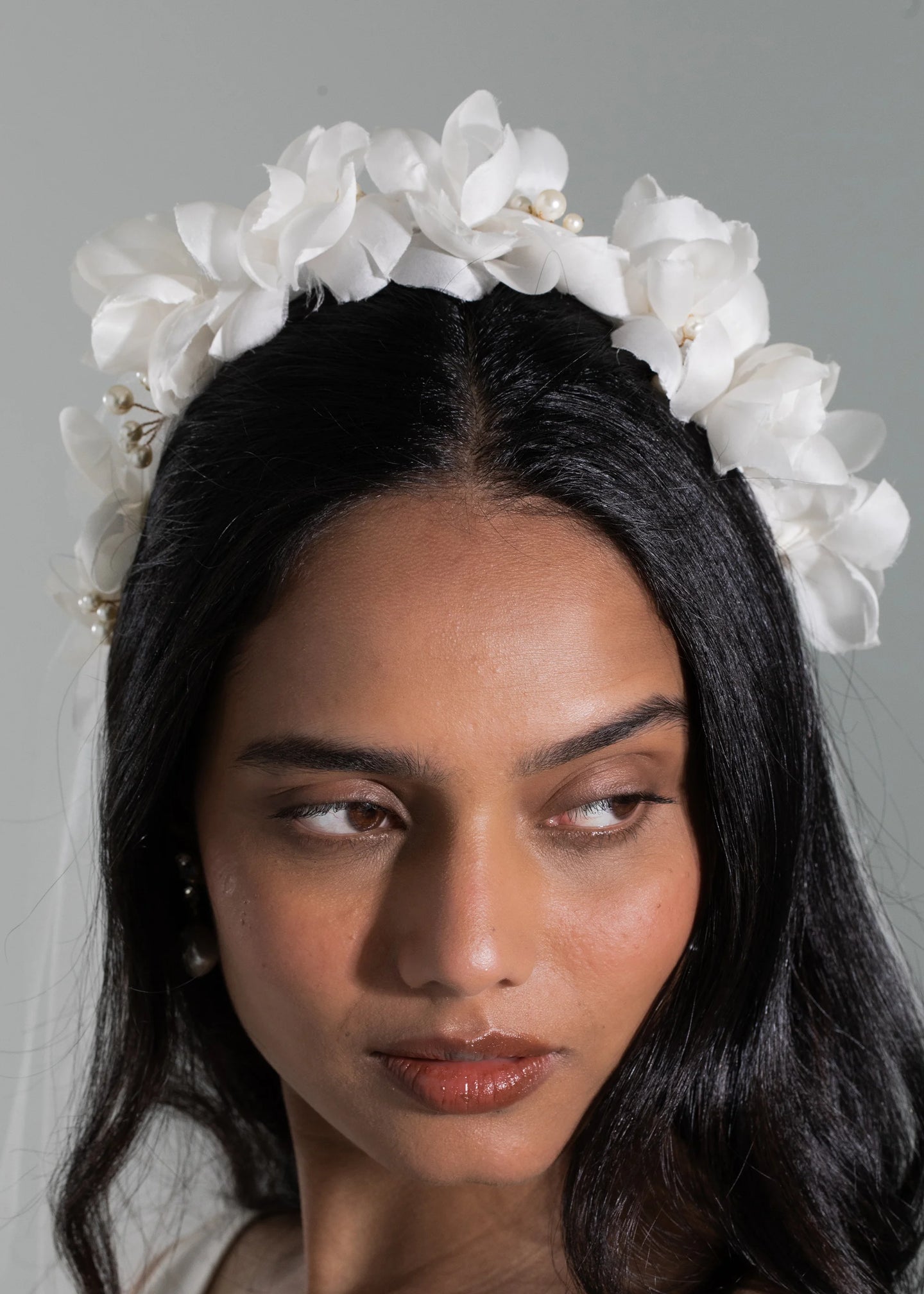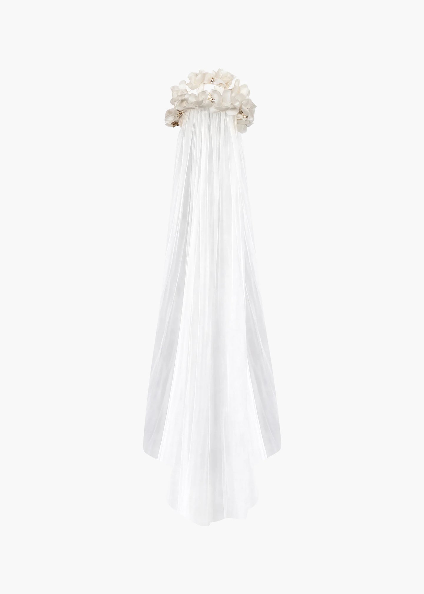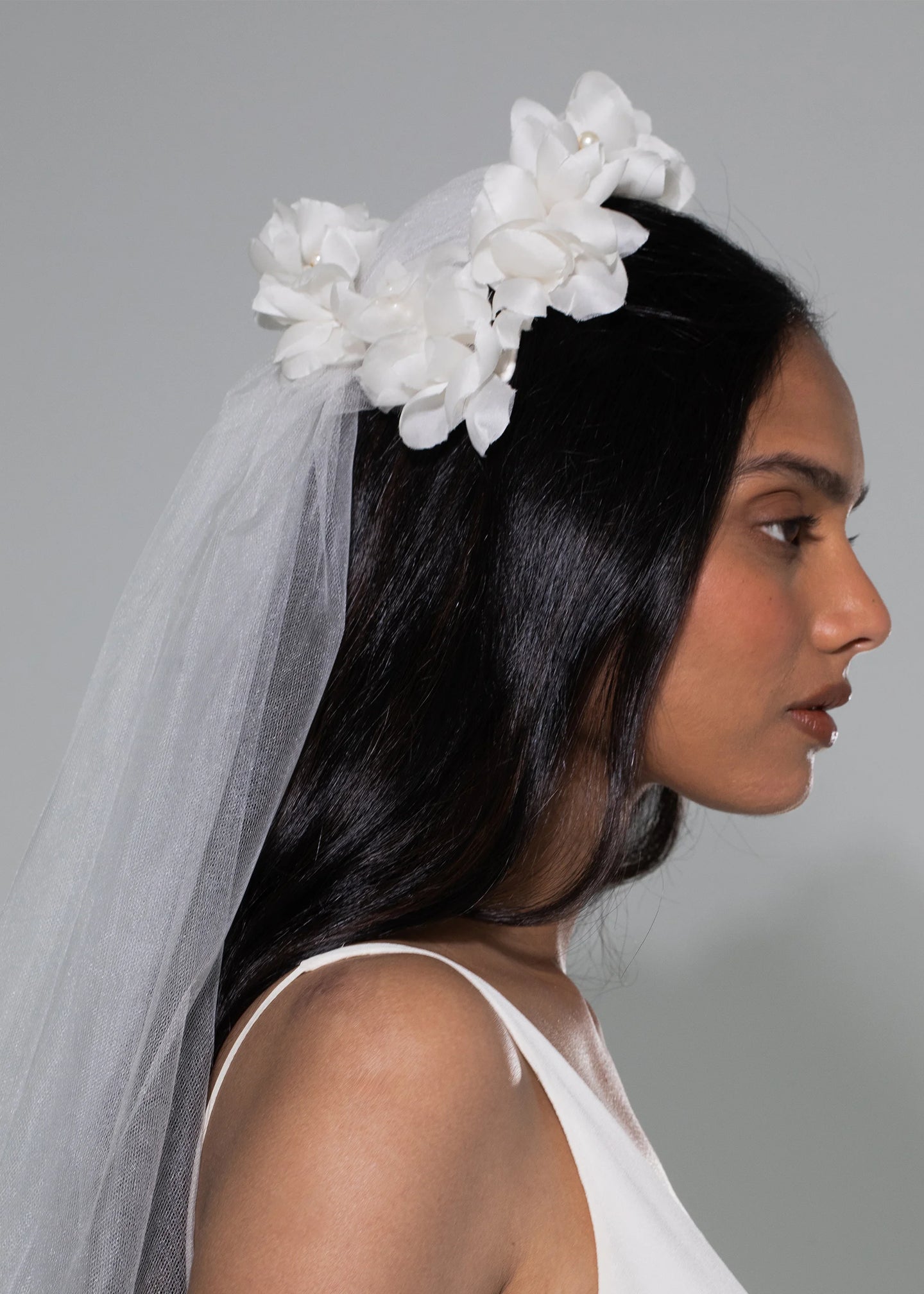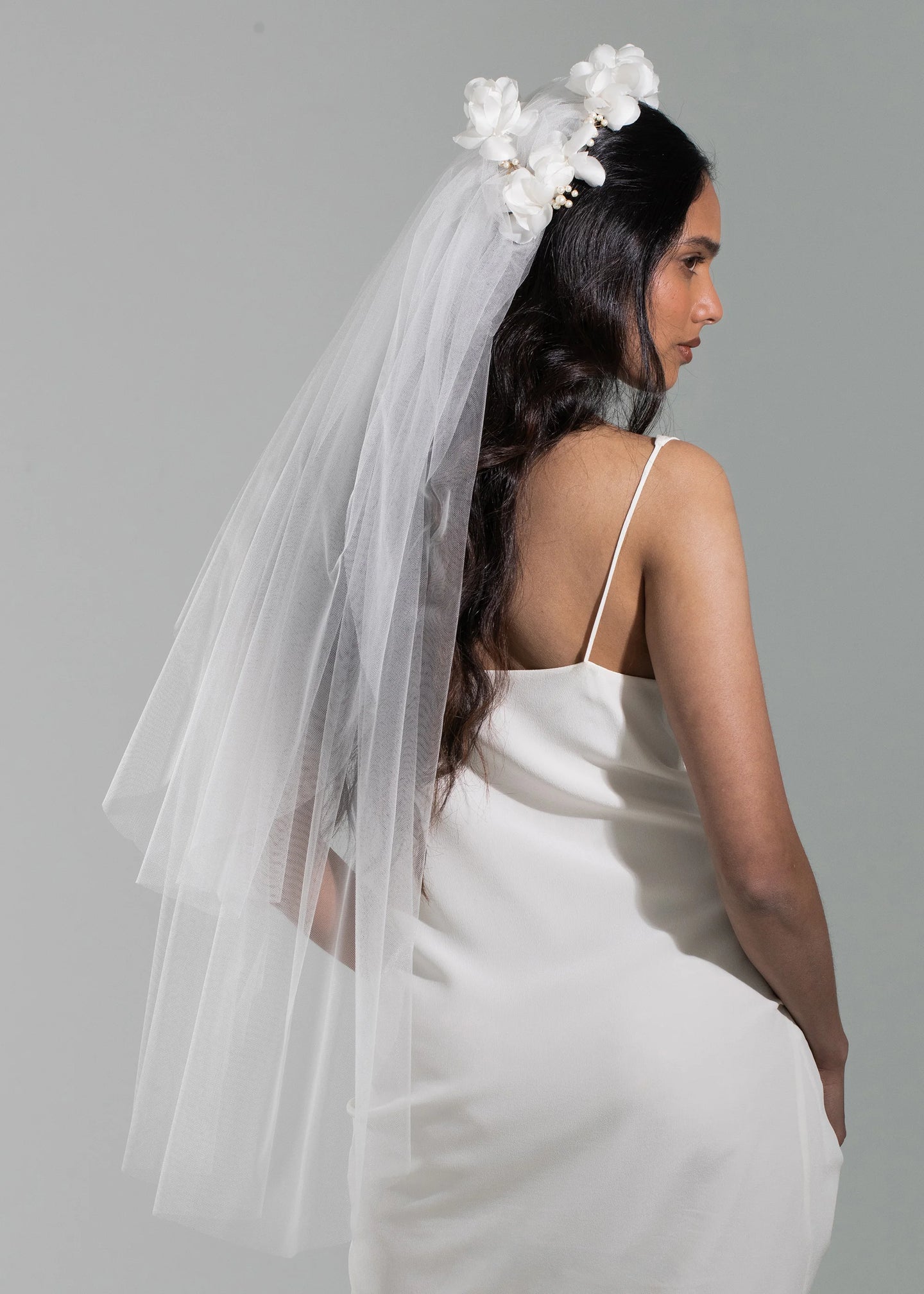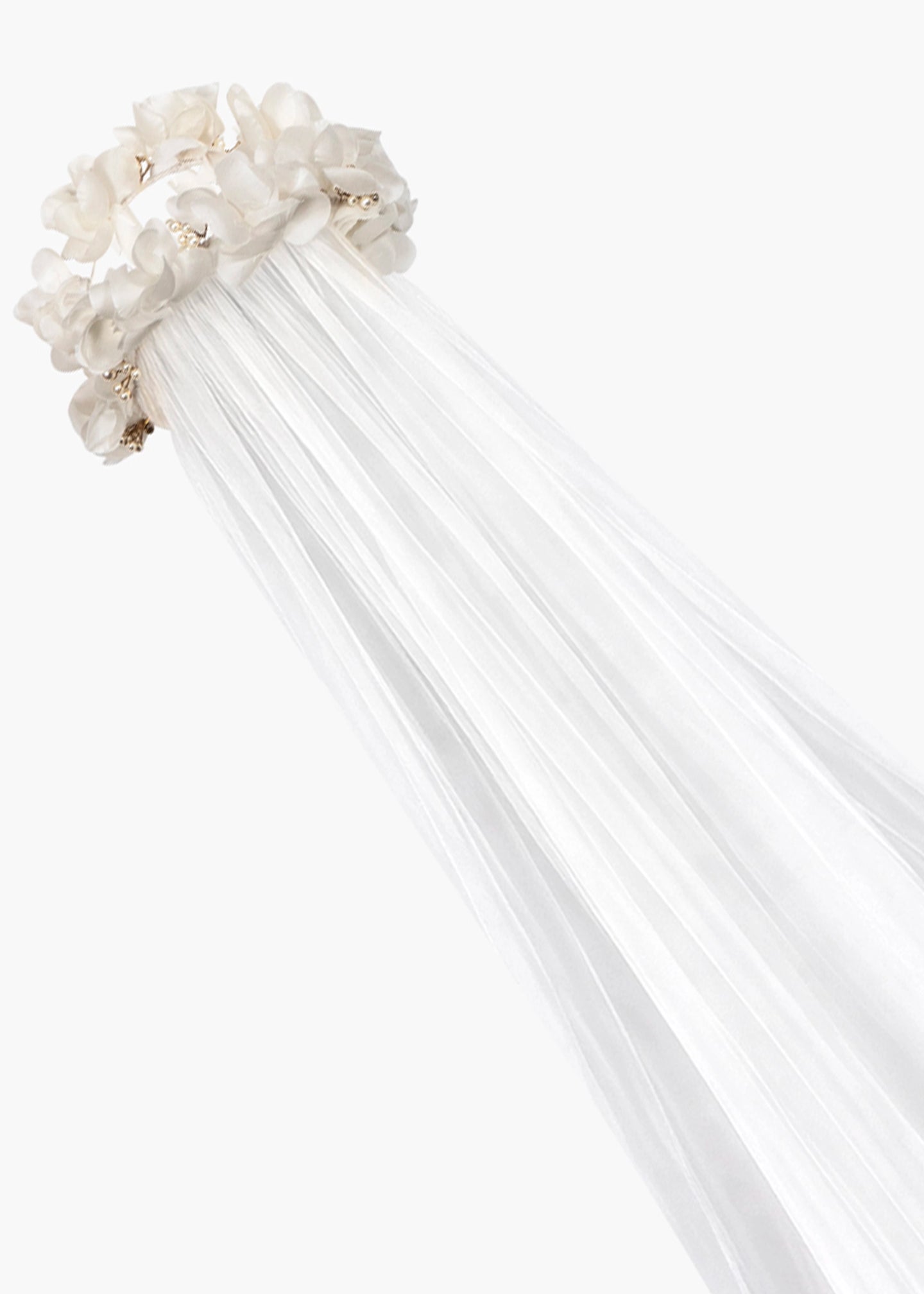 The Leyla Juliette Veil is made in by hand New York from hand-formed silk organza flowers, adorned with crystal pearls and formed into a coronet-style Juliet cap with an illusion tulle veil. We recommend storing veils hung vertically in a secure place. Avoid contact with water, perfume, and other chemicals, including hairspray, which should be used only before placement in the hair.