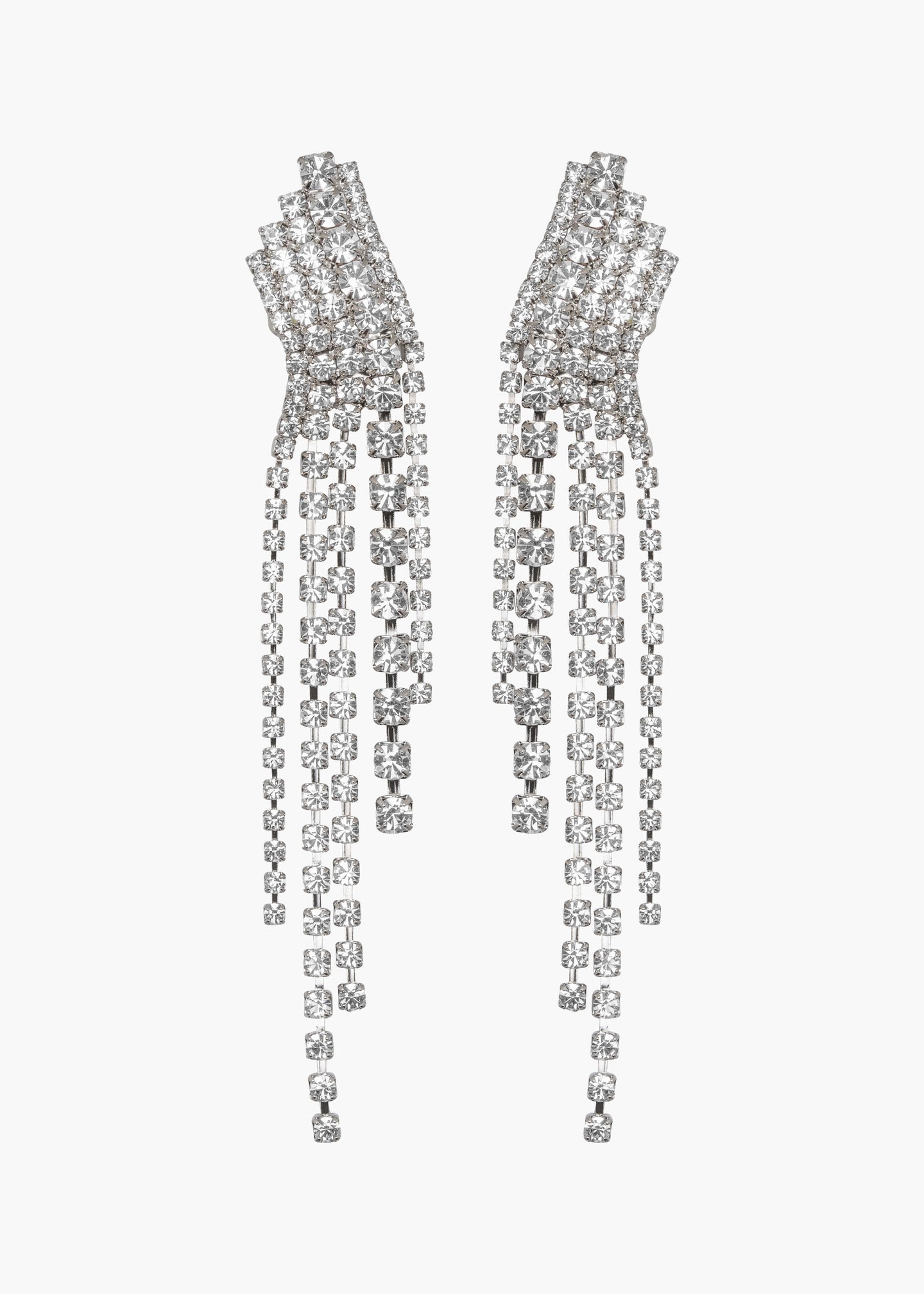A Gatsby-inspired statement, the Zayla Earrings guarantee good times. Made by hand in New York, the crystal chains travel up the ear in a geometric shape, each chain eventually breaking free to give way to strands of free-flowing crystal fringe. The movement magnifies the sparkle, casting beams of light with your every turn. Dimensions: 4" length