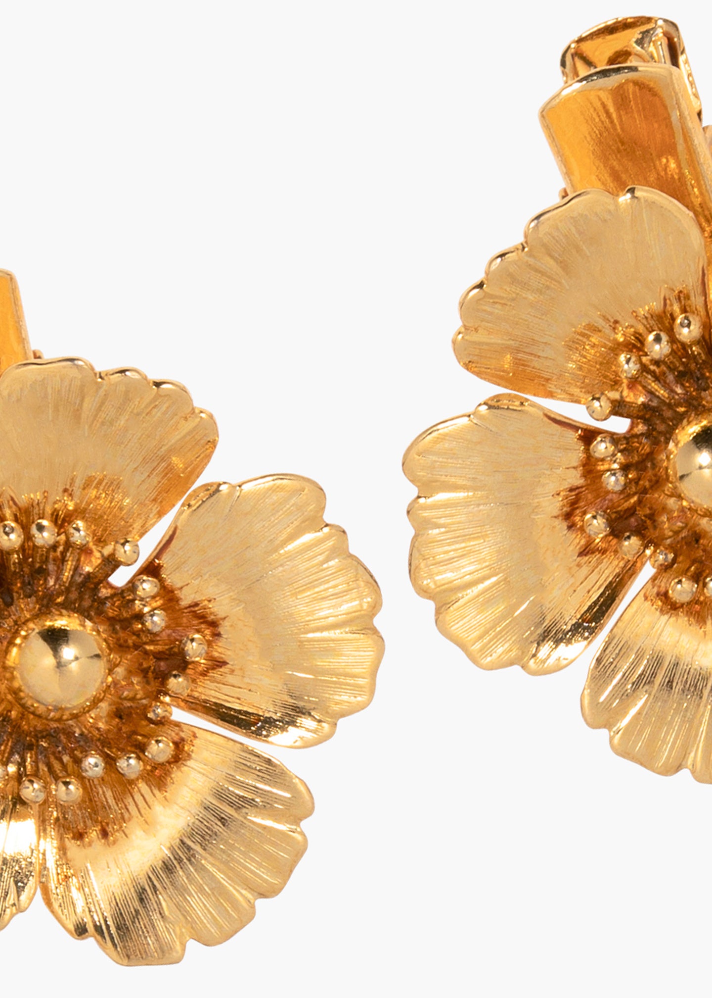 Featuring naturalistic flowers, the Collette Hair Clips set of two delivers effortless style. Crafted by hand with a lightweight gold stamping, thoughtful details, like three-dimensional stamen, contribute to a lifelike look. Each is plated with 18-karat gold and finished with an alligator clip for secure placement in the hair, and can be layered with multiple sets worn at once, and mixed with our Papillon Hair Clips set of two. Dimensions: 1 inch length, 1 inch width, 1 1/8 inch clip length