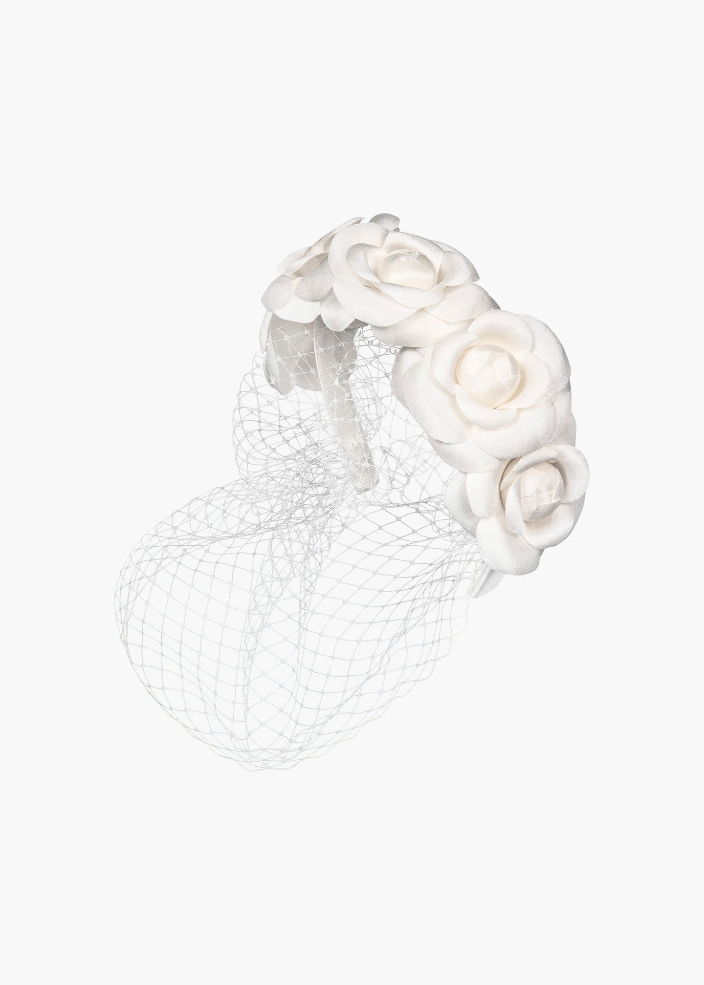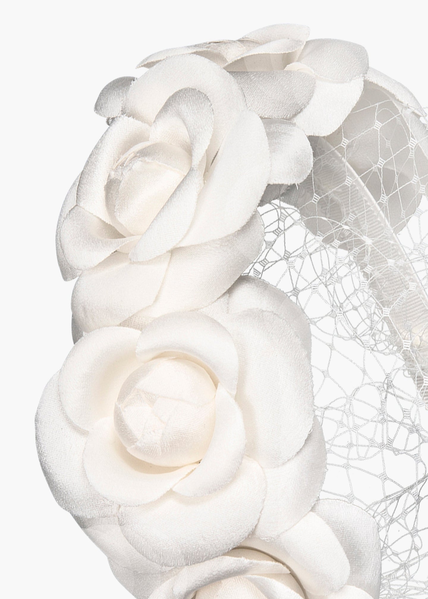 One of our most romantic styles yet, the Eden Voilette Headband was made for your special day. Our classic headband base is lined with silk rosettes. Each rosette is sculpted from silk,rendered with such lifelike precision that they feel like real blooms. For even more drama, we finished this style with a delicate voilette to add a sense of mystery. Discover more veiling options for sheer elegance.