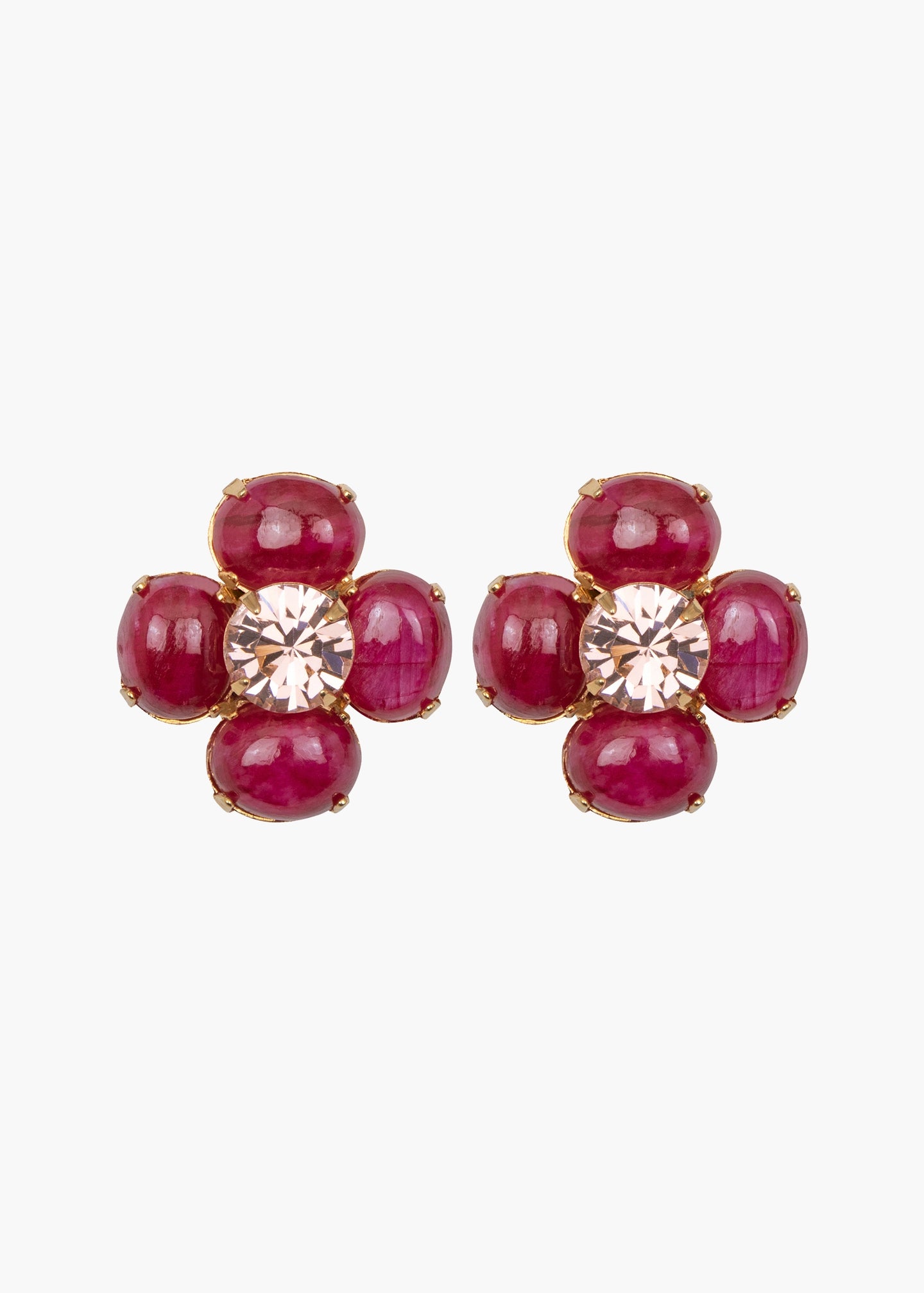Inspired by 1960s mod florals, the Quinn Earrings are a delicious pop of color, flaunting the vivid hues of semi-precious stones like pink opal, blue agate, and red garnet. Made by hand in New York, the bubble-flower shape is achieved using cabochon gemstones for petals, with a fine Austrian crystal in the center. The stud is complete with an 18-karat gold-plated setting. Dimensions: 1"