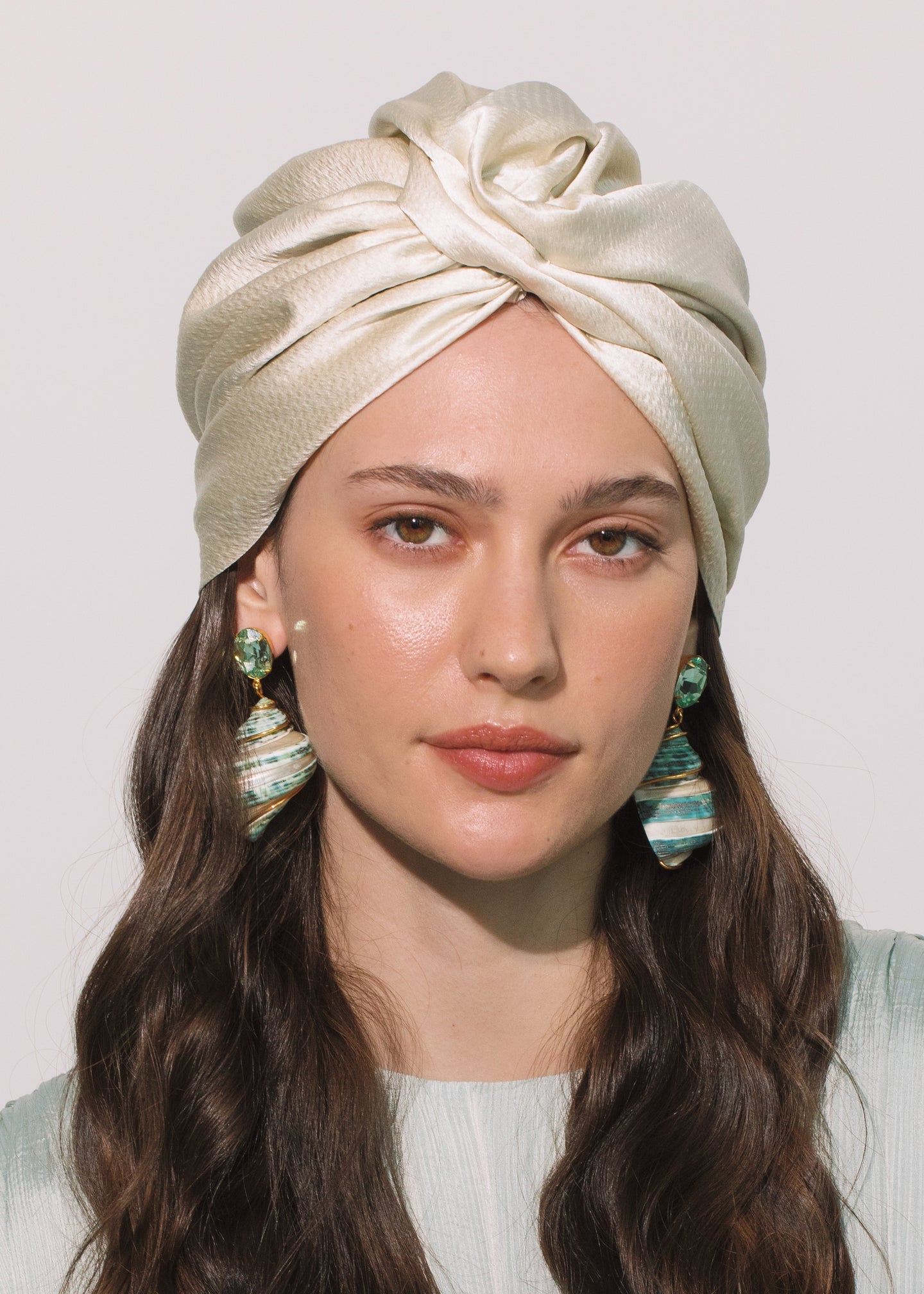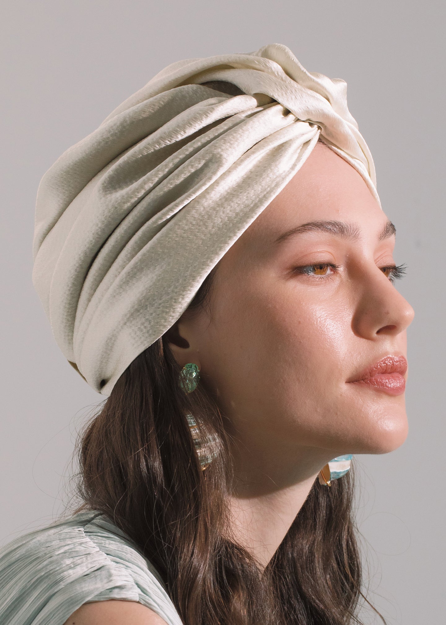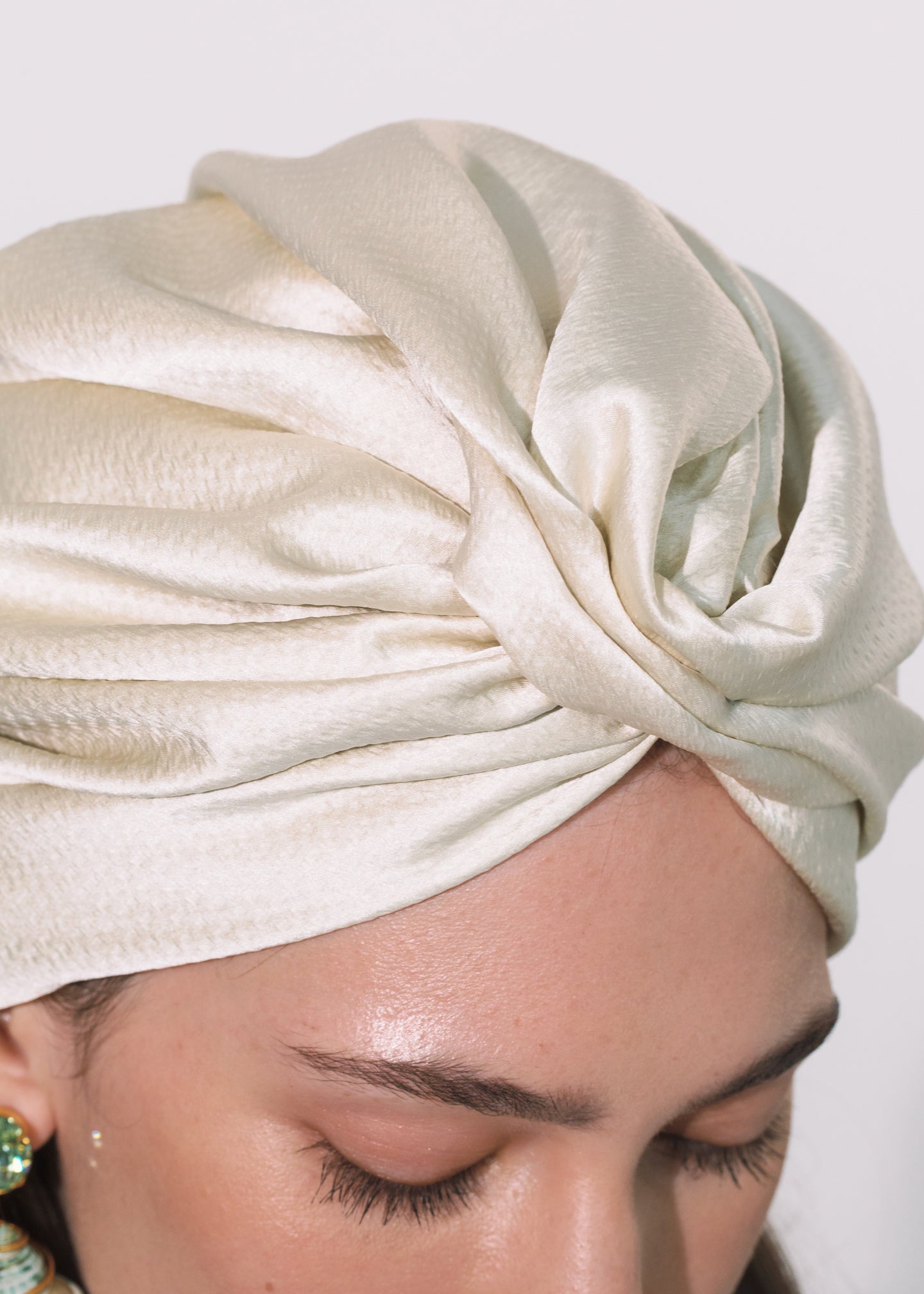 The Caracas Turban is made by hand in New York from hammered silk satin. We recommend storing turbans in their dust bag while not in use. Avoid contact with water, perfume, and other chemicals, including hairspray, which should be used only before placement in the hair.