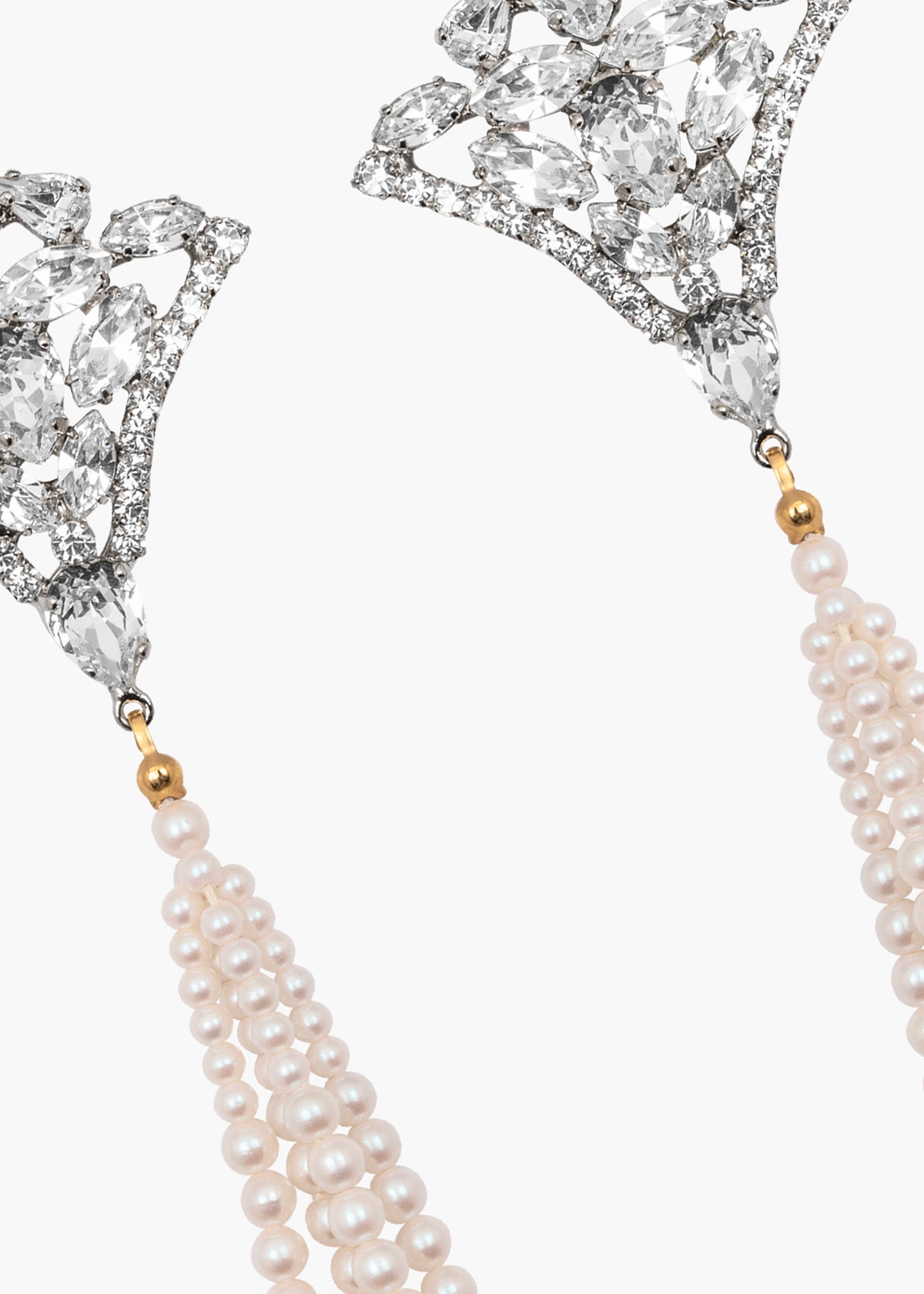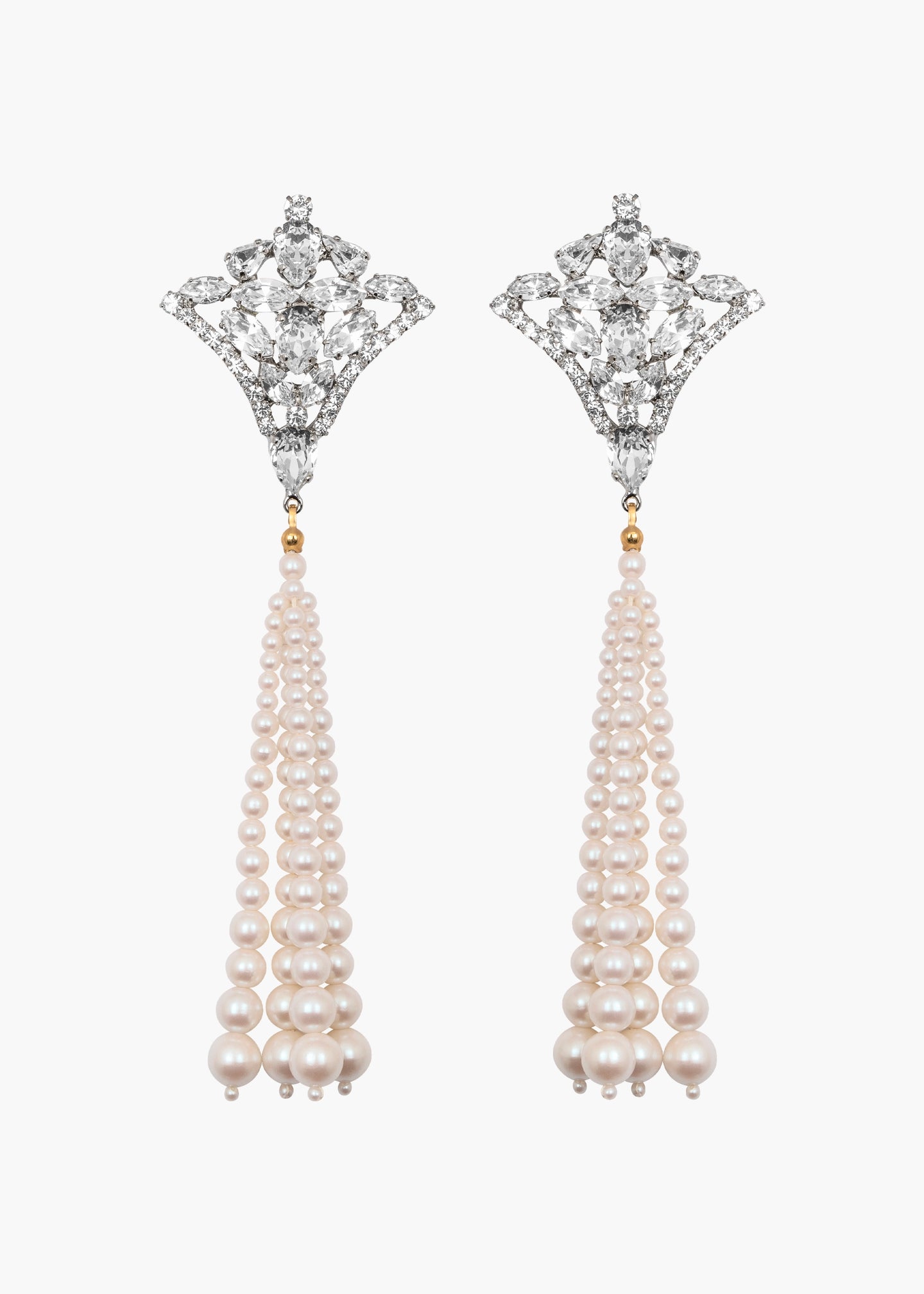 A daring statement, the Mildred Earrings are inspired by antique fans, with rich, crystal-encrusted detail. The sprawling motif is composed of Austrian crystals in a variety of cuts, positioned to draw the eye in. They are finished an impressive vintage 1970s Japanese pearl tassel, specifically sourced for its incredible movement and quality. Dimensions: 5.25" length