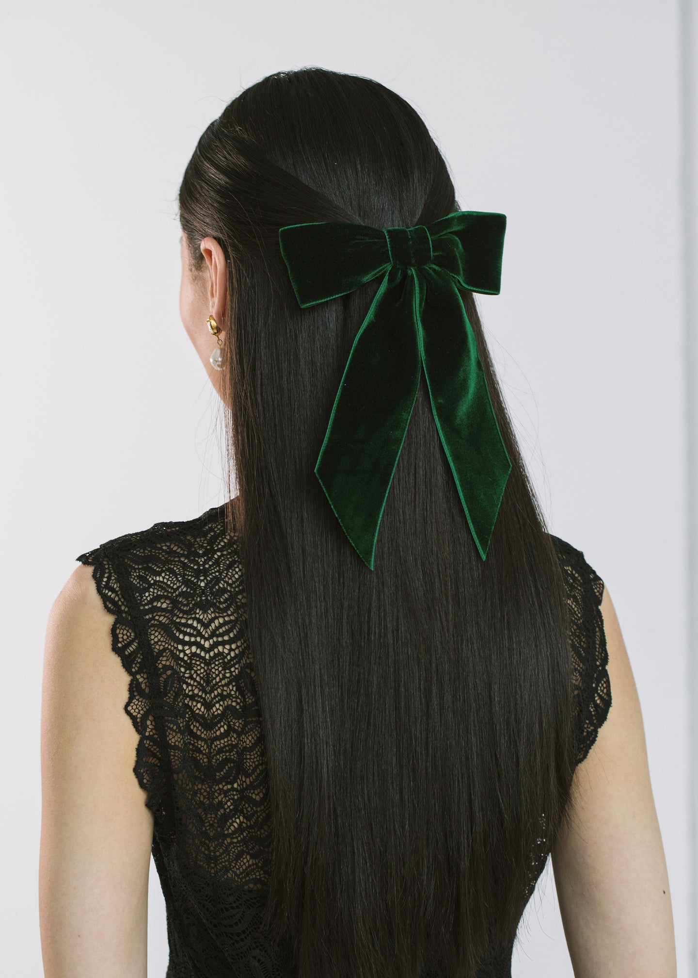 The Wide Velvet Bow Barrette is made by hand in New York of velvet ribbon with a steel French barrette closure. We recommend treating this bow as you would a piece of jewelry, and storing in the dust bag when not in use. Avoid contact with water, perfume, and other chemicals, including hairspray, which should be used before placement in the hair.