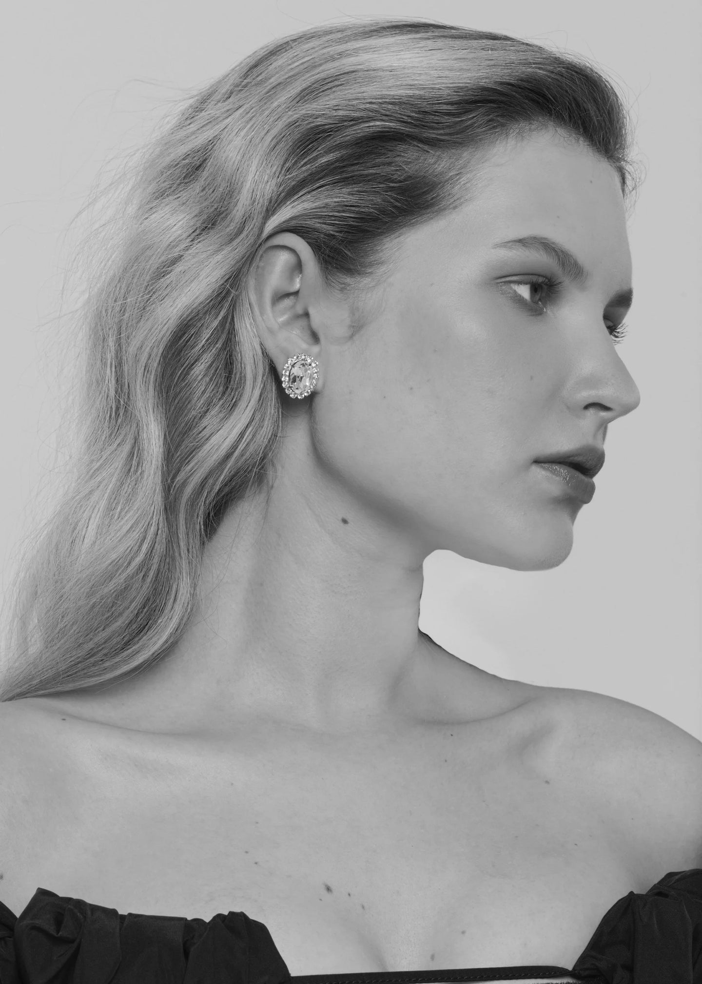 The Clara Earrings are made by hand in New York from rhodium plated brass and crystal. They have a surgical-steel post, are nickel-free, and safe for sensitive skin. We recommend storing earrings in their dust bag while not in use, and avoiding contact with water, perfume, hairspray, and other chemicals.