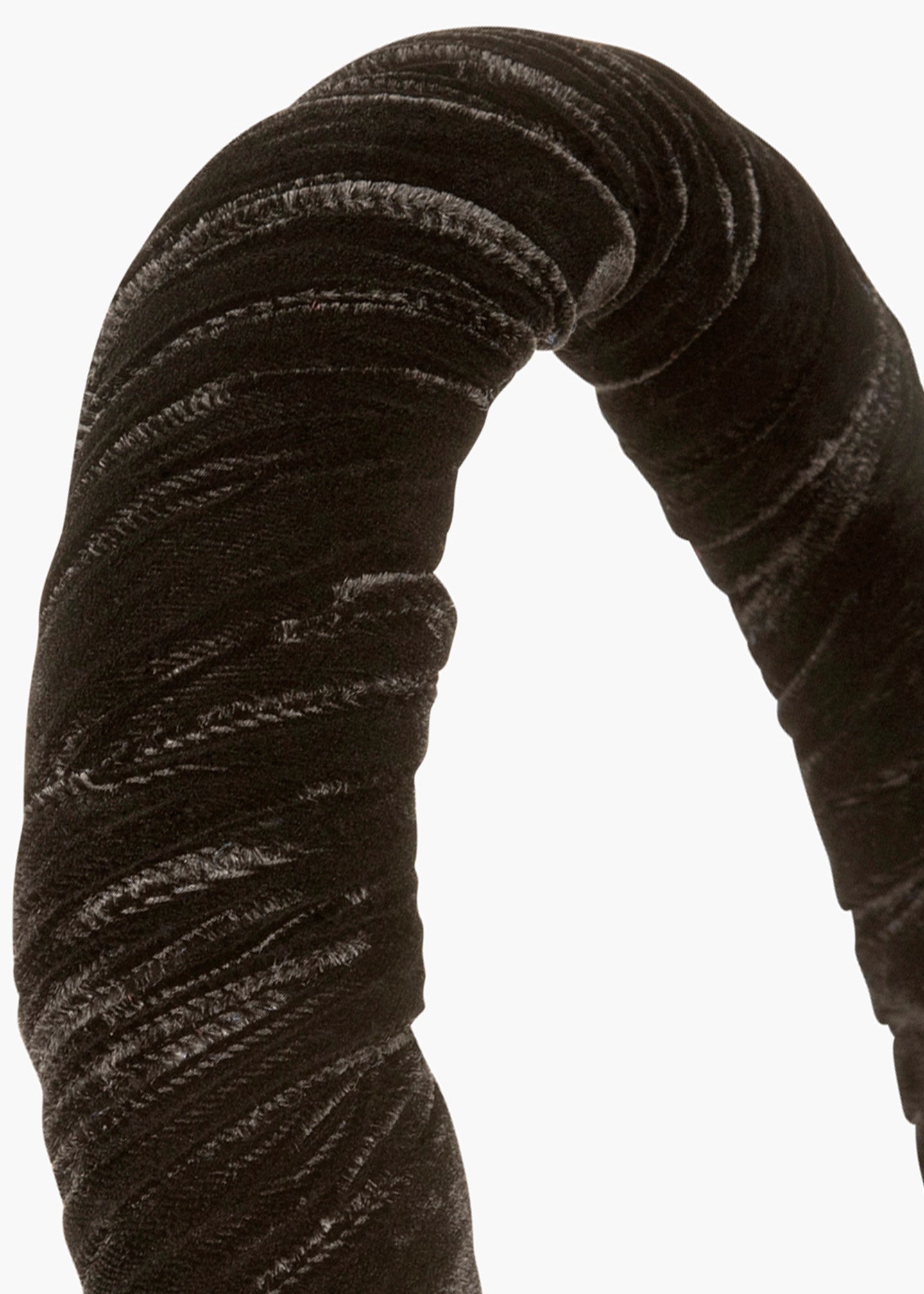 The Irene Headband in Velvet was born of our desire to create a modern, wearable interpretation of antique crowns that have long captured our imagination. Made by hand in New York, silk velvet ribbon is spiral-draped around the padded headband base. Its height highlights the lush texture and fine quality of the silk velvet.