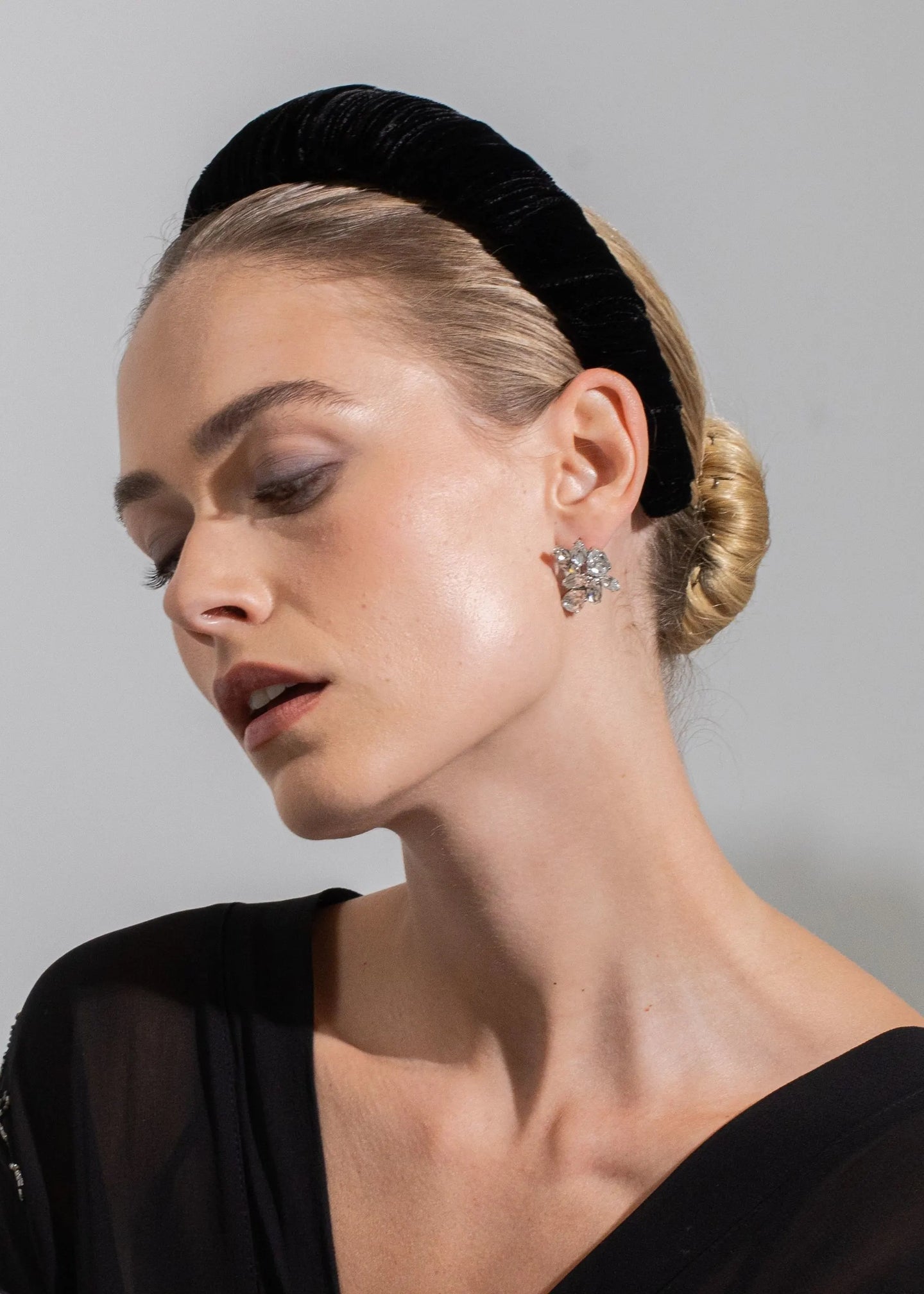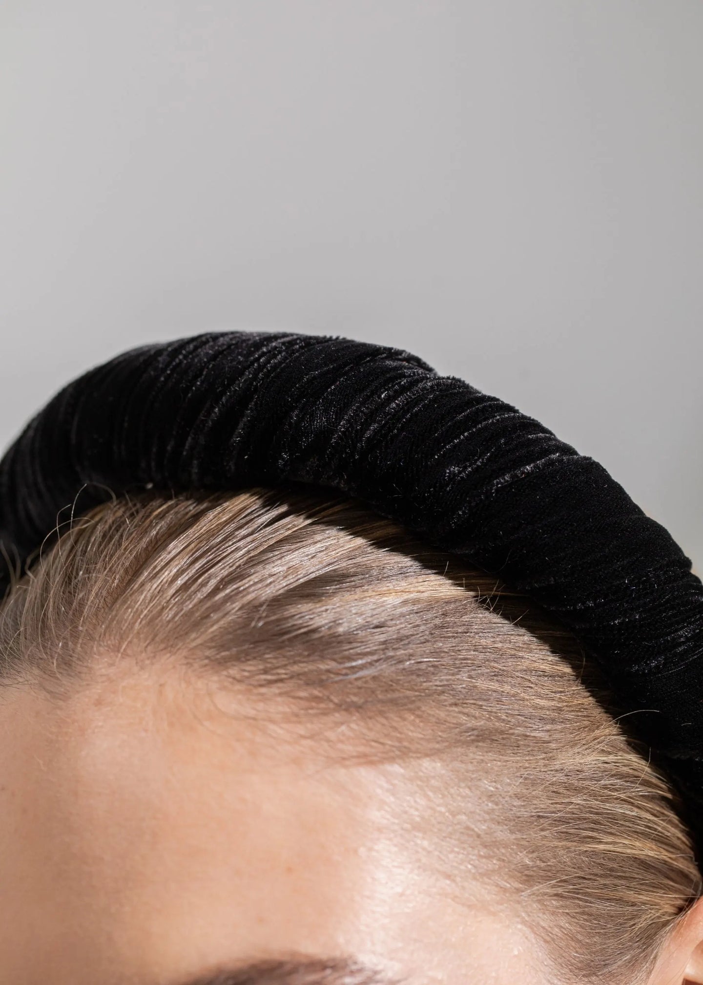 The Irene headband is crafted in New York from hand-draped silk velvet, promoting hair health. We recommend storing headbands in their dust bag while not in use. Avoid contact with water, perfume, and other chemicals, including hairspray, which should be used only before placement in the hair.